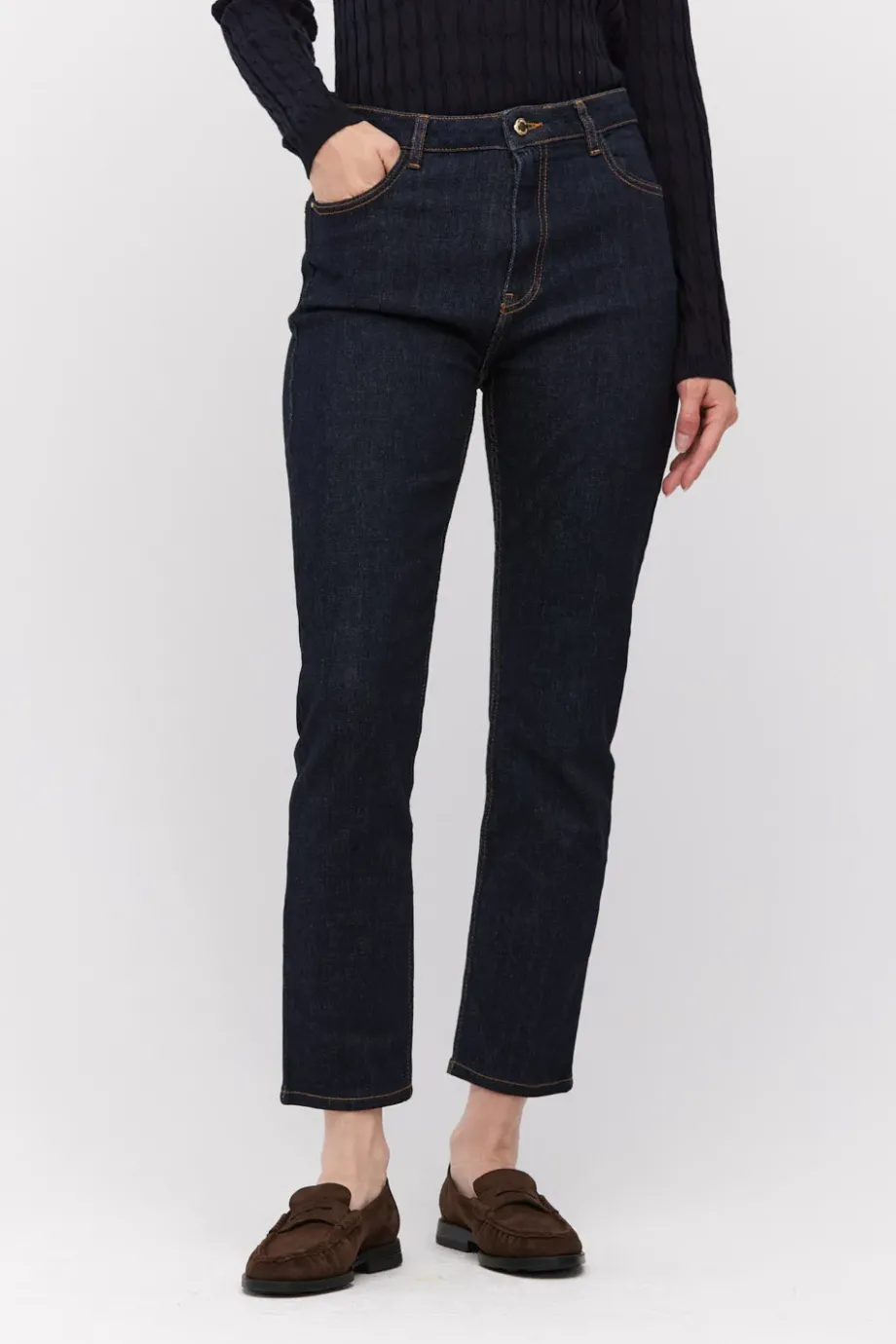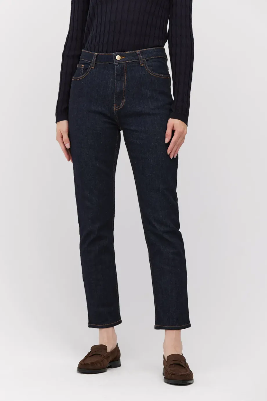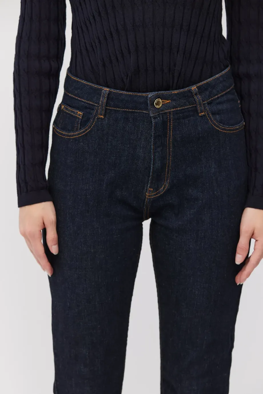 Blugi drepți, croială clasică cu cinci buzunare. Talie înaltă. Închidere cu fermoar și nasture metalic. Confecționați din bumbac cu elastan — confortabili și moi. Culoare: albastru royal închis.