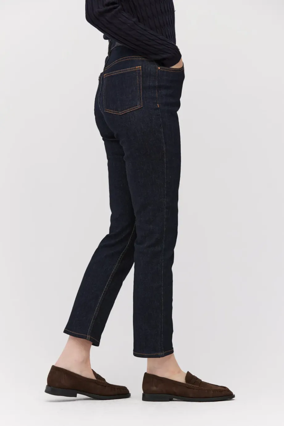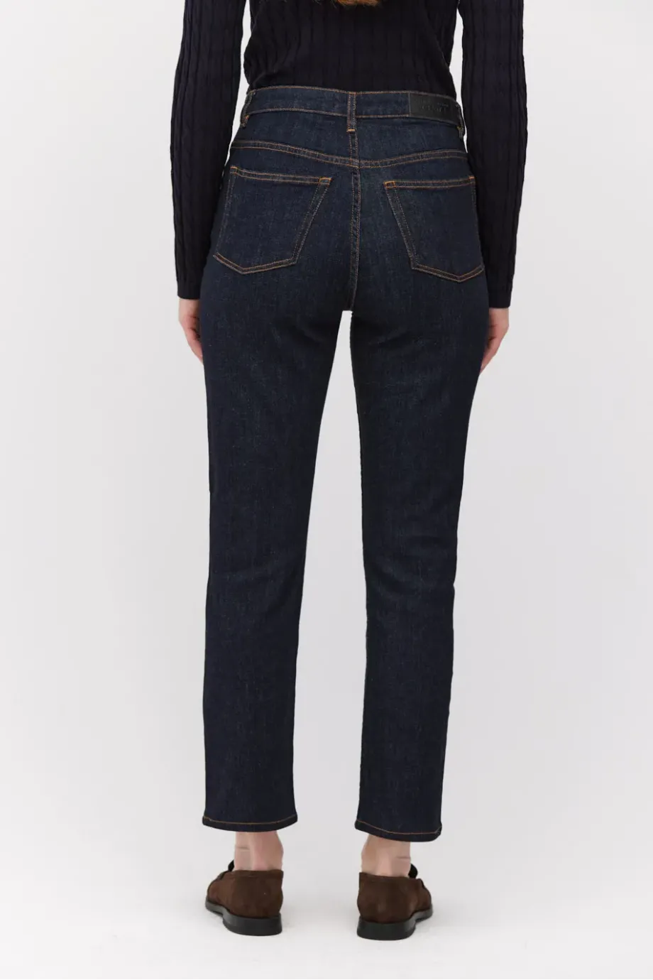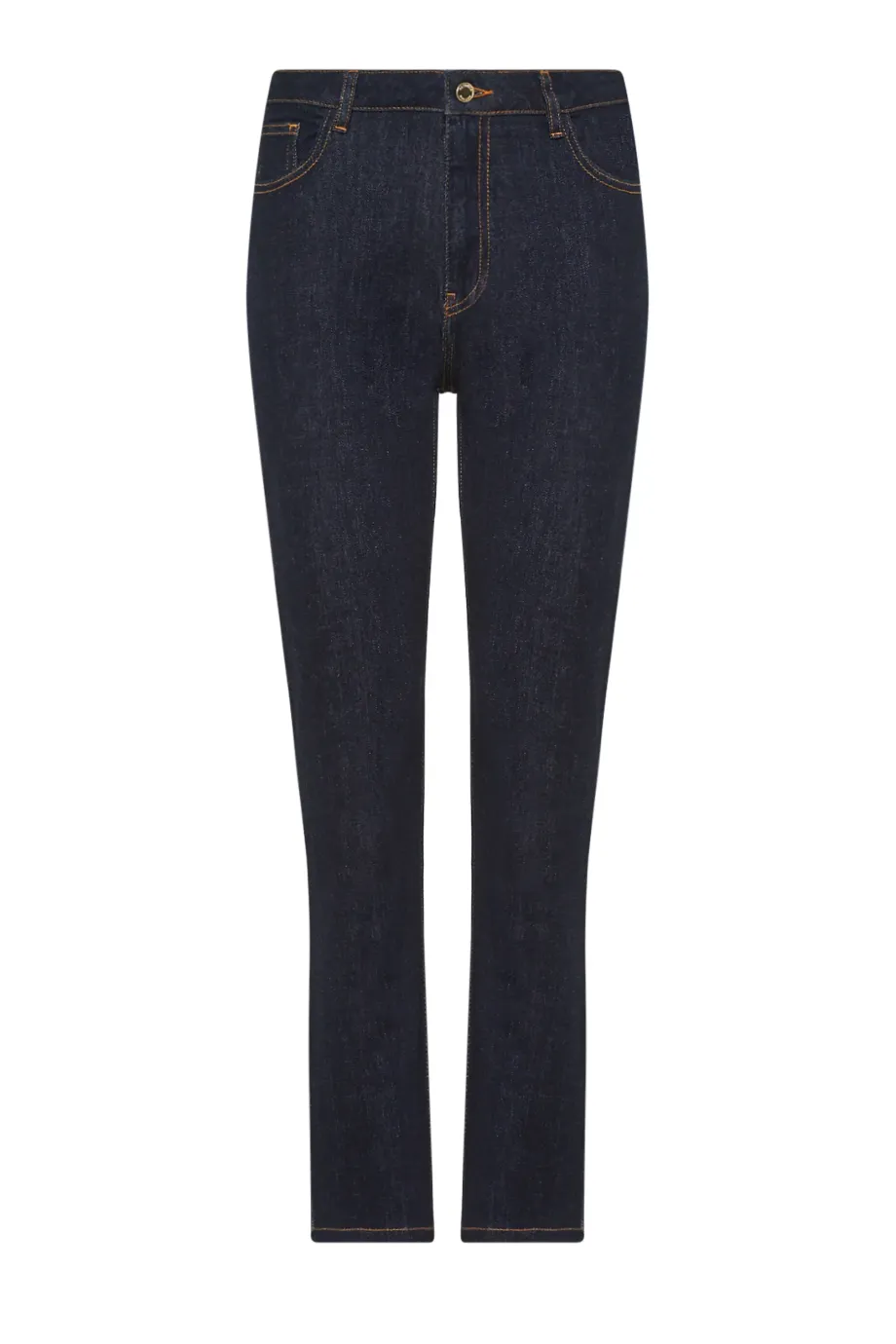 Blugi drepți, croială clasică cu cinci buzunare. Talie înaltă. Închidere cu fermoar și nasture metalic. Confecționați din bumbac cu elastan — confortabili și moi. Culoare: albastru royal închis.