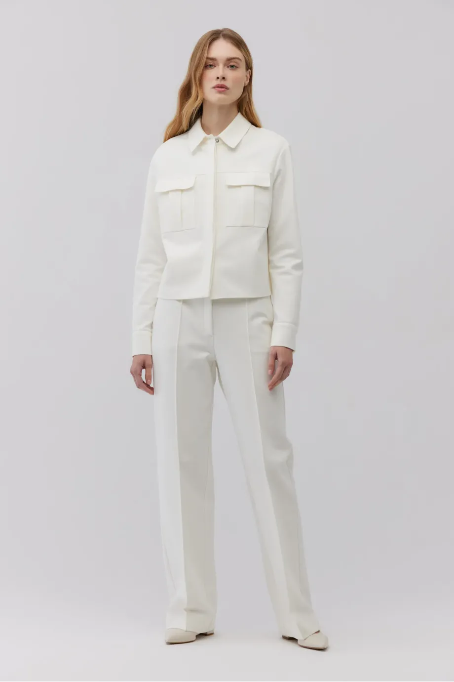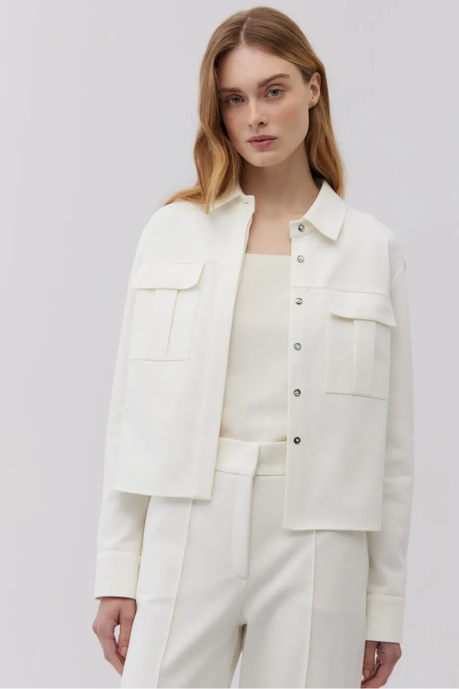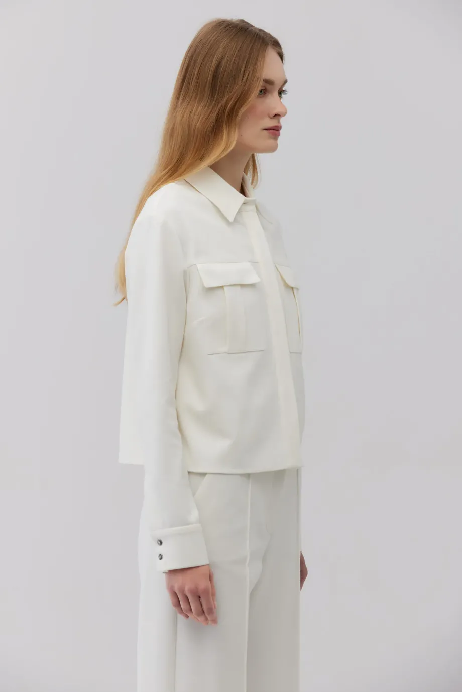 Jachetă tip cămașă, albă. Croială dreaptă, ușor "boxy". Buzunare cu clapetă. Închidere cu capse. Pantaloni asortați disponibili.