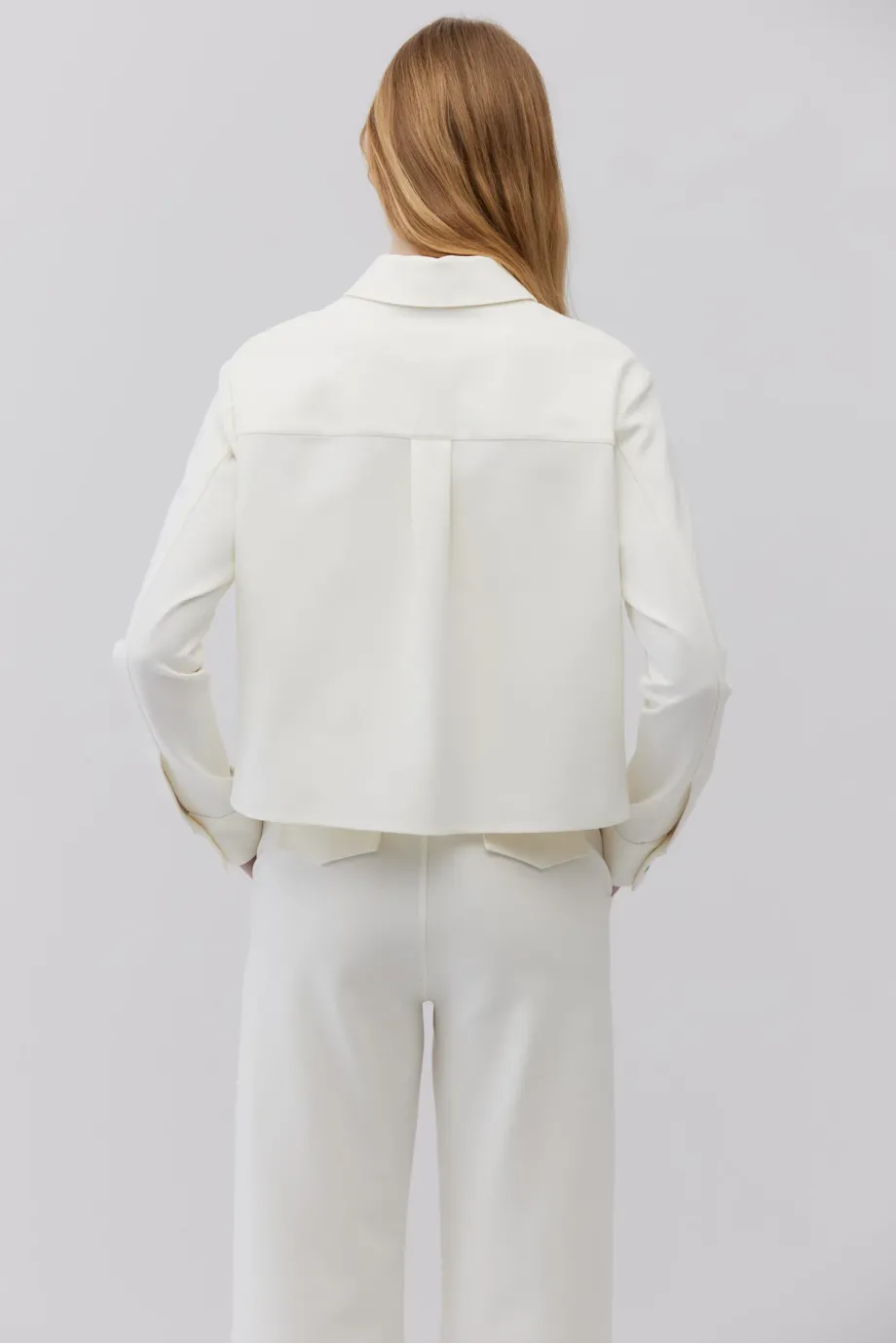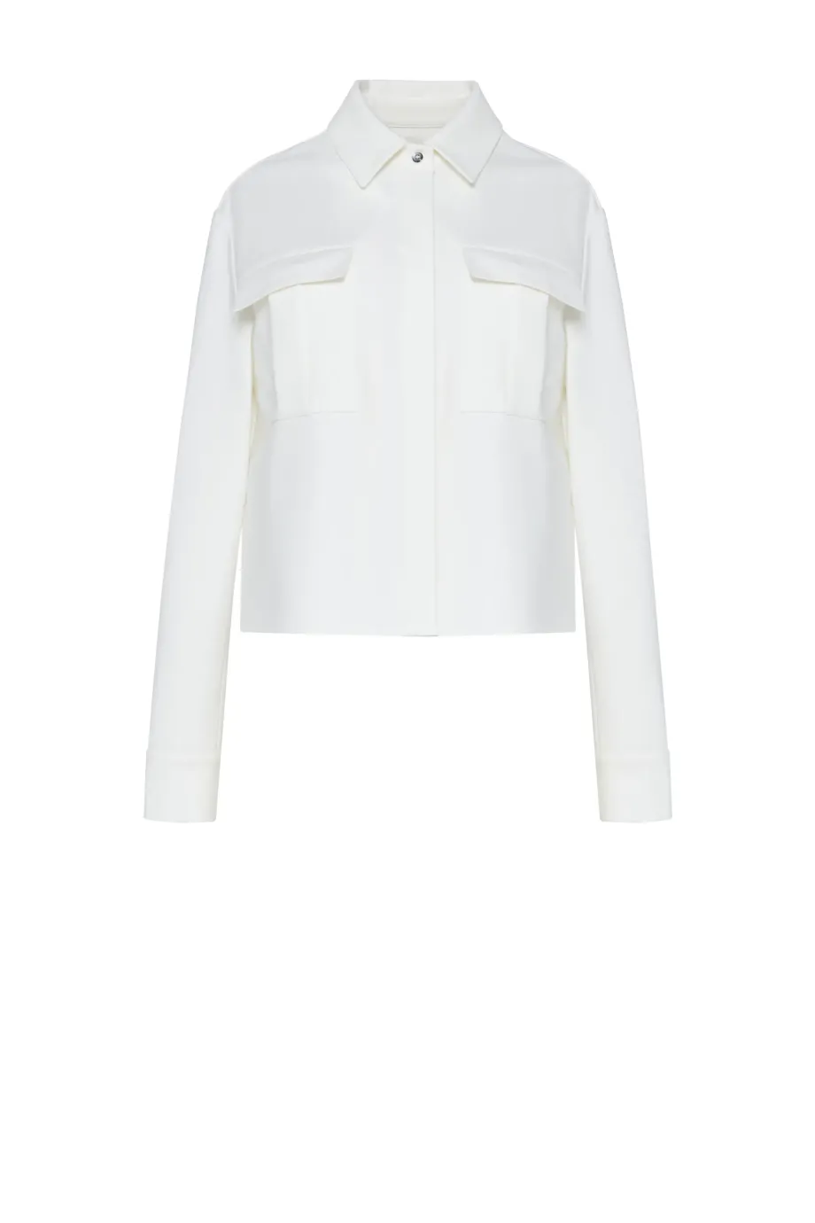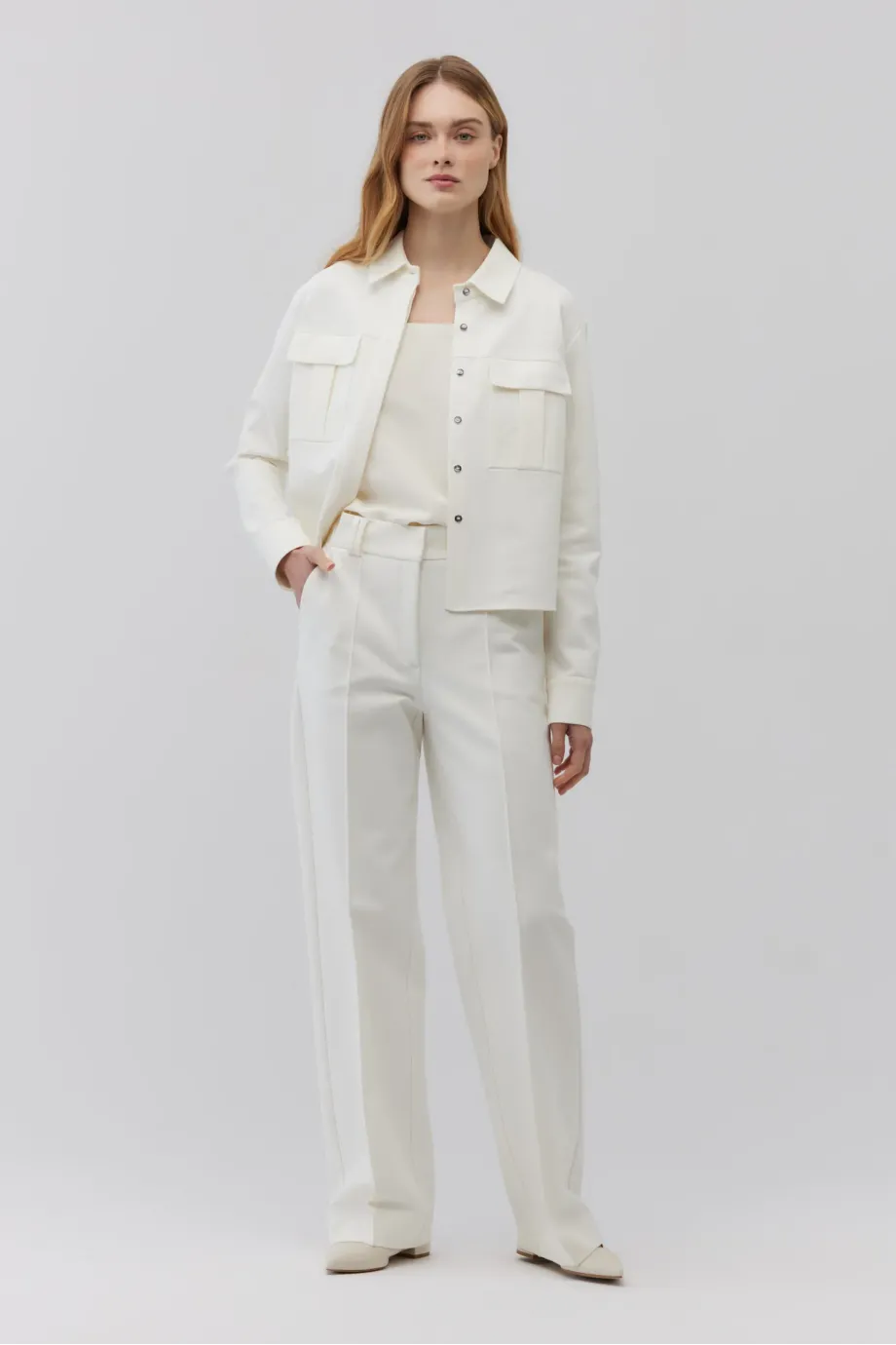 Jachetă tip cămașă, albă. Croială dreaptă, ușor "boxy". Buzunare cu clapetă. Închidere cu capse. Pantaloni asortați disponibili.