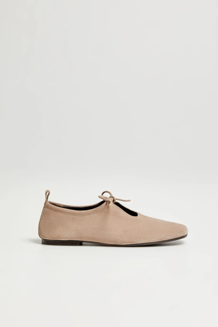 Piele velurată naturală, moale. Model cu șiret, pe talpă plată. Culoare bej. Disponibil pe roșu. Confecționați manual într-o manufactură spaniolă.