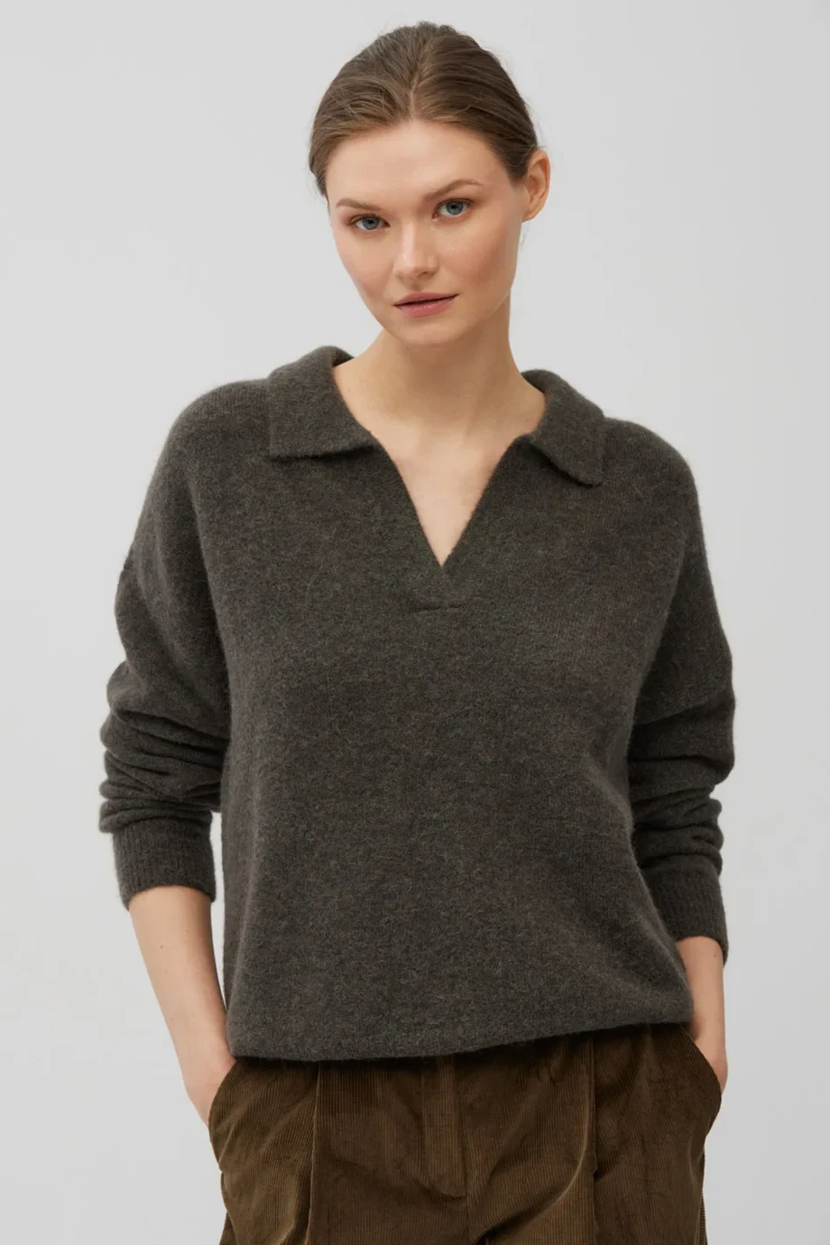 Croială scurtă, cu mâneci lungi și decolteu în V. Tricot single-jersey confecționat pe mașină 7 GG. Tricot moale cu lână de alpaca. Culoare maro prăfuit.