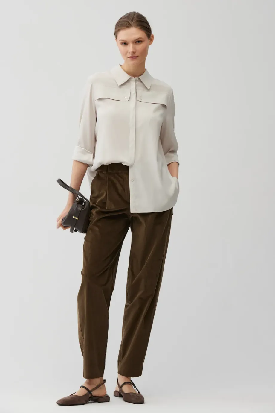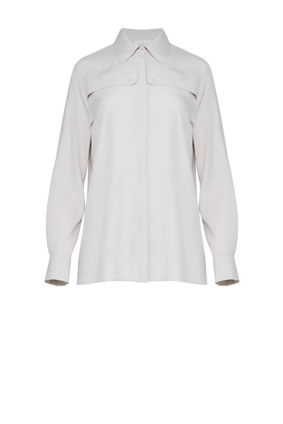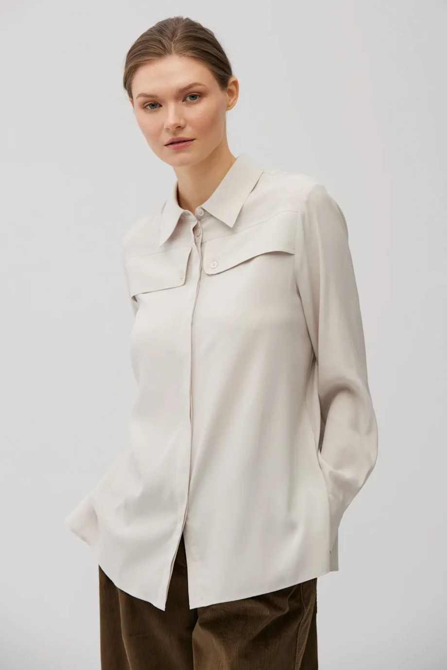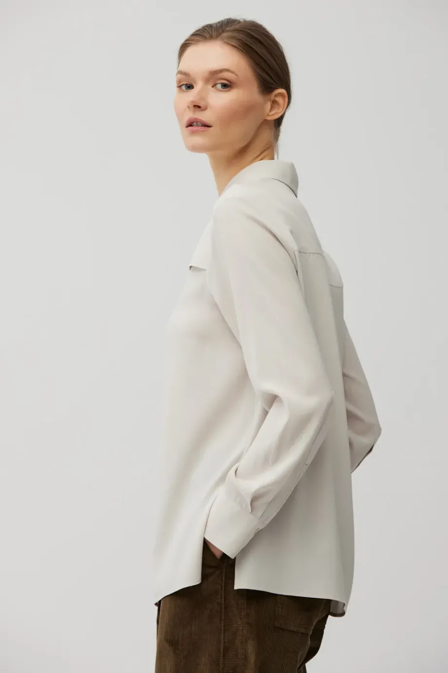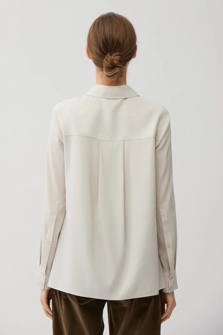Cămașă din mătase, cu croială lejeră. Guler clasic. Mâneci lungi cu manșete. Închidere cu nasturi. Culoare bej.