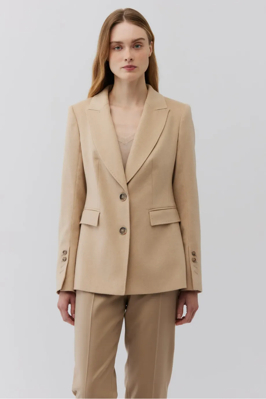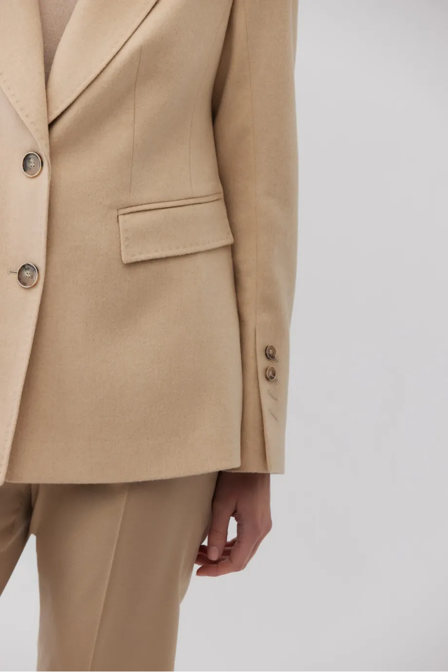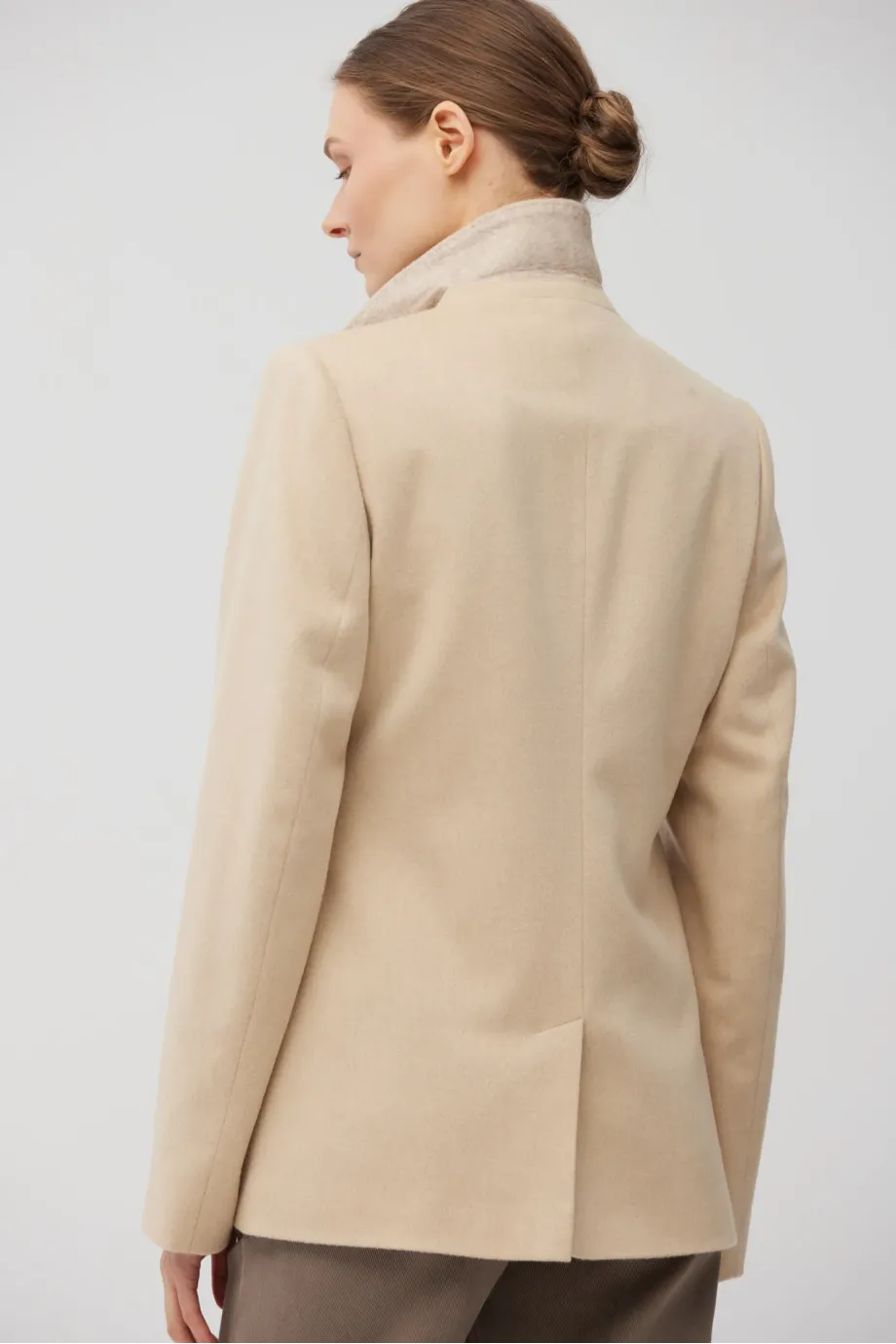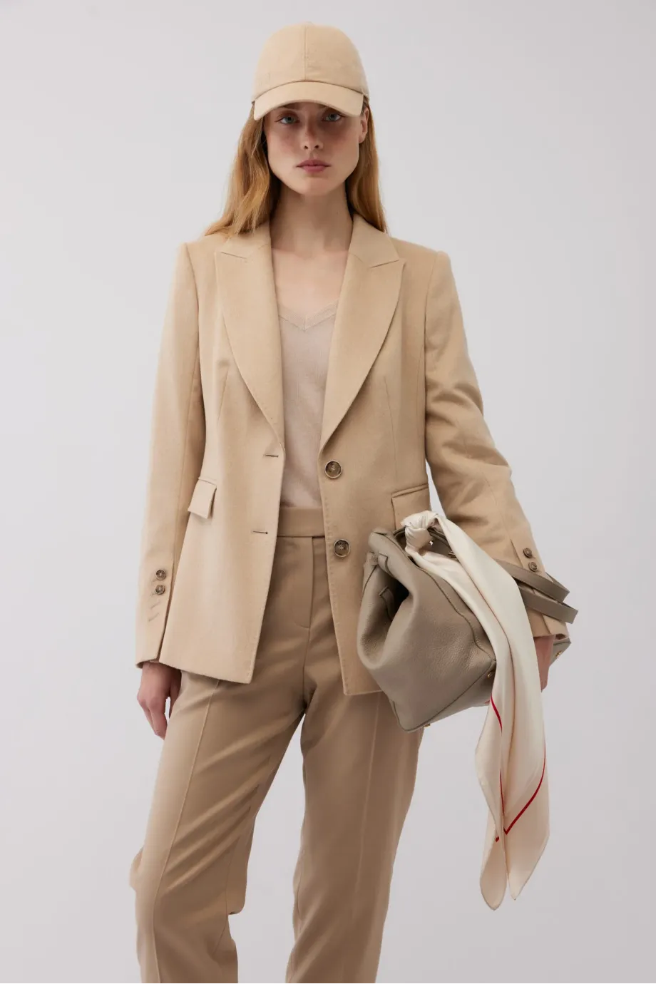 Sacou cambrat din lână de cămilă. Nuanță de bej "albinos" – extrem de rară și elegantă. Închidere frontală cu doi nasturi, croială cu un singur rând de nasturi. Guler finisat cu pâslă. Cusături decorative și piping. Șliț la spate. Complet căptușită, cu mâneci terminate cu nasturi.