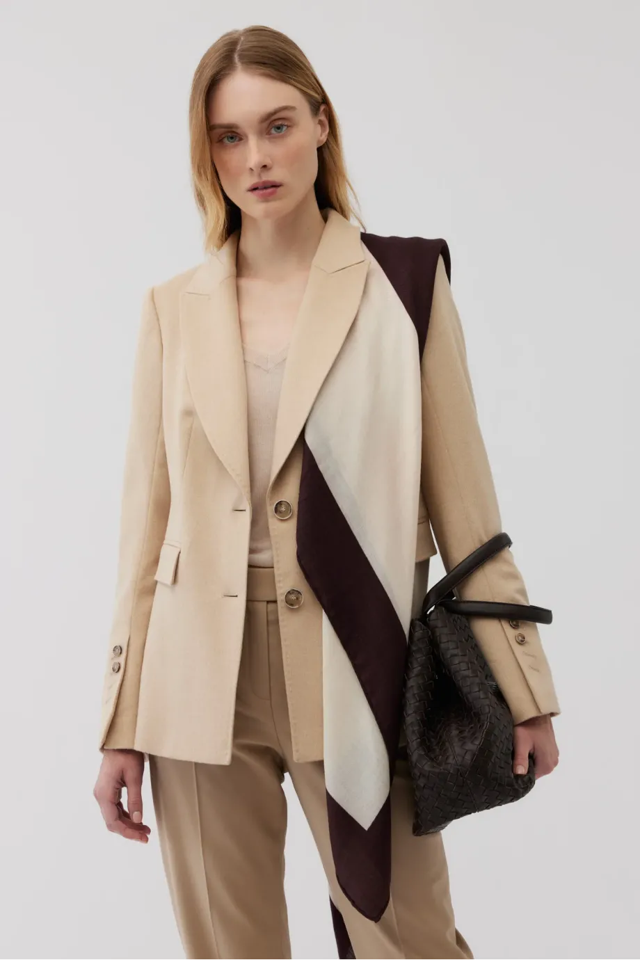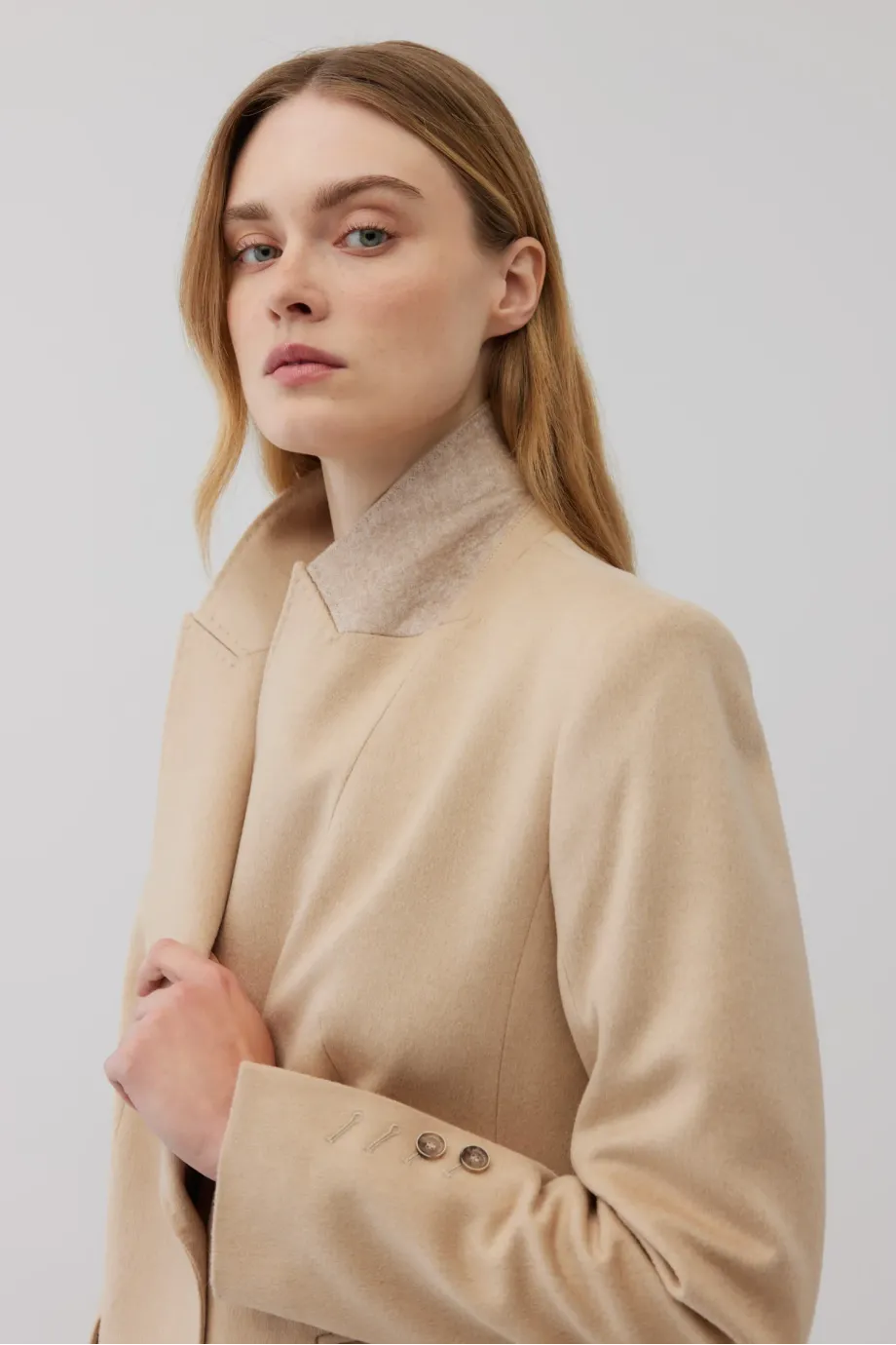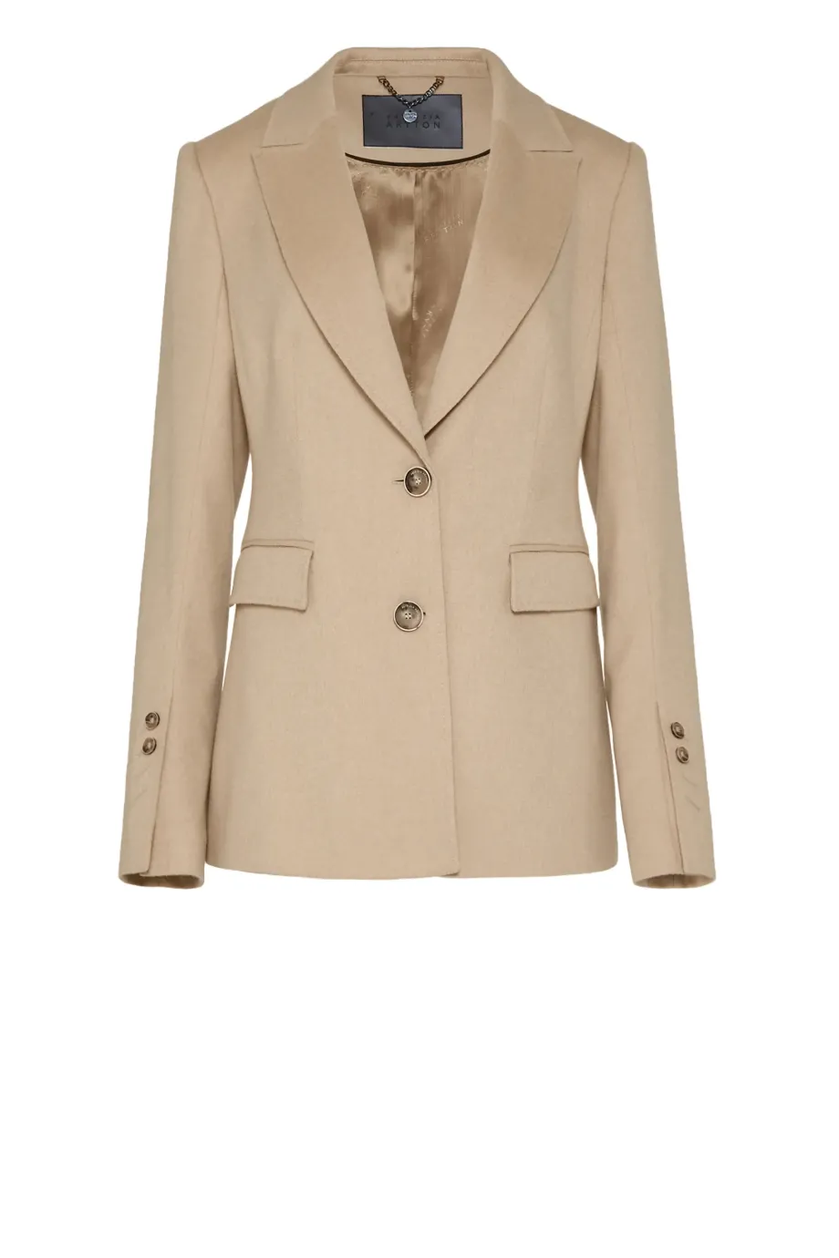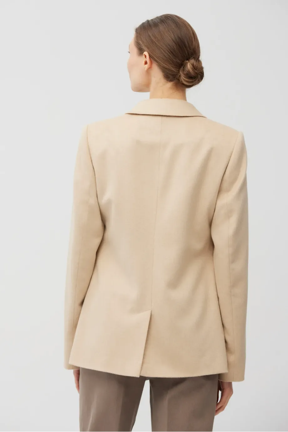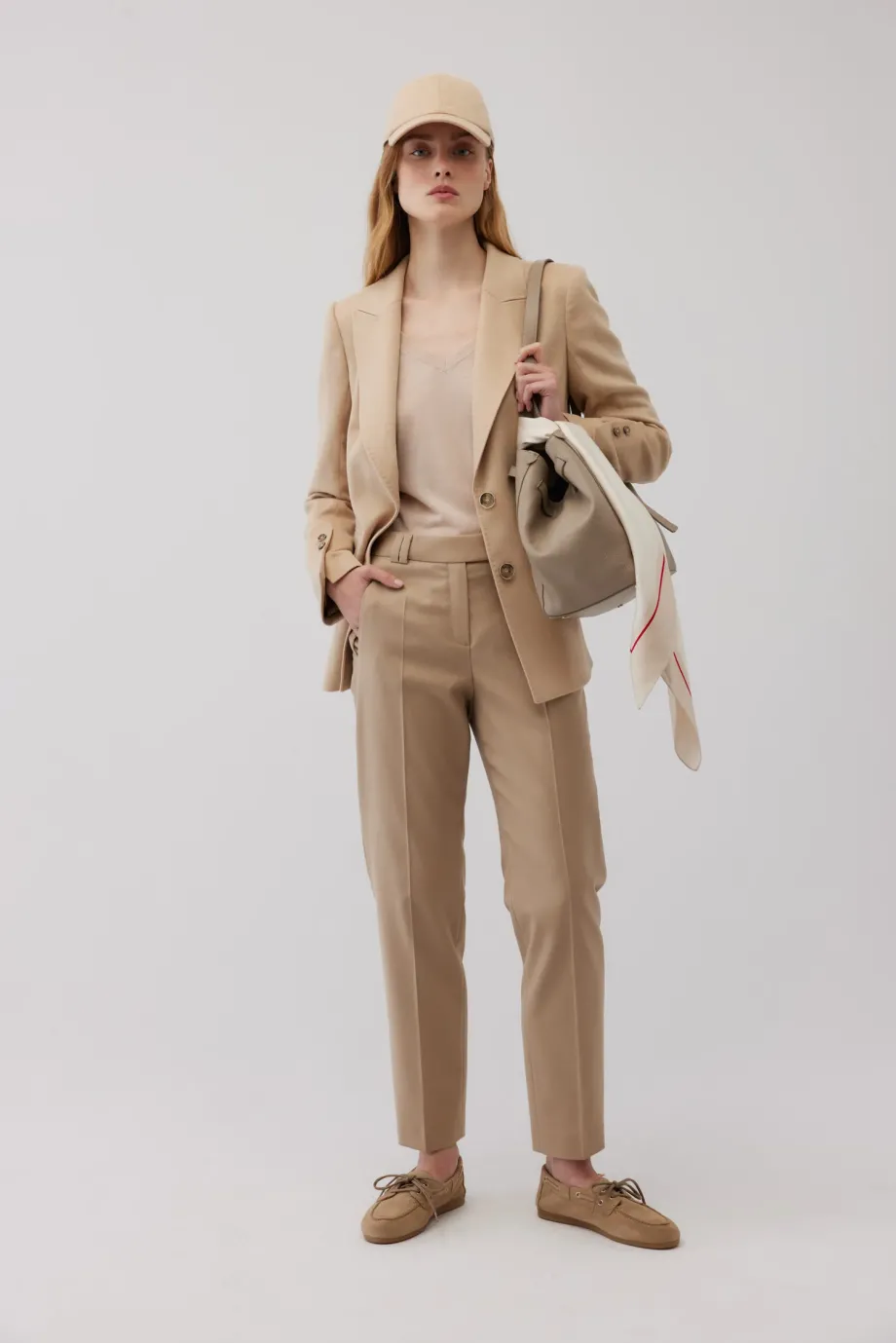 Sacou cambrat din lână de cămilă. Nuanță de bej "albinos" – extrem de rară și elegantă. Închidere frontală cu doi nasturi, croială cu un singur rând de nasturi. Guler finisat cu pâslă. Cusături decorative și piping. Șliț la spate. Complet căptușită, cu mâneci terminate cu nasturi.