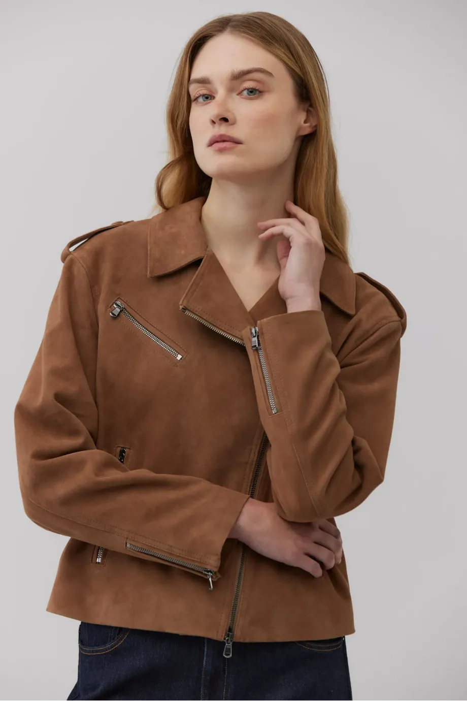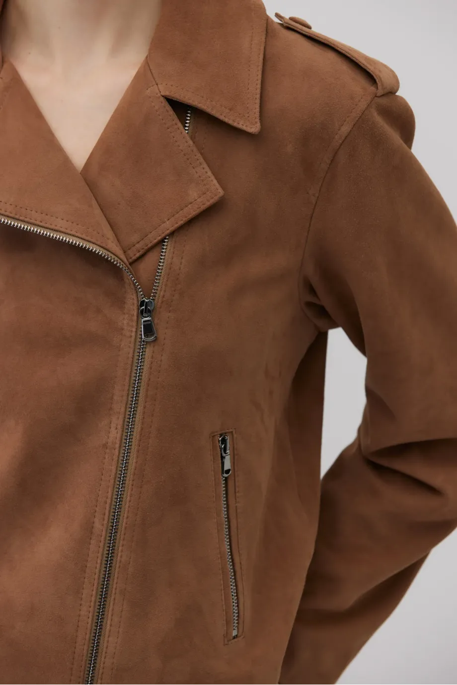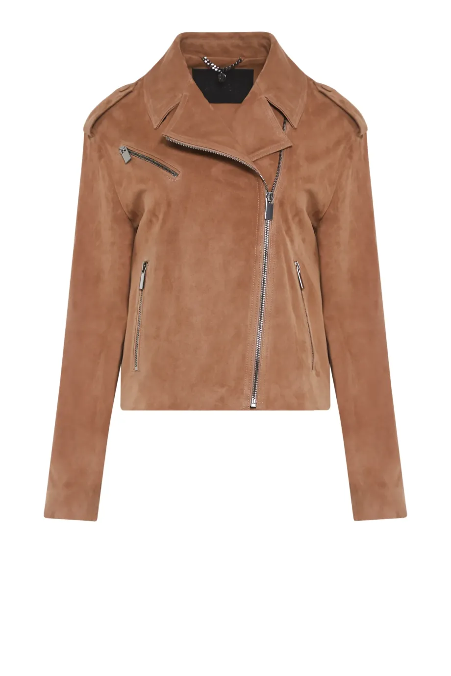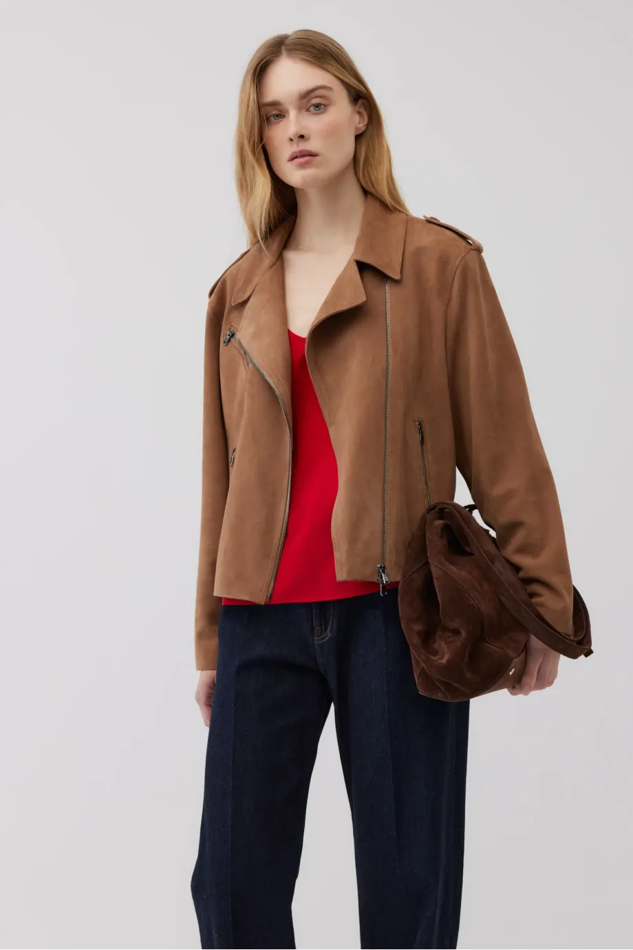 Jachetă scurtă din piele naturală moale, întoarsă. Căptușită. Închidere cu fermoar. Mâneci lungi. Buzunare. Culoare camel.