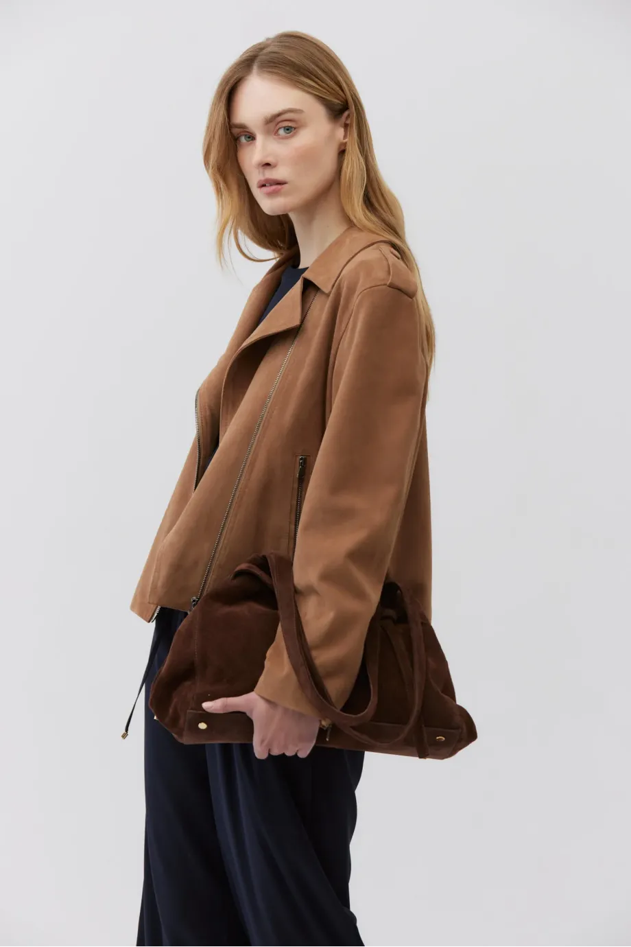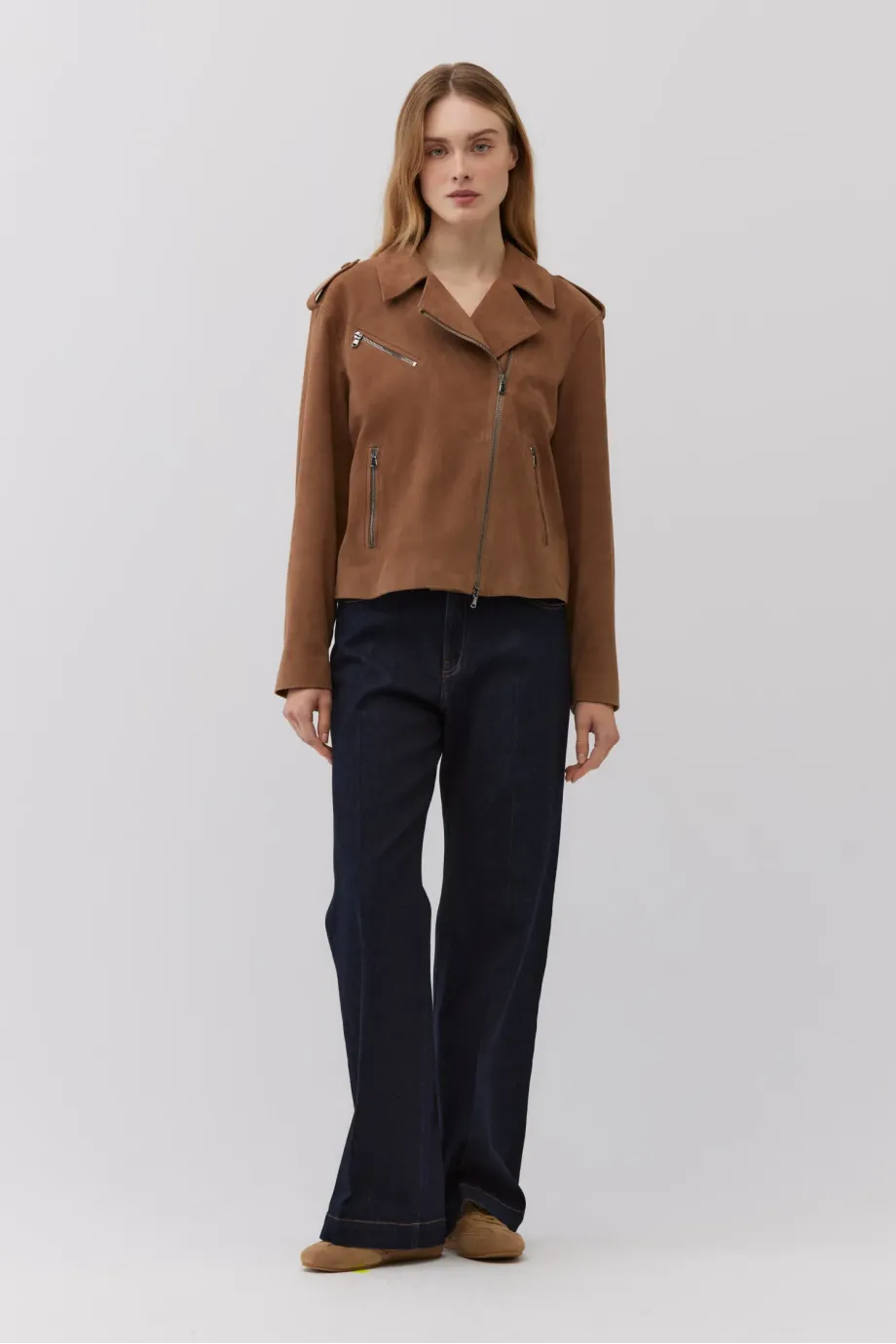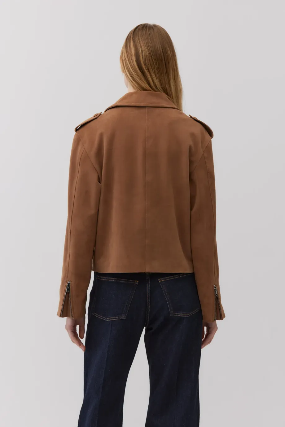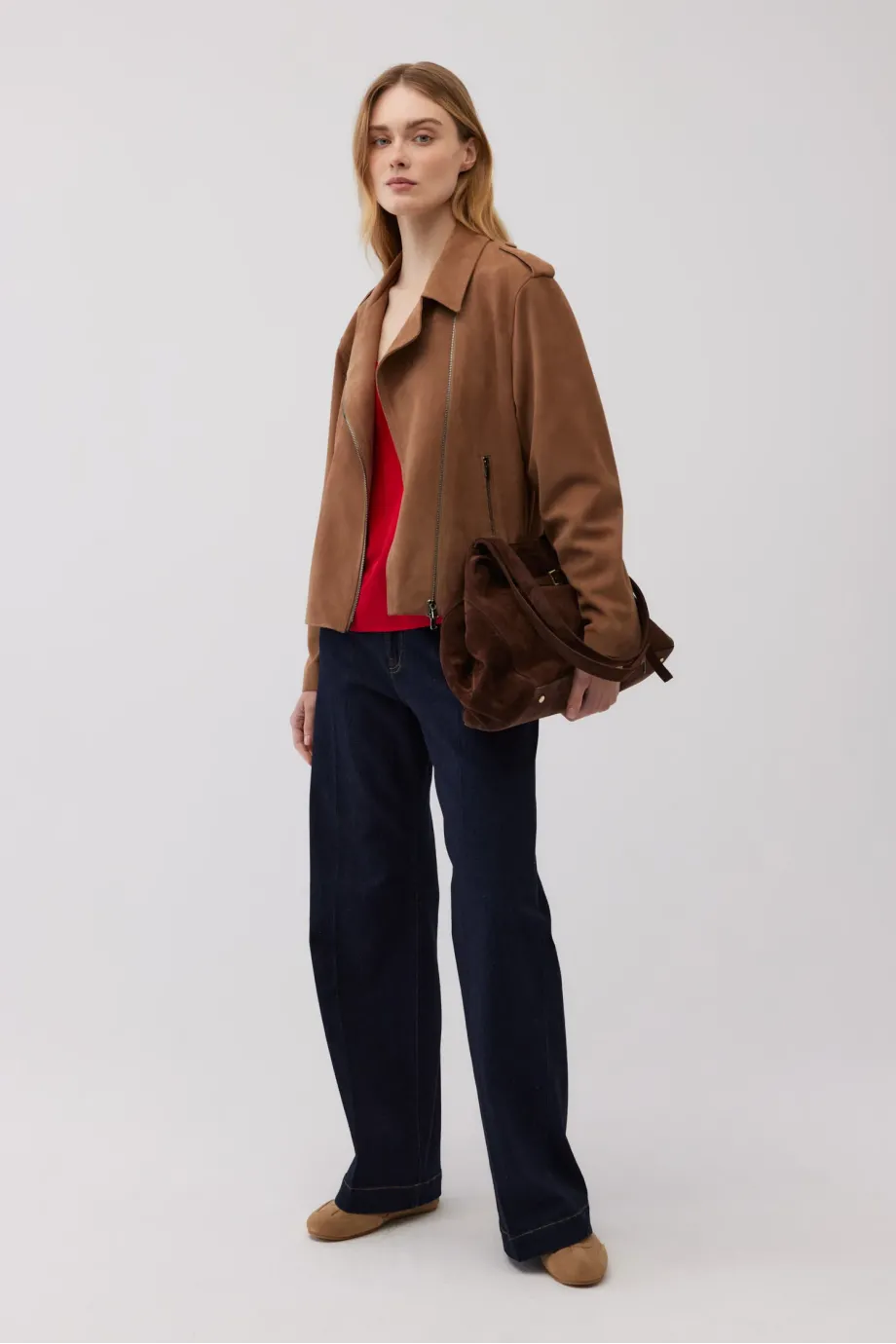 Jachetă scurtă din piele naturală moale, întoarsă. Căptușită. Închidere cu fermoar. Mâneci lungi. Buzunare. Culoare camel.