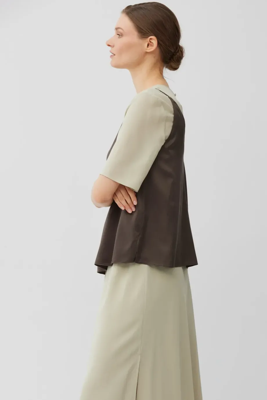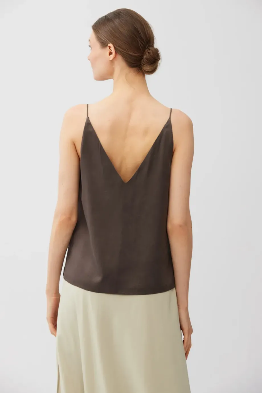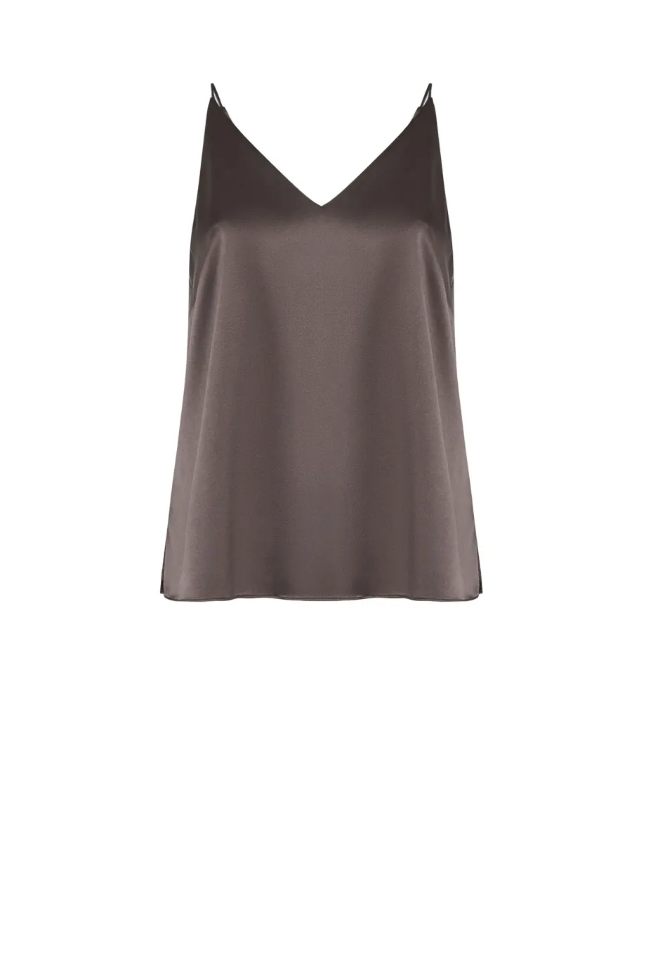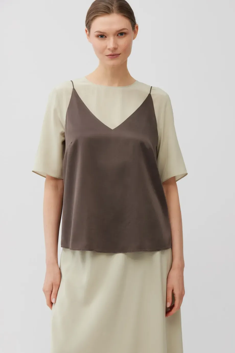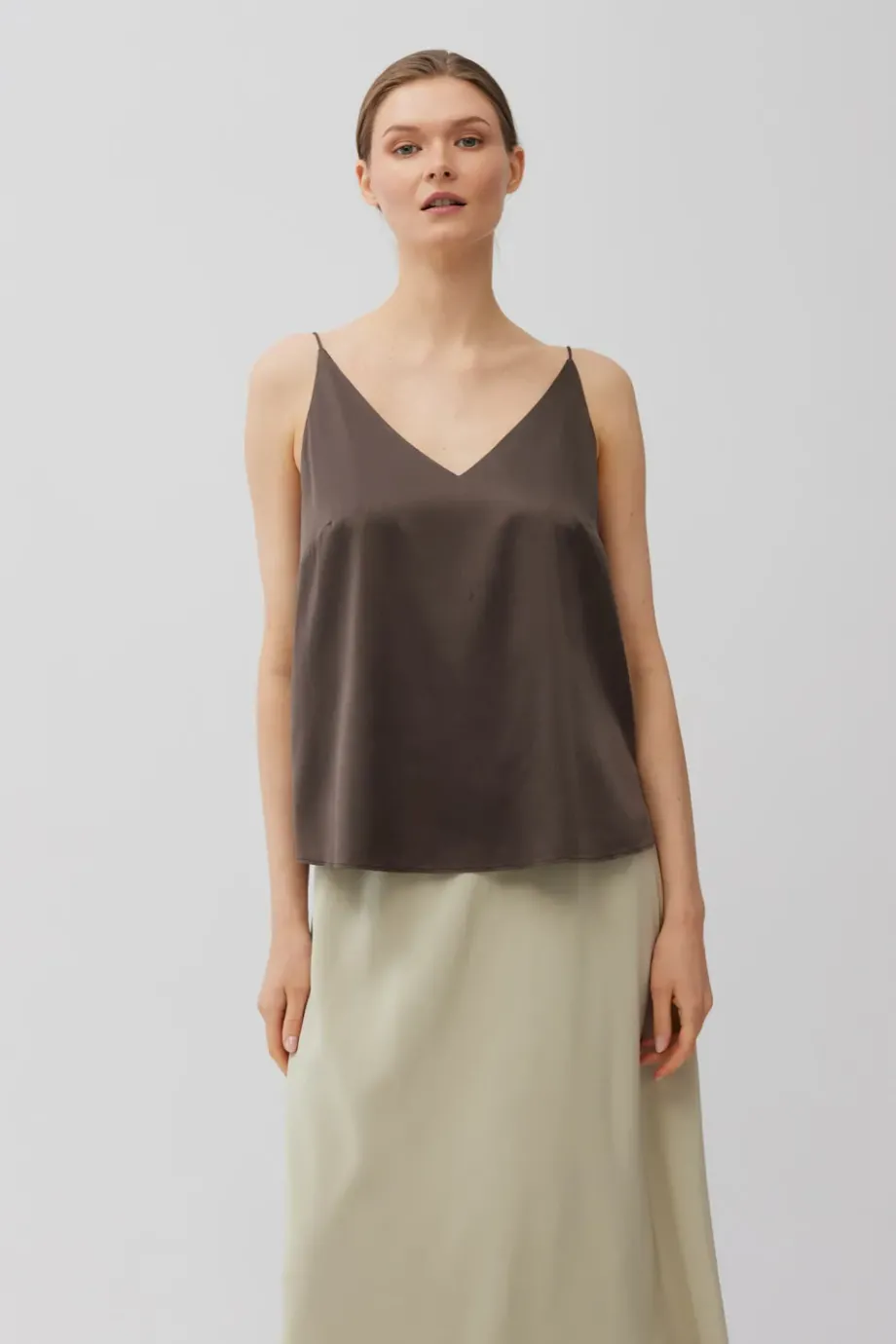 Top din mătase, cu croială lejeră. Decolteu în V. Bretele subțiri. Culoare maro.