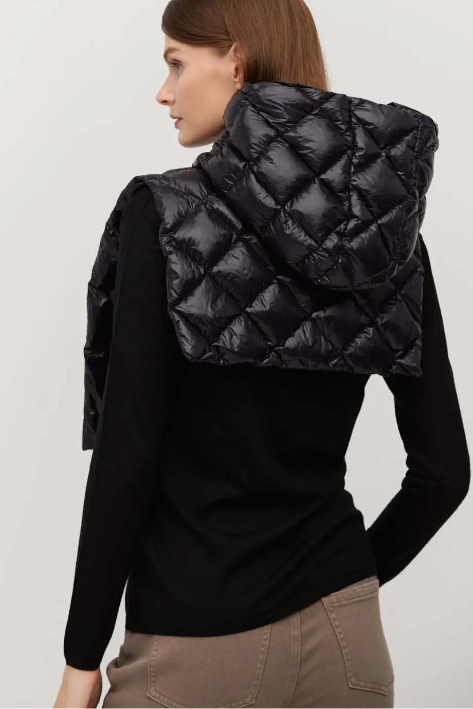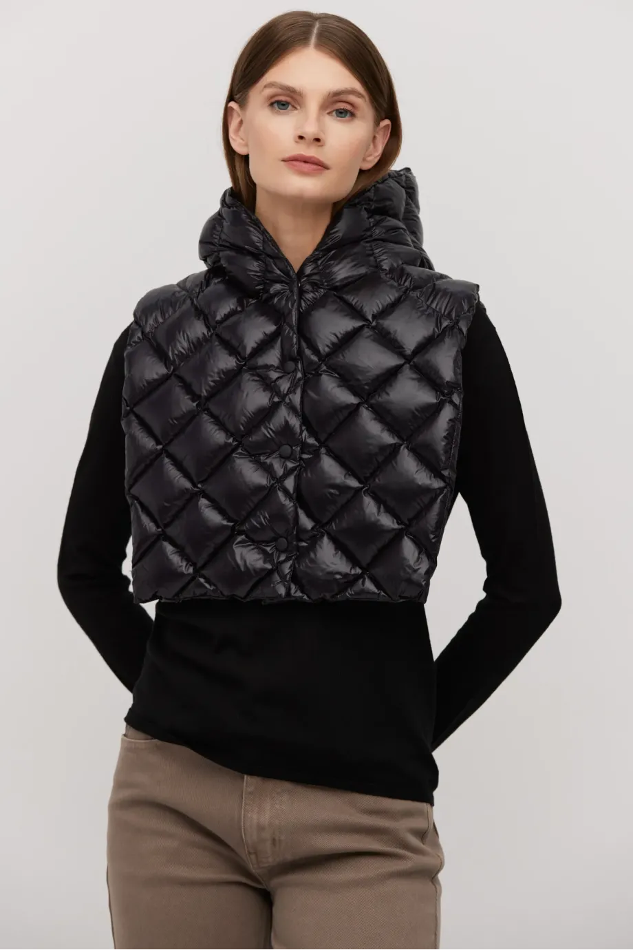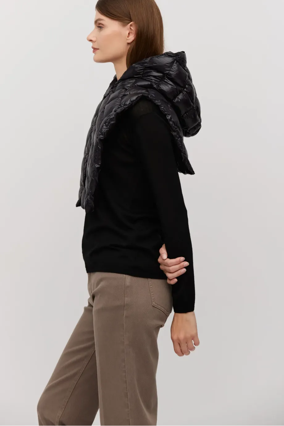 Vestă cu glugă neagră cu umplutură naturală, mărime universală. Se închide în față cu capse și funcționează ca strat de izolare pentru palton.