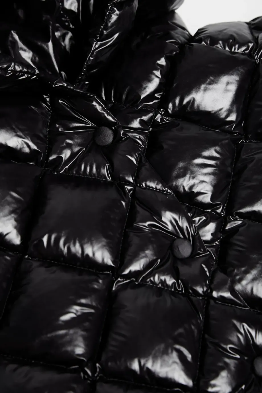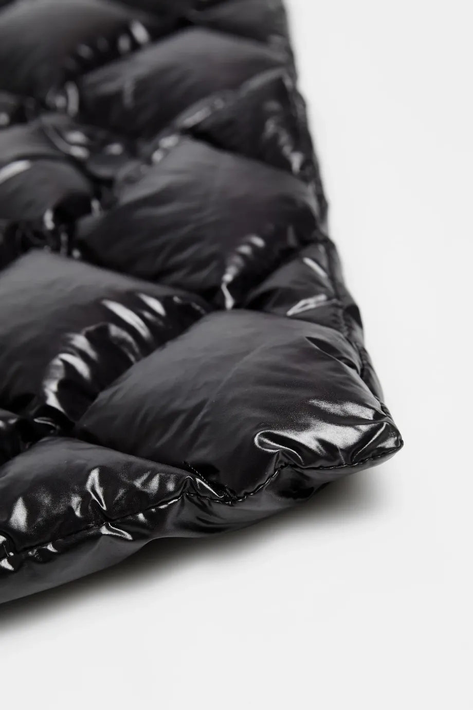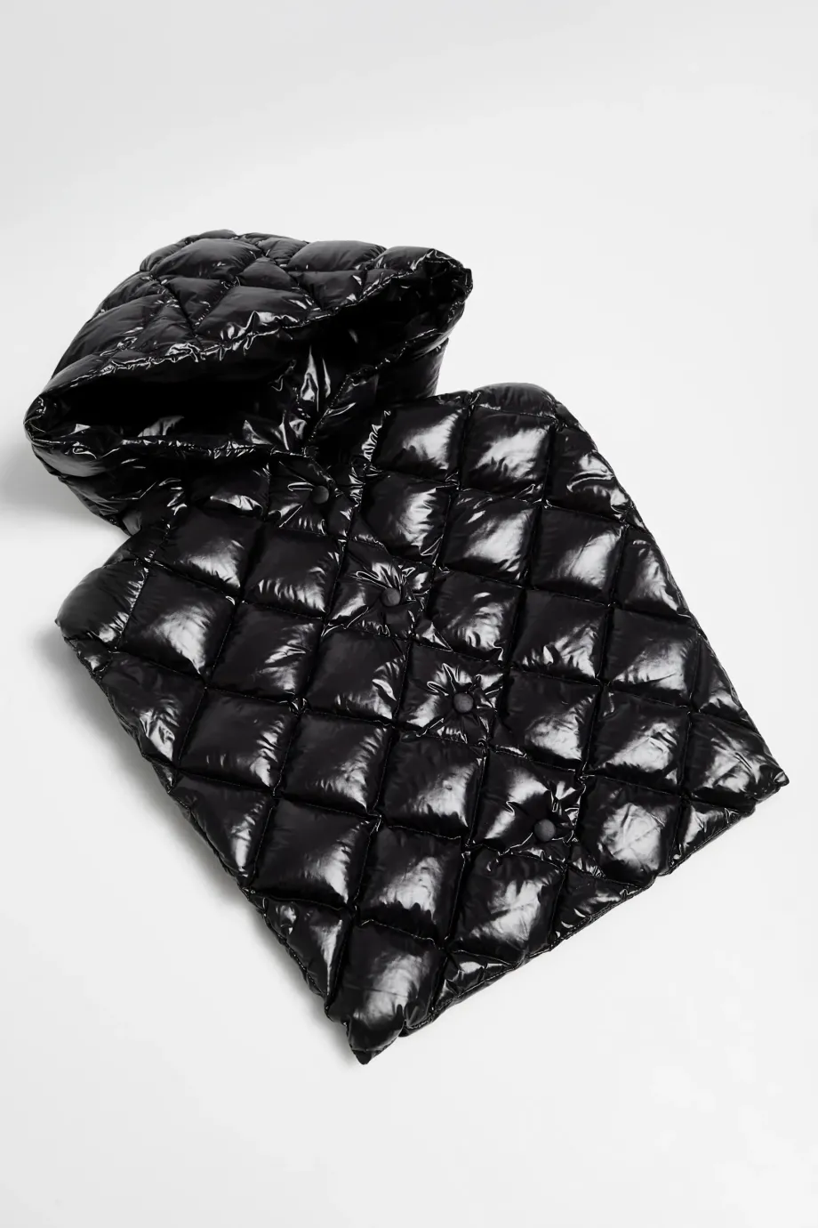 Vestă cu glugă neagră cu umplutură naturală, mărime universală. Se închide în față cu capse și funcționează ca strat de izolare pentru palton.