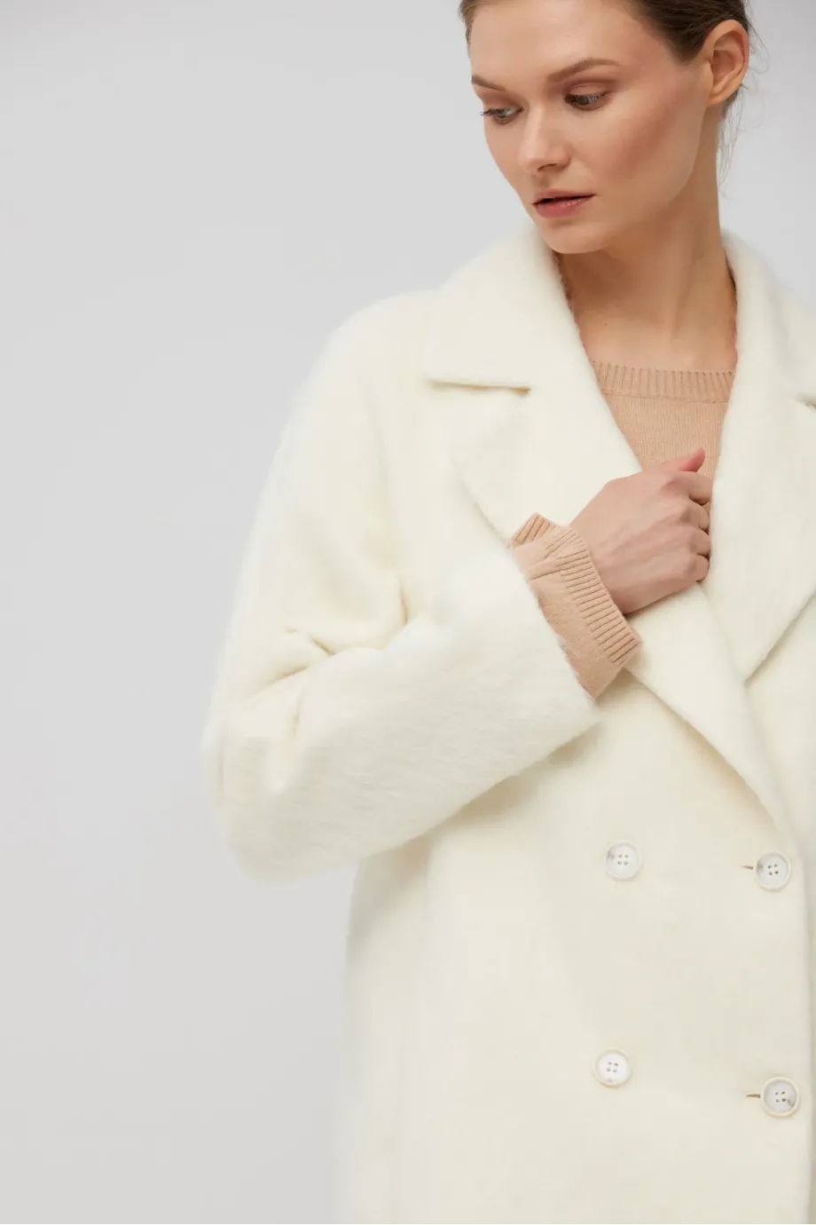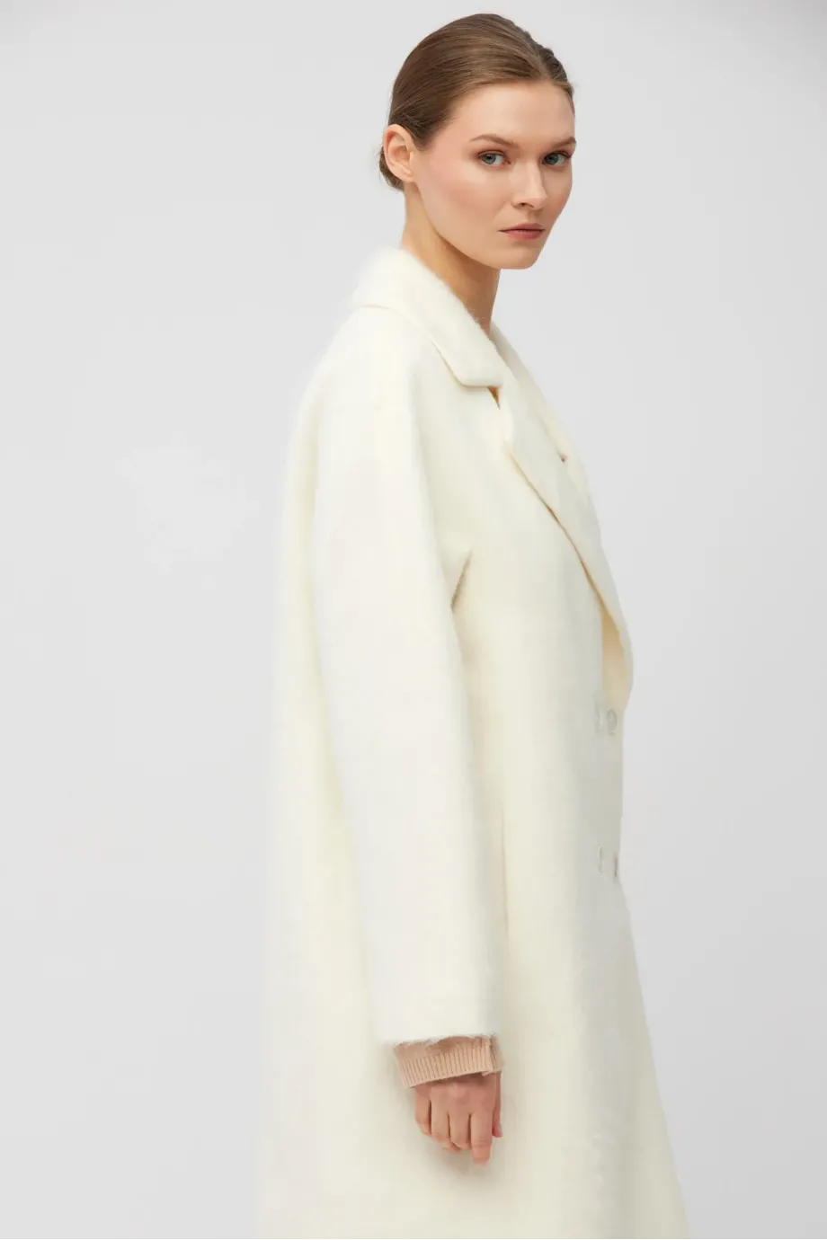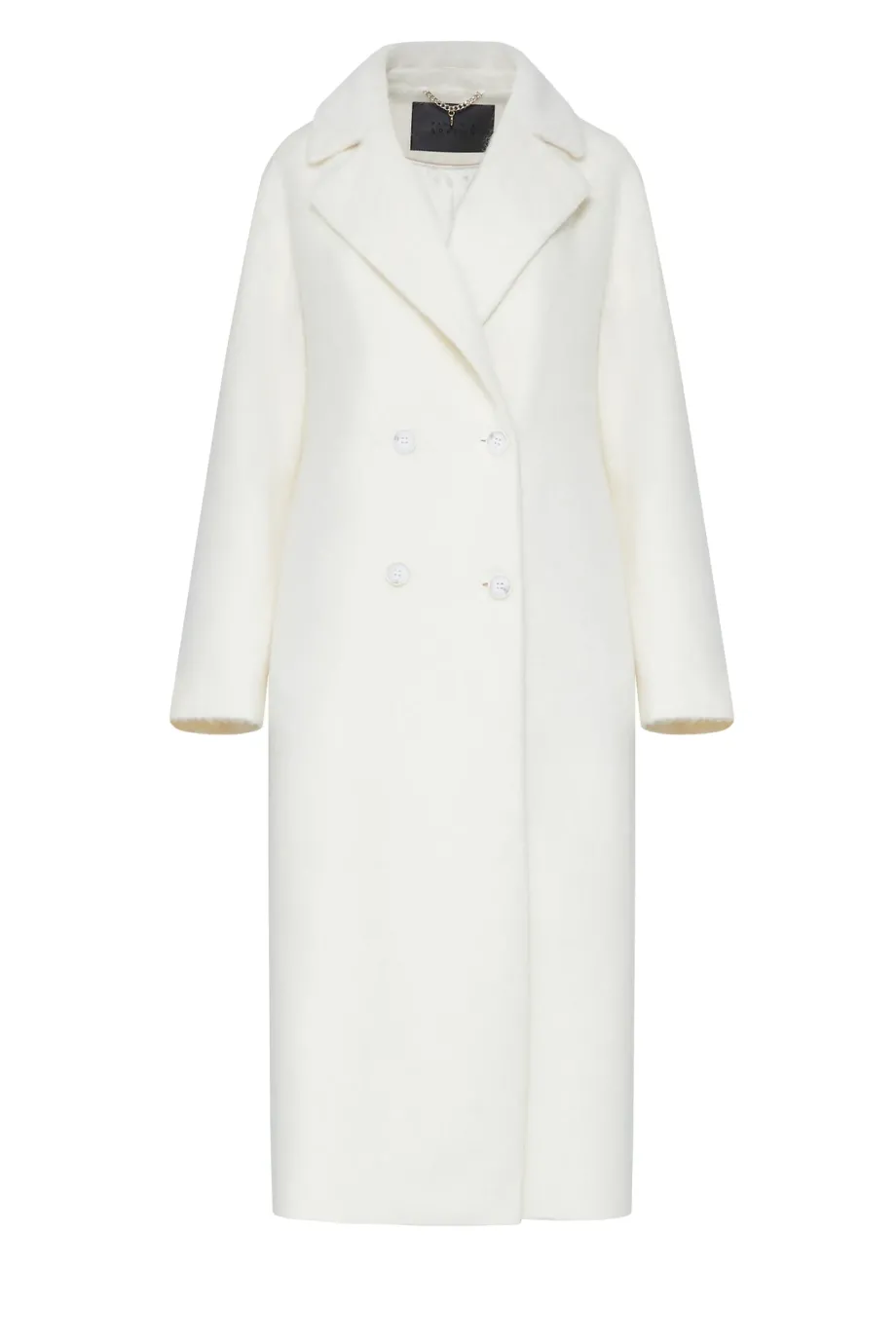 Croială simplă din amestec de lână de alpaca și mătase. Închidere cu două rânduri de nasturi din nucă corozzo naturală. Guler clasic, mâneci raglan și șliț la spate. Complet căptușit și finisat atent cu cusături decorative, piping și laminație interioară. Culoare albă.