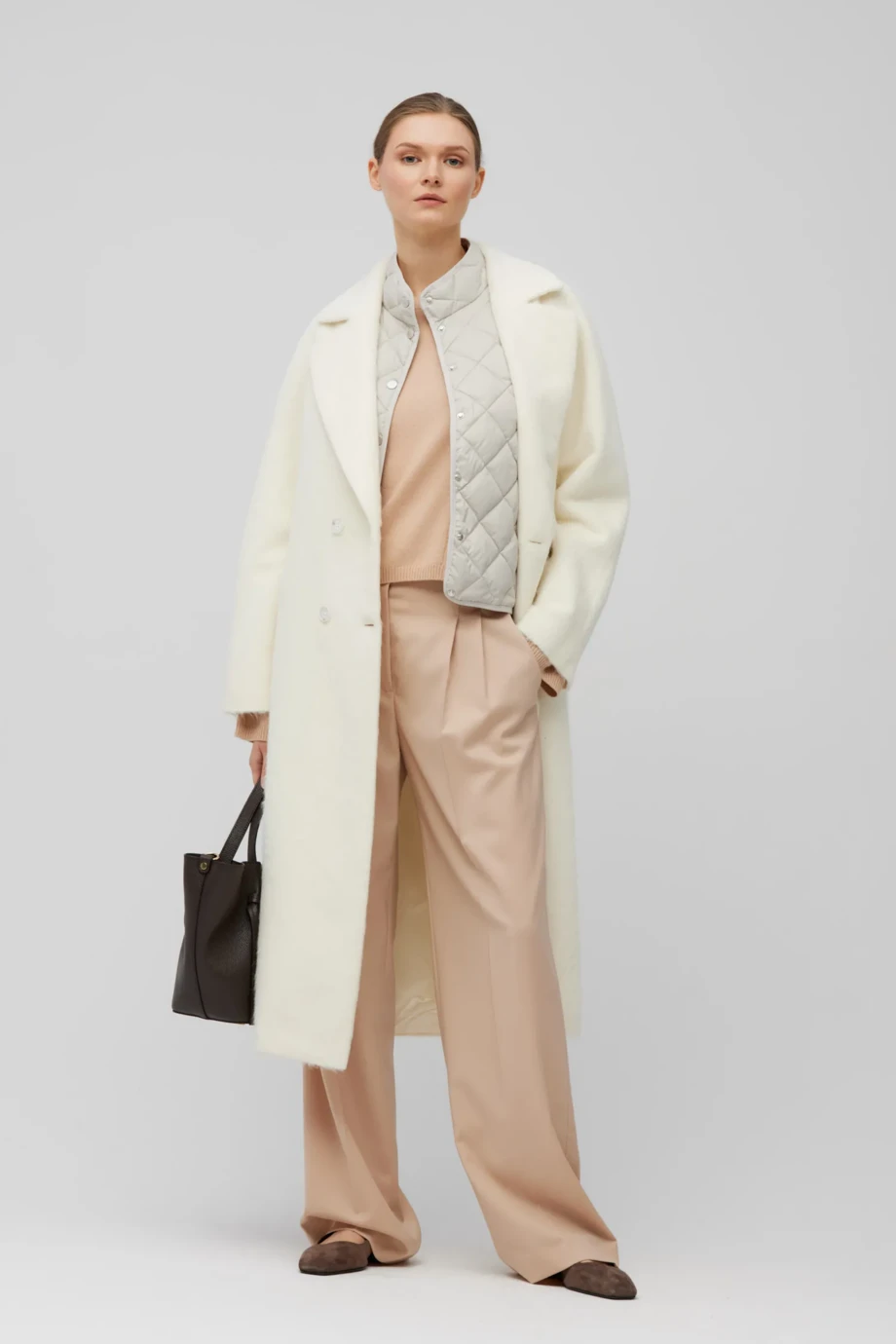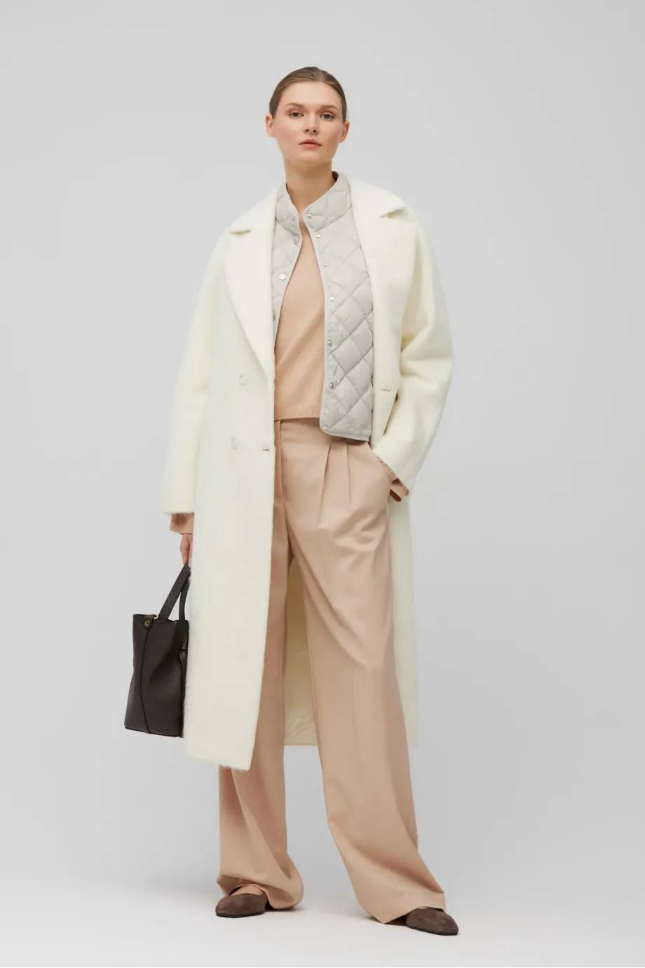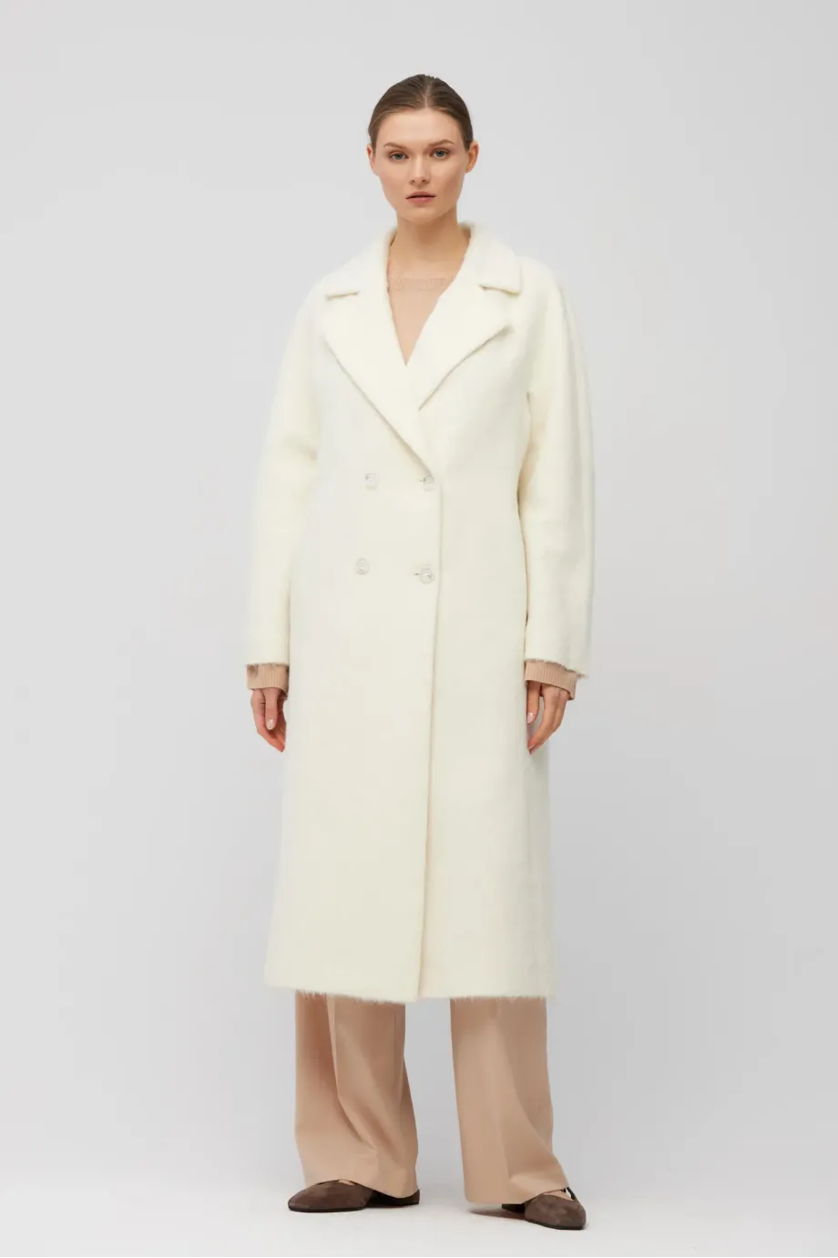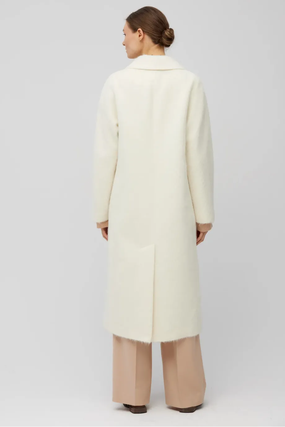 Croială simplă din amestec de lână de alpaca și mătase. Închidere cu două rânduri de nasturi din nucă corozzo naturală. Guler clasic, mâneci raglan și șliț la spate. Complet căptușit și finisat atent cu cusături decorative, piping și laminație interioară. Culoare albă.