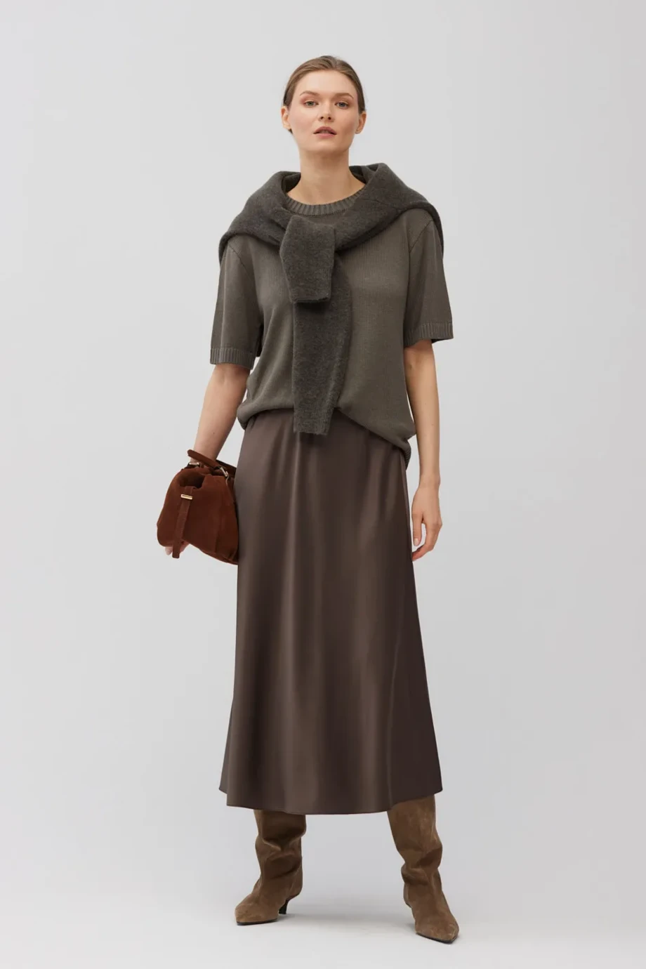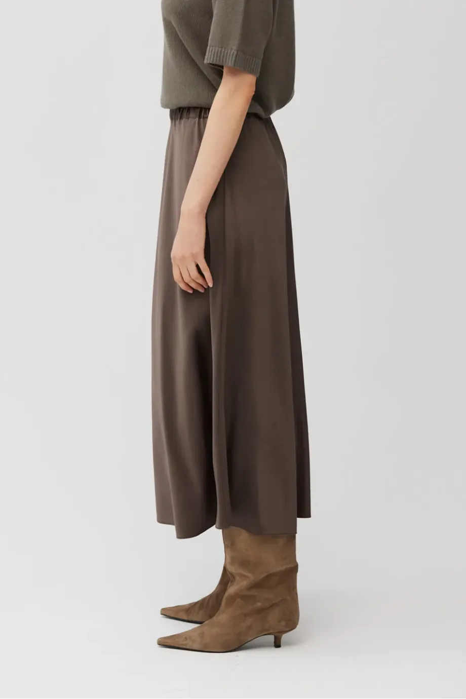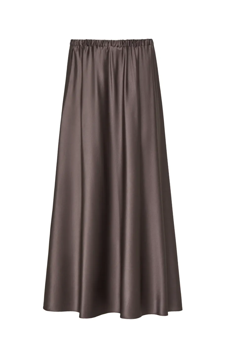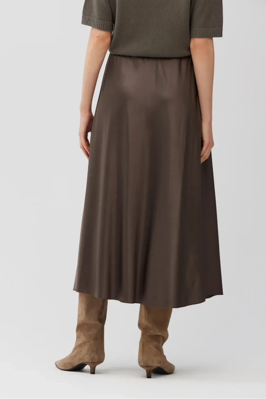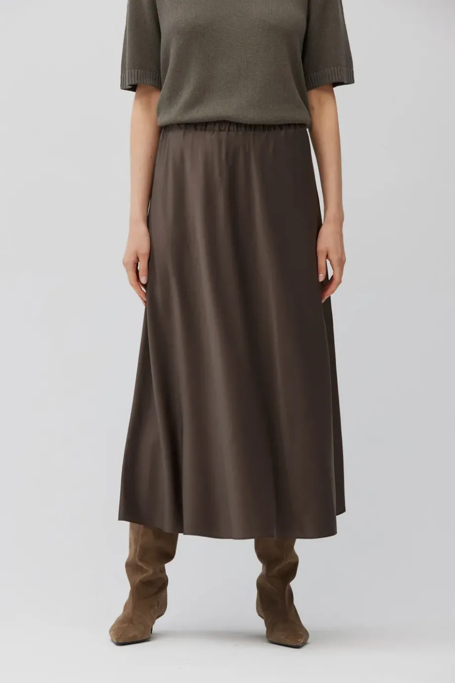 Fustă din mătase în nuanță de maro. Croială fluidă și lejeră, cu talie elastică. Lungime midi. Necăptușită.