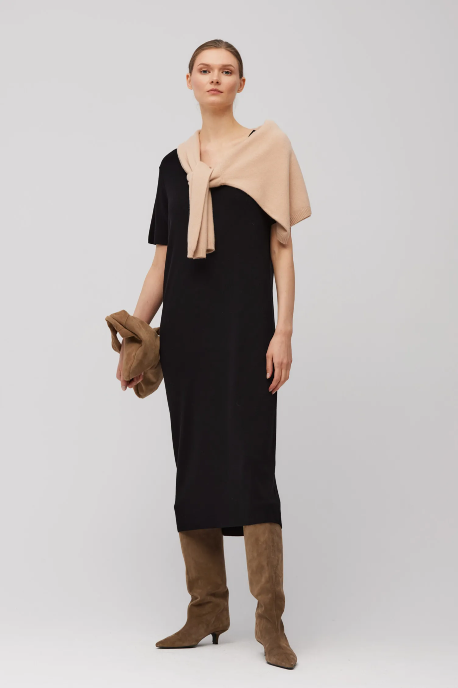 Rochie midi neagră din tricot. Croială simplă, cu decolteu în V și mâneci până la cot. Confecționată din tricot de înaltă calitate, splot fin full needle, pe mașină 12 GG.