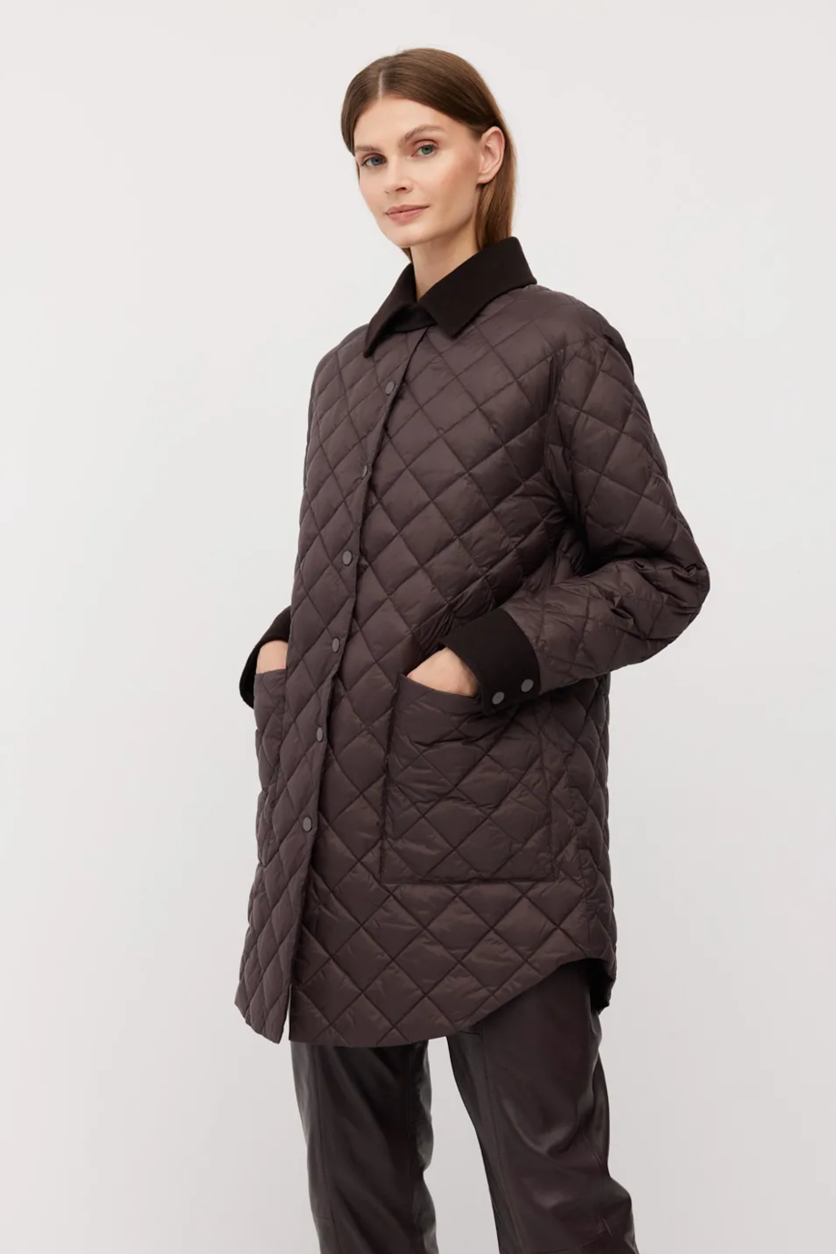 Jachetă matlasată, cu închidere cu capse. Umplutură naturală. Croială simplă și lejeră. Buzunare aplicate. Guler și manșete din lână. Culoare maro.