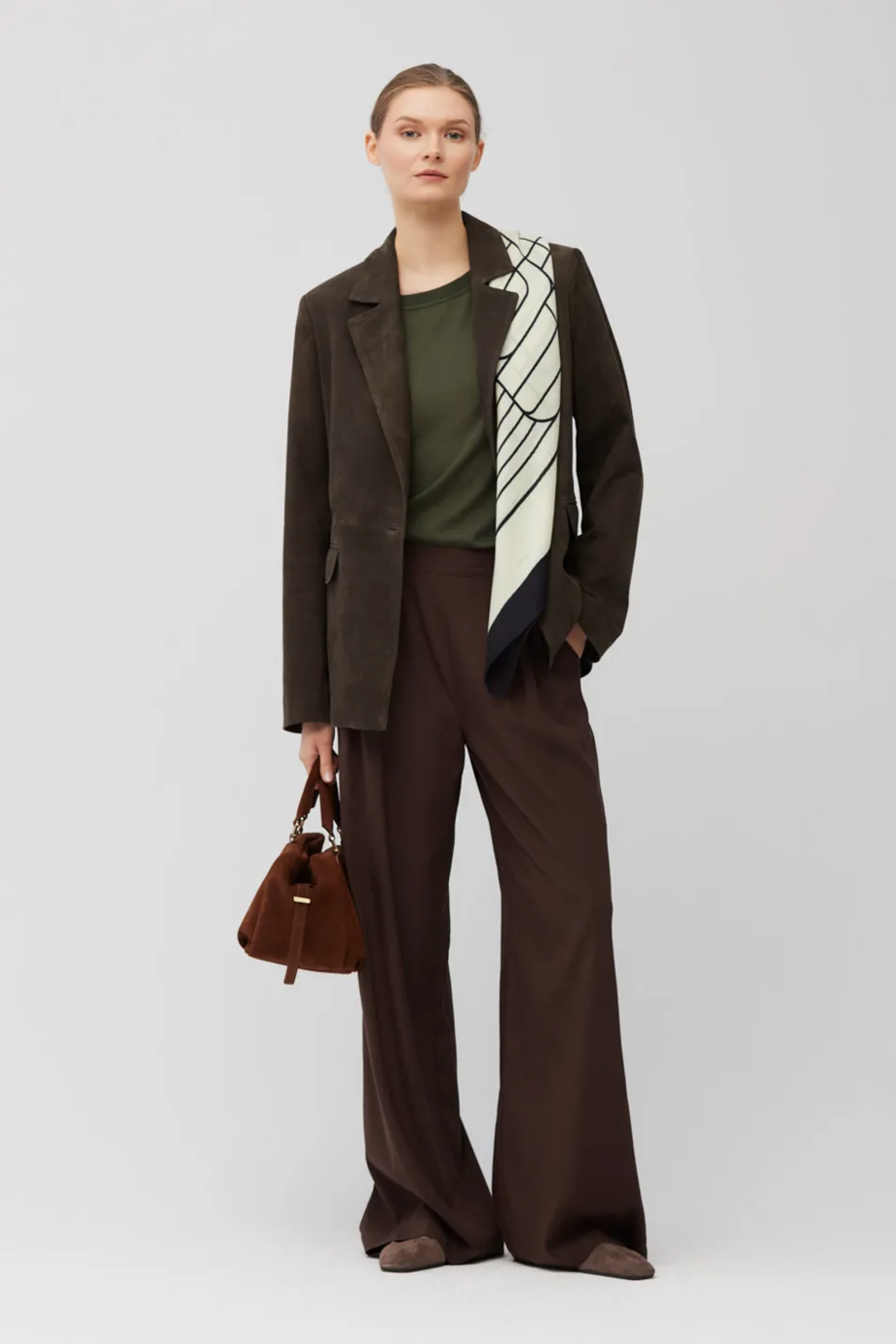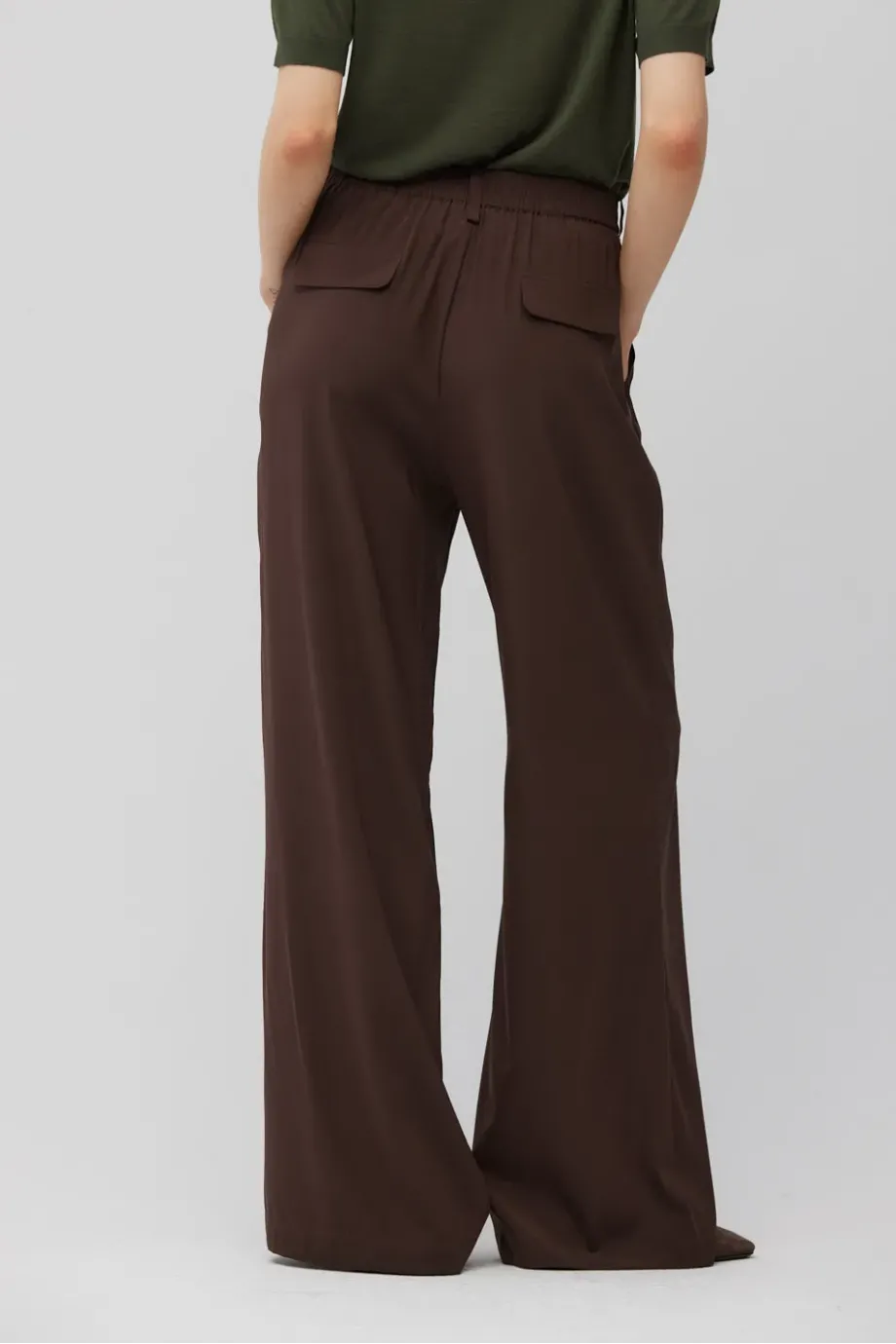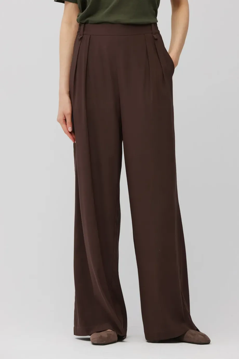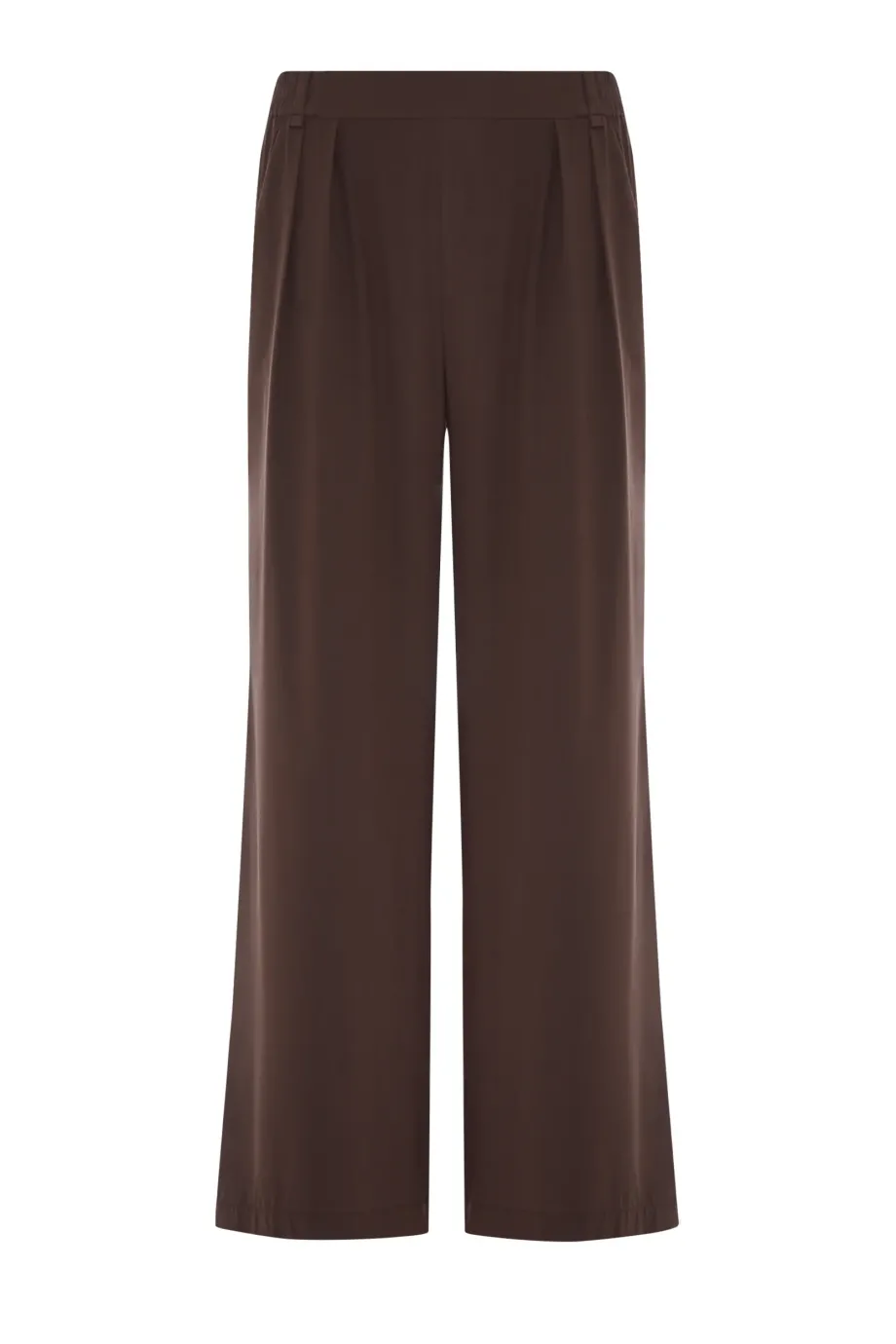 Pantaloni din mătase, cu talie înaltă și croiala pantalonului largă. Pliuri în față. Buzunare laterale și buzunare la spate cu clapă. Închidere cu fermoar ascuns, cârlig și nasture din lemn de nuc. Găici pentru curea în talie. Cusături interioare finisate cu grijă. Culoare maro.