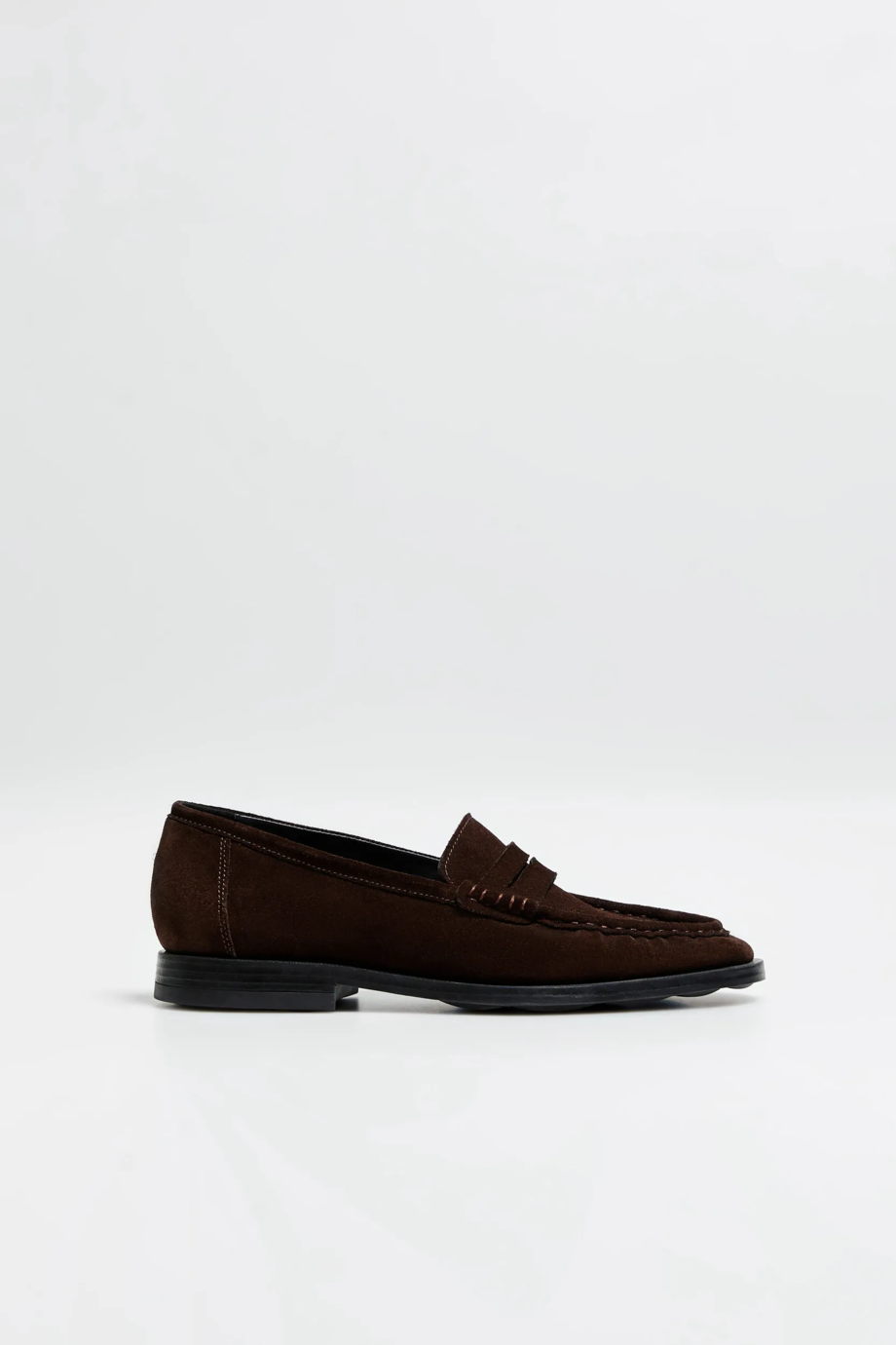 Mocasini minimalisti, cu bandă penny distinctă. Confecționați din piele velurată naturală, maro, de înaltă calitate. Fabricați manual într-o manufactură poloneză.