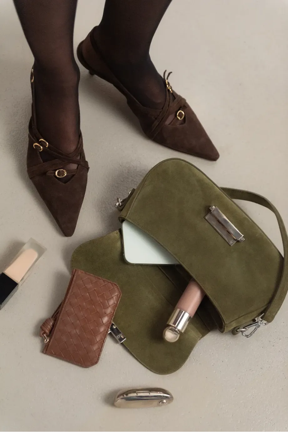 Model slingback, pe toc subțire tip kitten heel. Confecționați din piele velurată naturală, moale, în nuanță maro ciocolată. Bretele distinctive, încrucișate, cu catarame metalice decorative. Vârf ascuțit. Curea reglabilă la călcâi. Fabricați manual într-o manufactură poloneză.