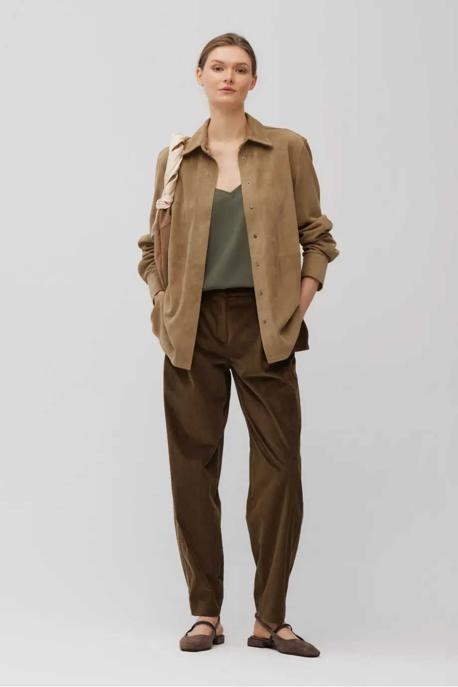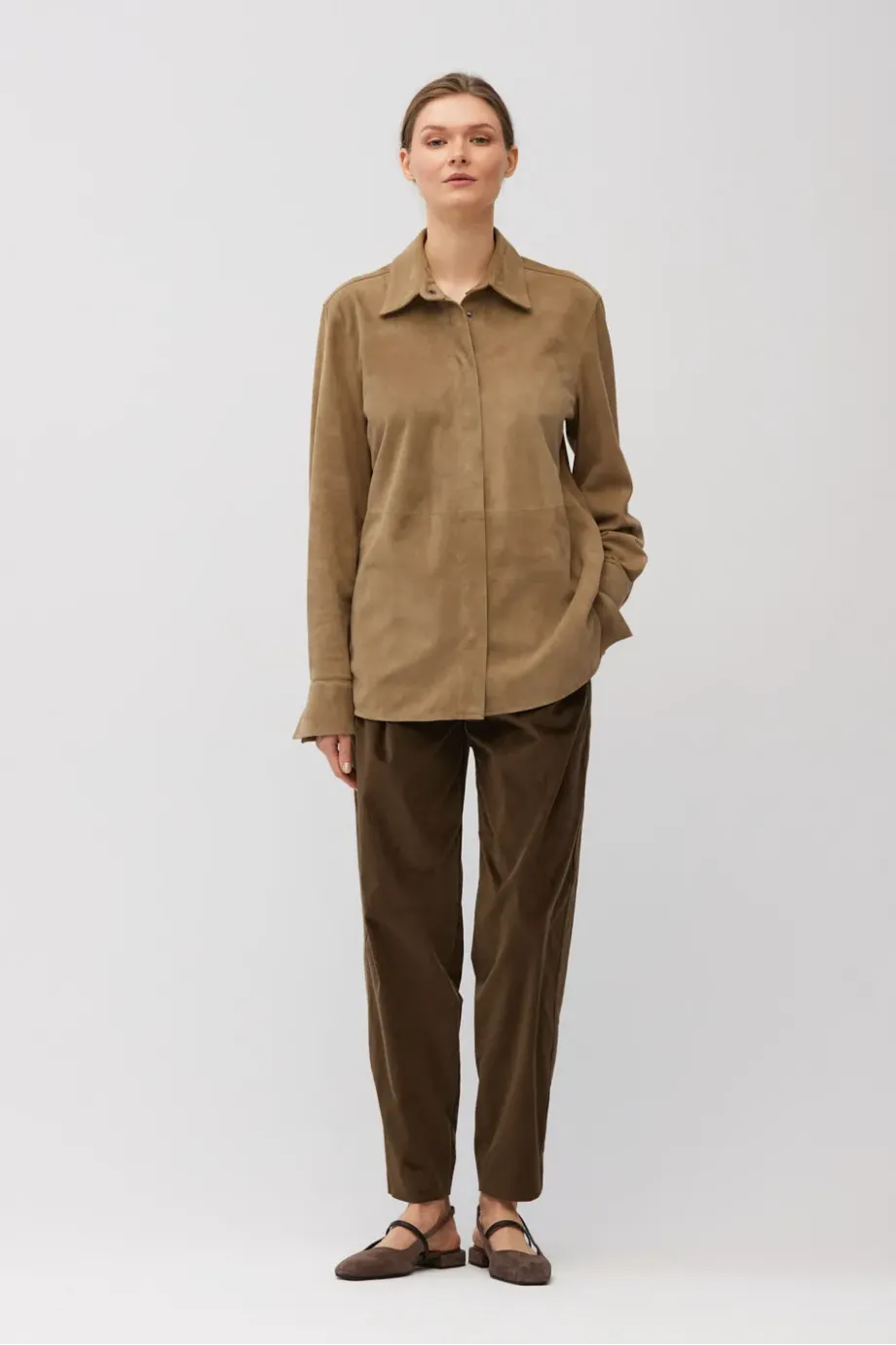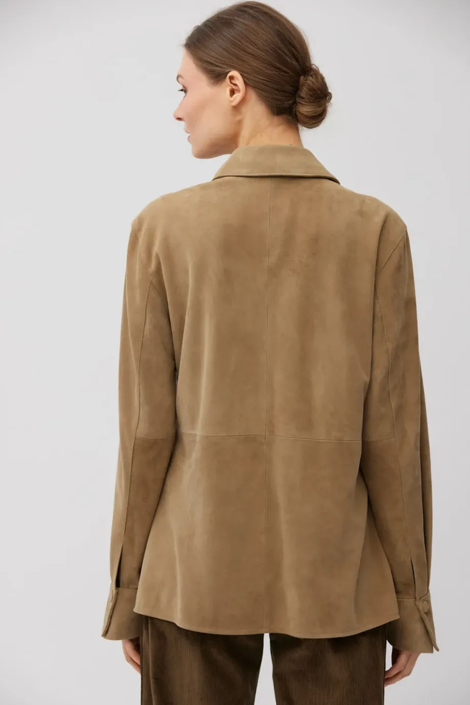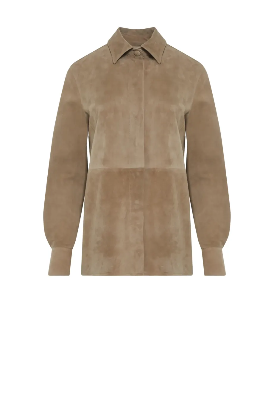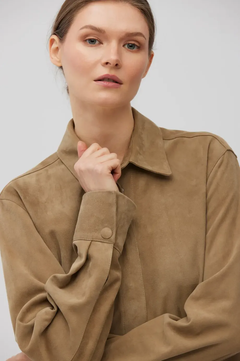 Confecționată din piele velurată naturală, moale. Guler clasic, croială simplă. Mâneci lungi cu manșete. Închidere cu capse metalice. Culoare bej.