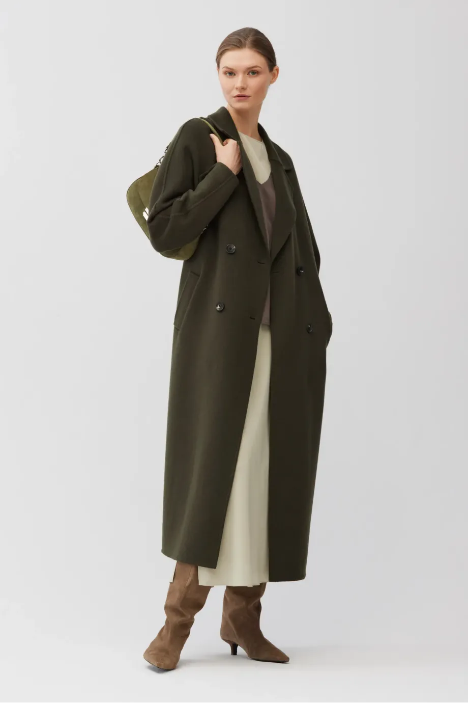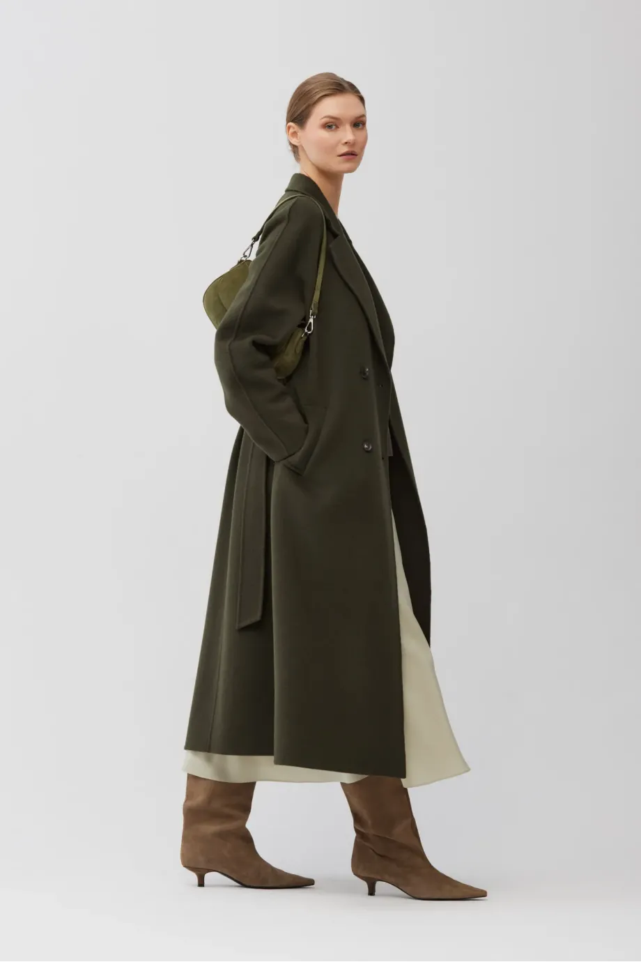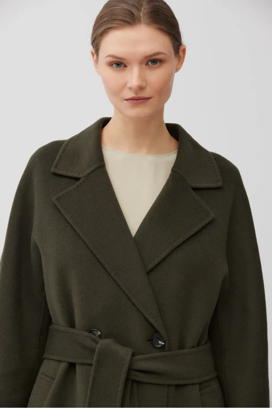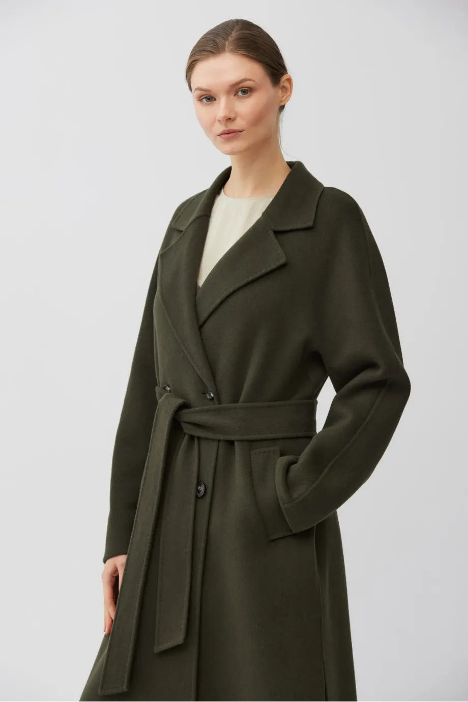 Palton cu două rânduri de nasturi, din țesătură double-face — amestec de lână și mătase. Lungime sub genunchi (midi), cordon în talie, guler cu rever. Ușor, elegant. Necăptușit. Culoare verde închis.
