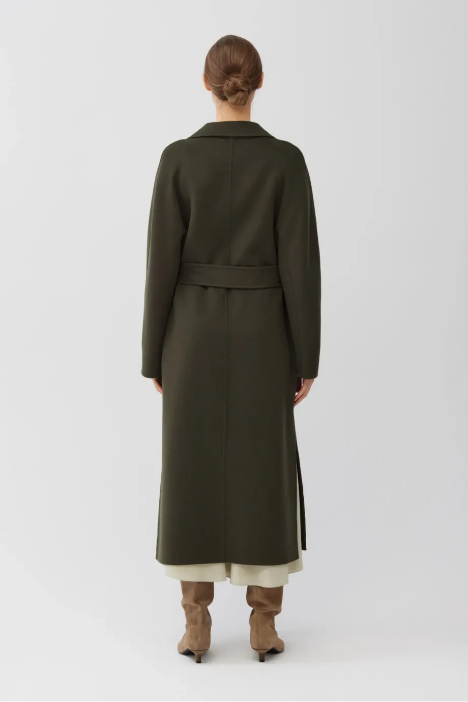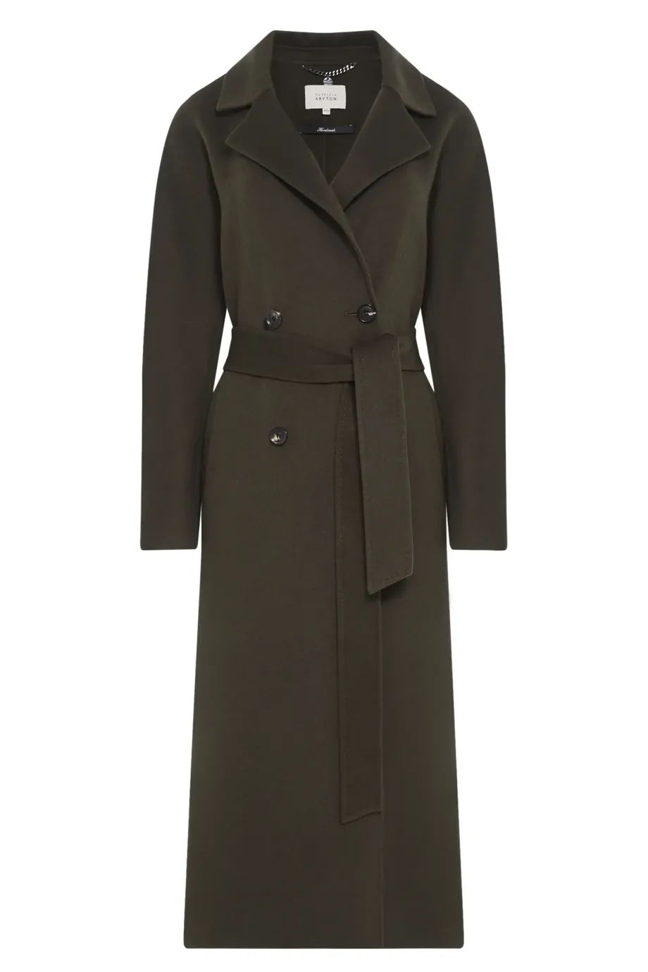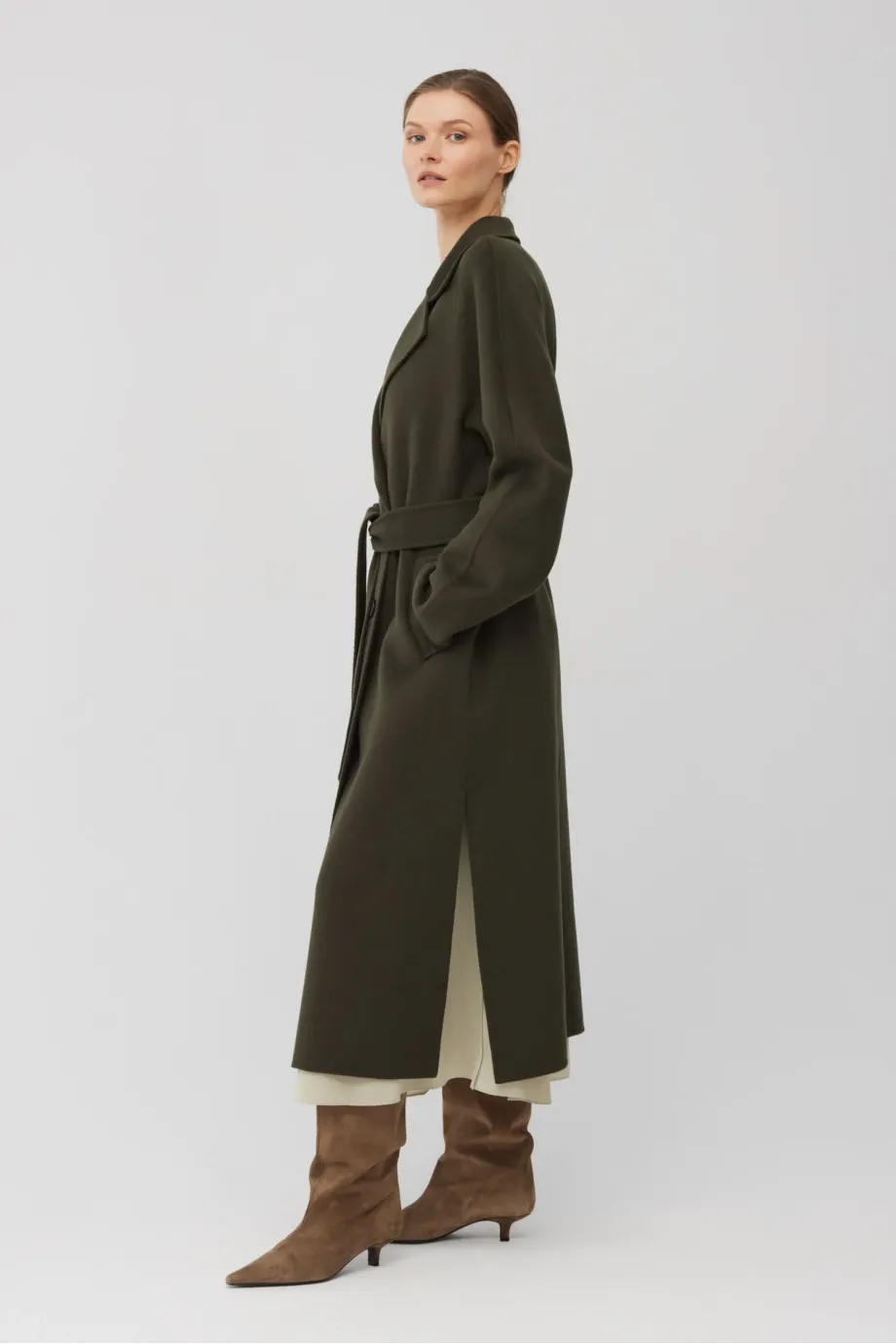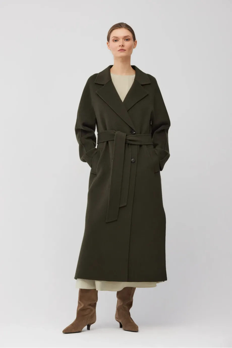 Palton cu două rânduri de nasturi, din țesătură double-face — amestec de lână și mătase. Lungime sub genunchi (midi), cordon în talie, guler cu rever. Ușor, elegant. Necăptușit. Culoare verde închis.