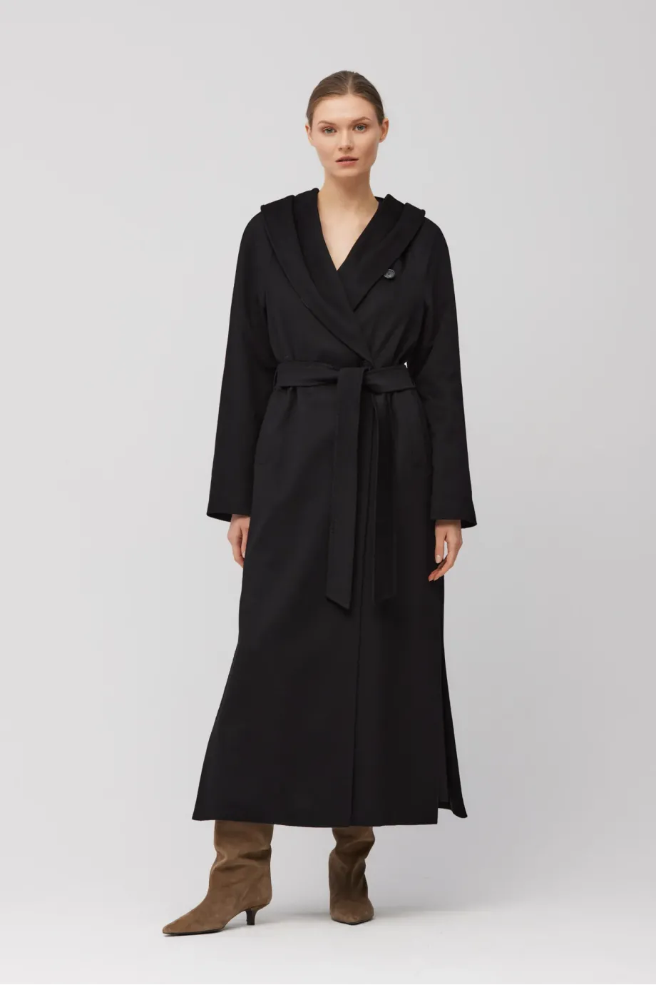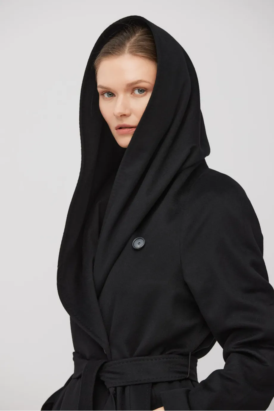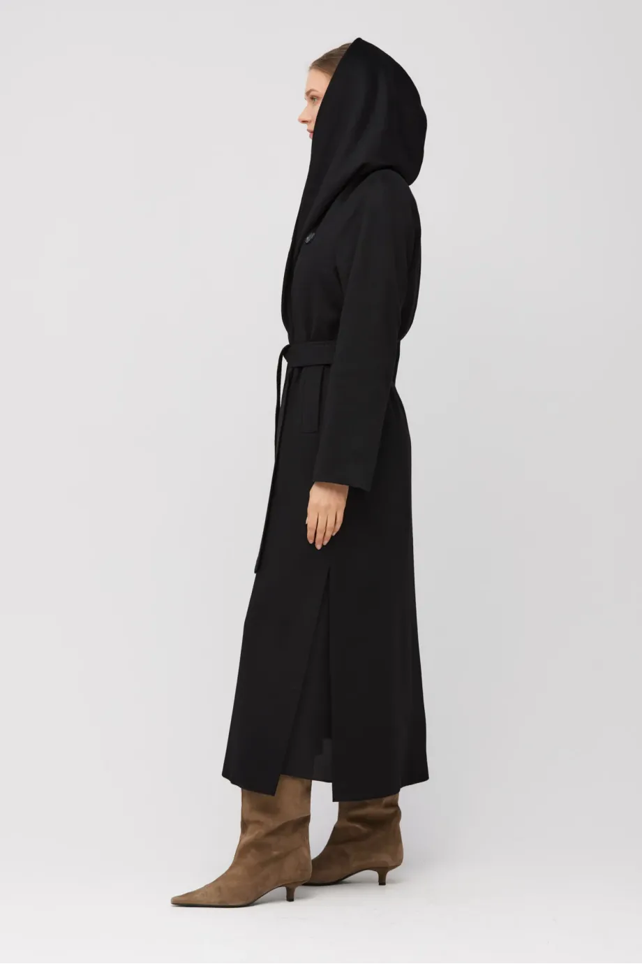 Croială simplă, lungime maxi, confecționată din țesătură moale de cașmir. Model cu cordon în talie și glugă. Fante laterale. Complet căptușit și finisat atent, cu cusături decorative, piping și laminație interioară. Închidere exterioară cu nasture din corn natural și închidere interioară cu nasture din corozo. Culoare neagră.