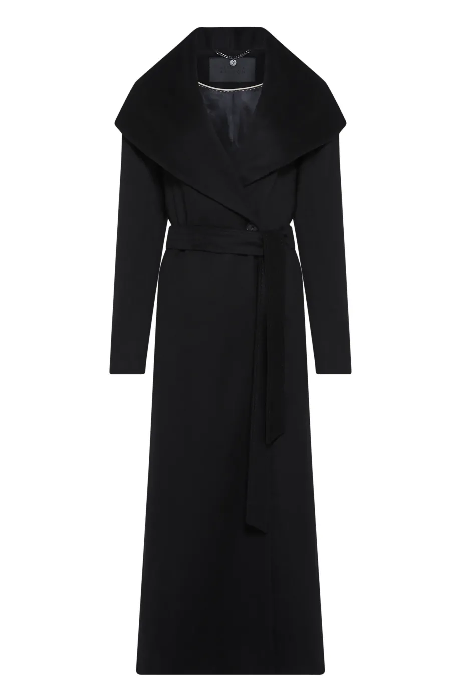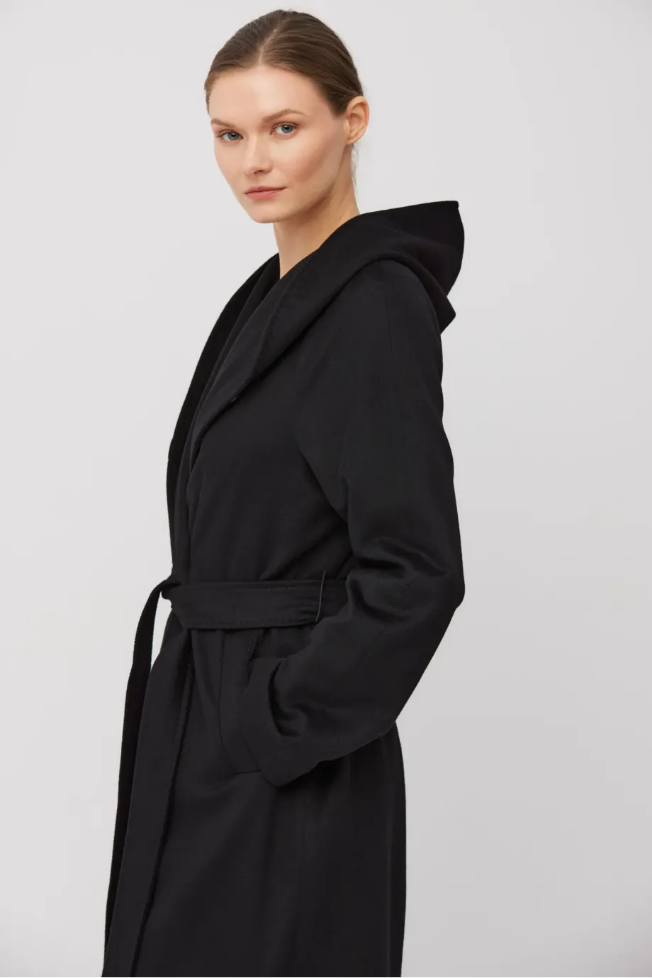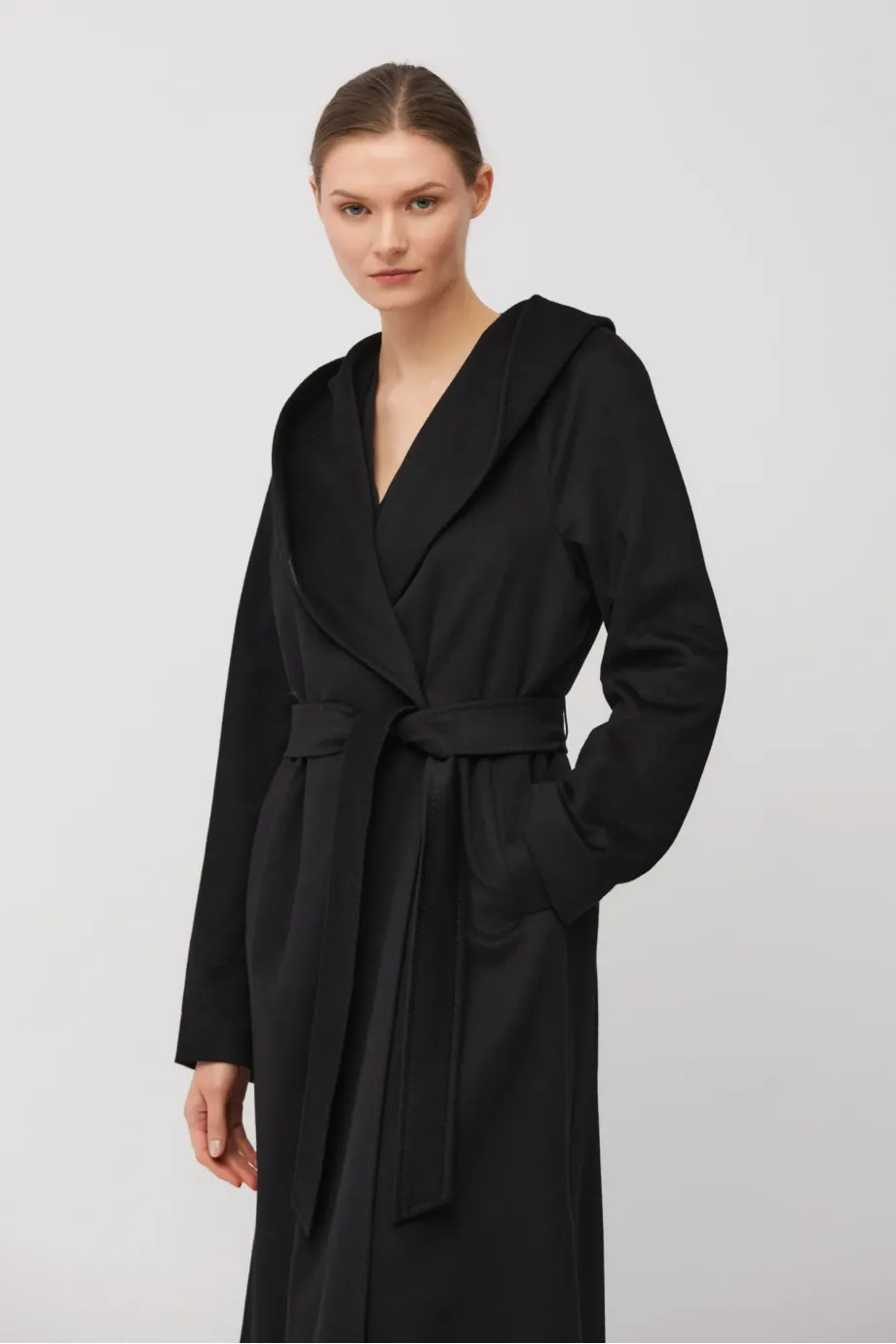 Croială simplă, lungime maxi, confecționată din țesătură moale de cașmir. Model cu cordon în talie și glugă. Fante laterale. Complet căptușit și finisat atent, cu cusături decorative, piping și laminație interioară. Închidere exterioară cu nasture din corn natural și închidere interioară cu nasture din corozo. Culoare neagră.
