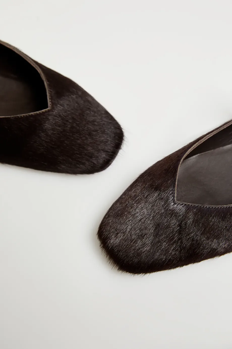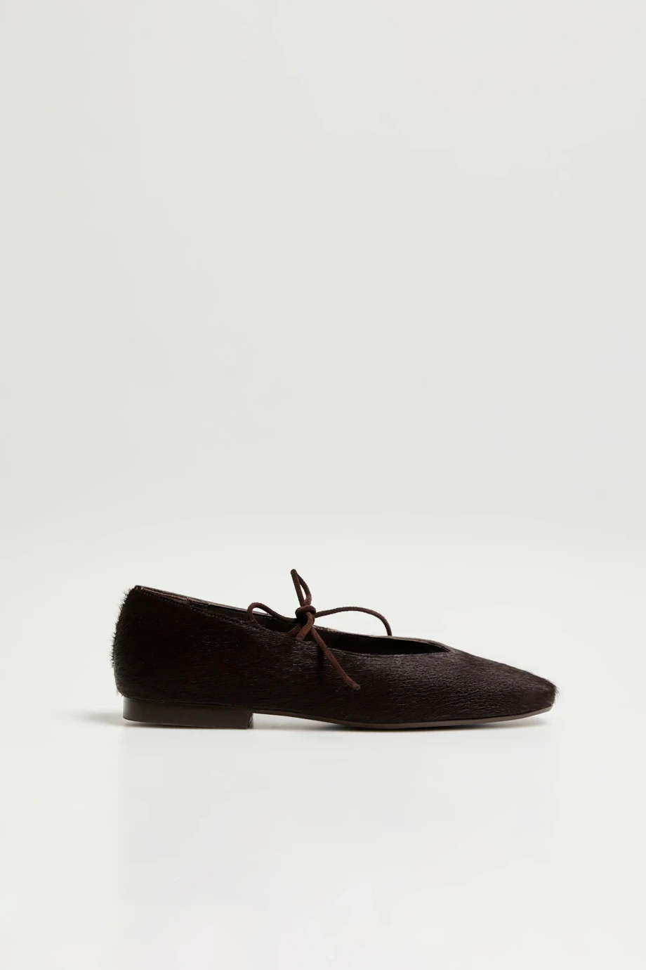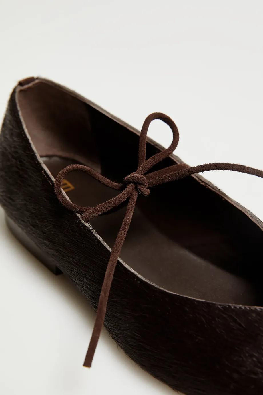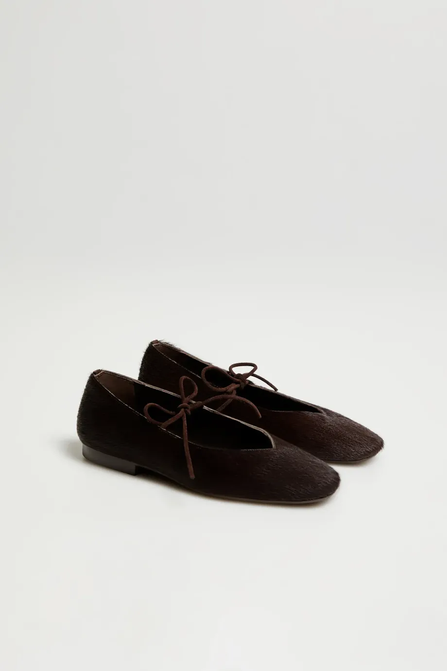 Balerini din piele naturală cu păr lung, în nuanță de maro închis. Partea superioară joasă, legată cu șiret subțire, permite ajustarea pe înălțimea piciorului. Vârf migdalat și talpă plată pentru lejeritate și flexibilitate. Cusuți manual într-o manufactură spaniolă.
