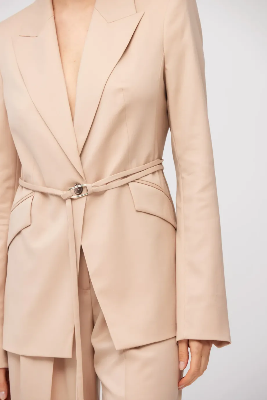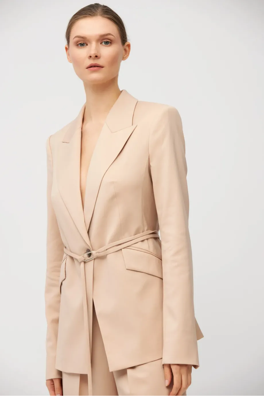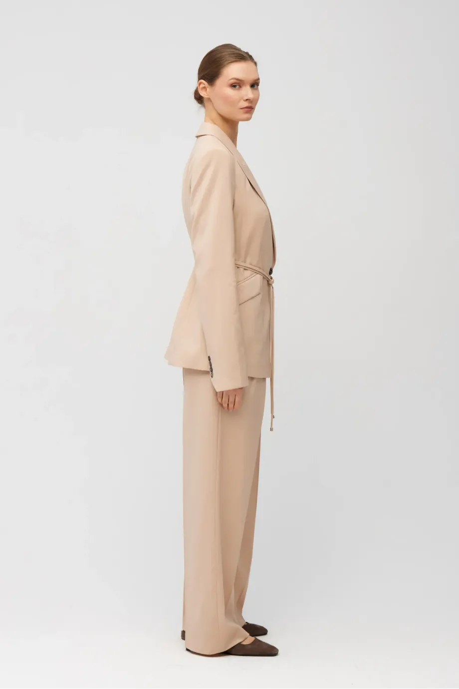 Sacou cambrat din lână virgină, în culoare roz pudrat. Închidere cu un singur nasture din sidef. Linie a umerilor delicat accentuată. Model ușor cambrat, cu mâneci lungi și guler. Buzunare cu clapă. Complet căptușită. Pantalonii asortați sunt disponibili pentru completarea setului.