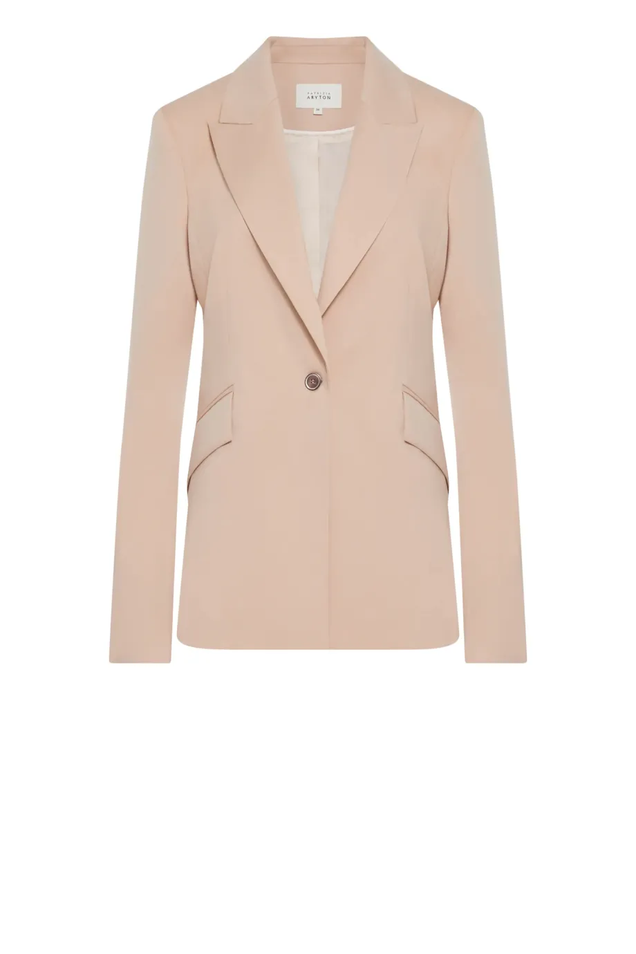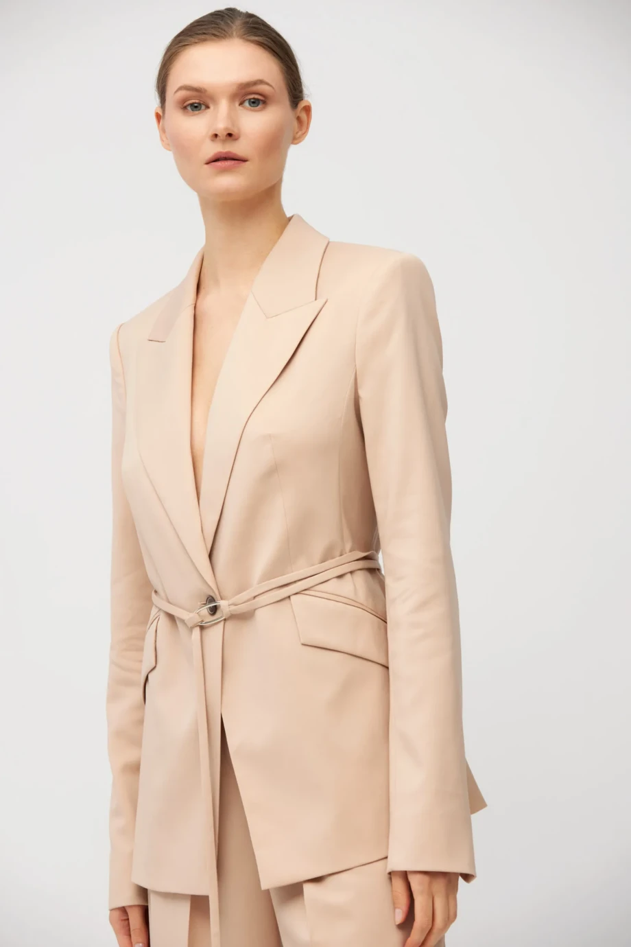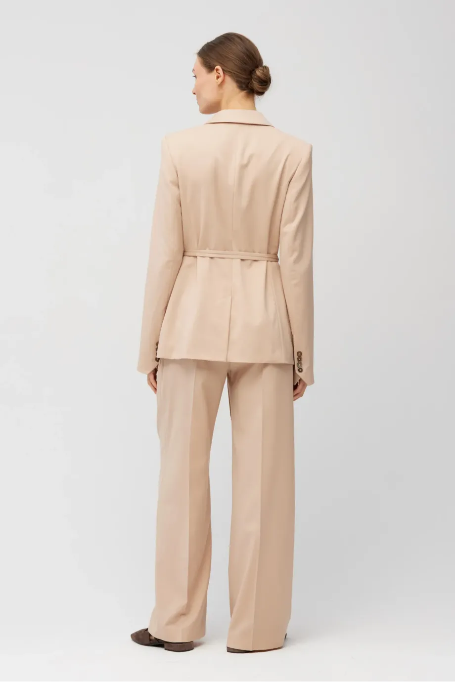 Sacou cambrat din lână virgină, în culoare roz pudrat. Închidere cu un singur nasture din sidef. Linie a umerilor delicat accentuată. Model ușor cambrat, cu mâneci lungi și guler. Buzunare cu clapă. Complet căptușită. Pantalonii asortați sunt disponibili pentru completarea setului.