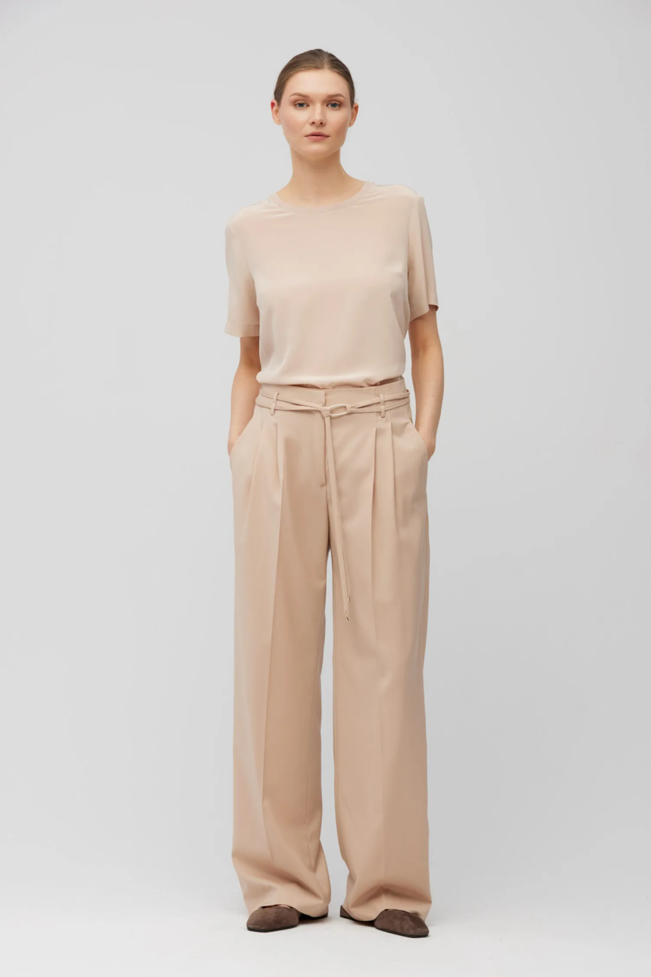Model cu talie înaltă, cu pliuri frontale care oferă un plus de lejeritate în zona șoldurilor. Croiala pantalonului drept, mai larg, cu nervură. Buzunare laterale și finisaje decorative la interior. Găici și curea din aceeași țesătură. Închidere cu fermoar ascuns, cârlig și nasture interior din nucă corozzo naturală. Setul poate fi completat cu sacou din aceeași țesătură.