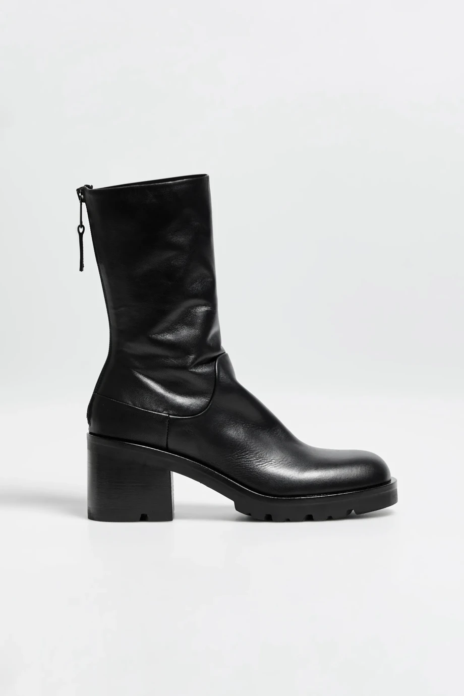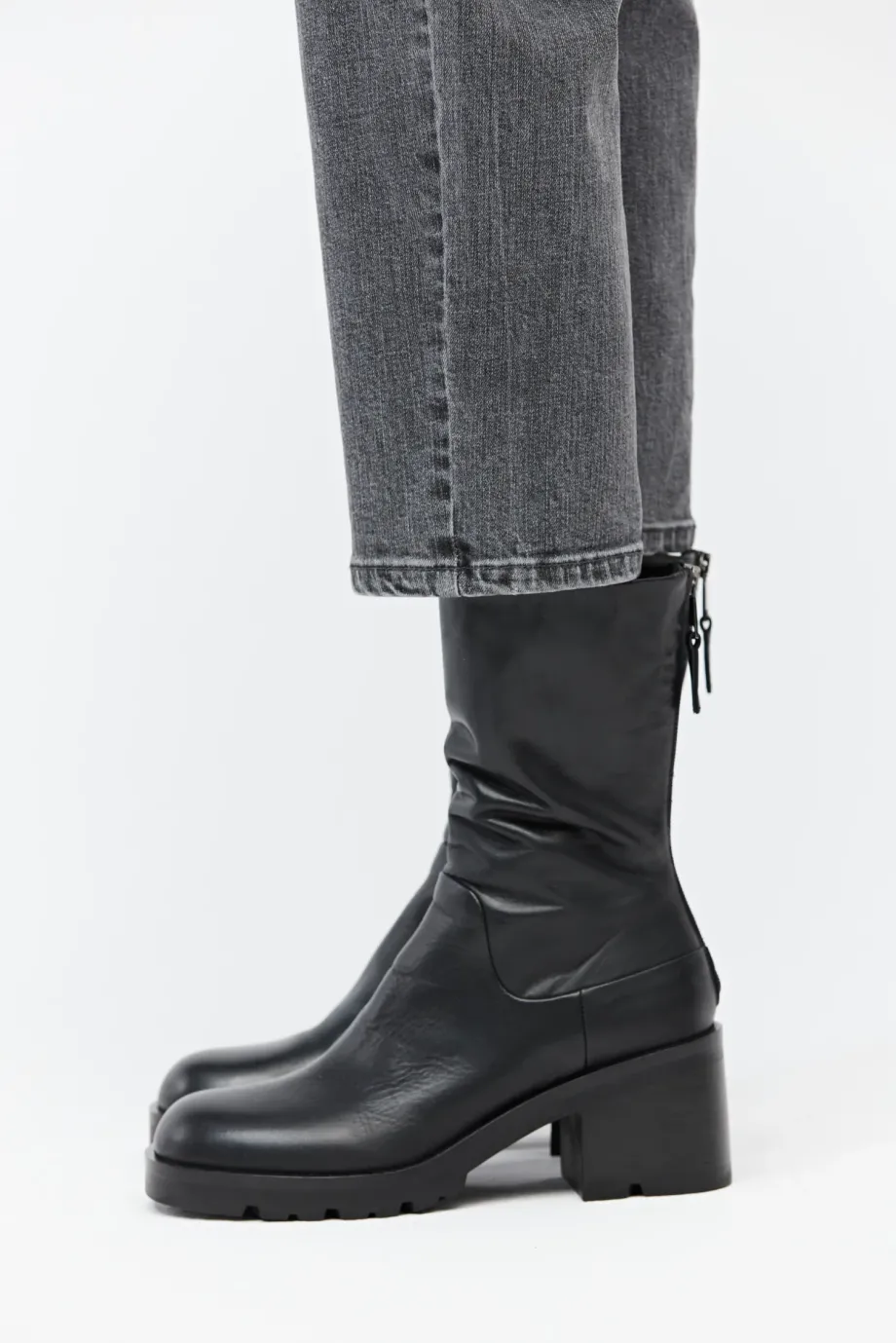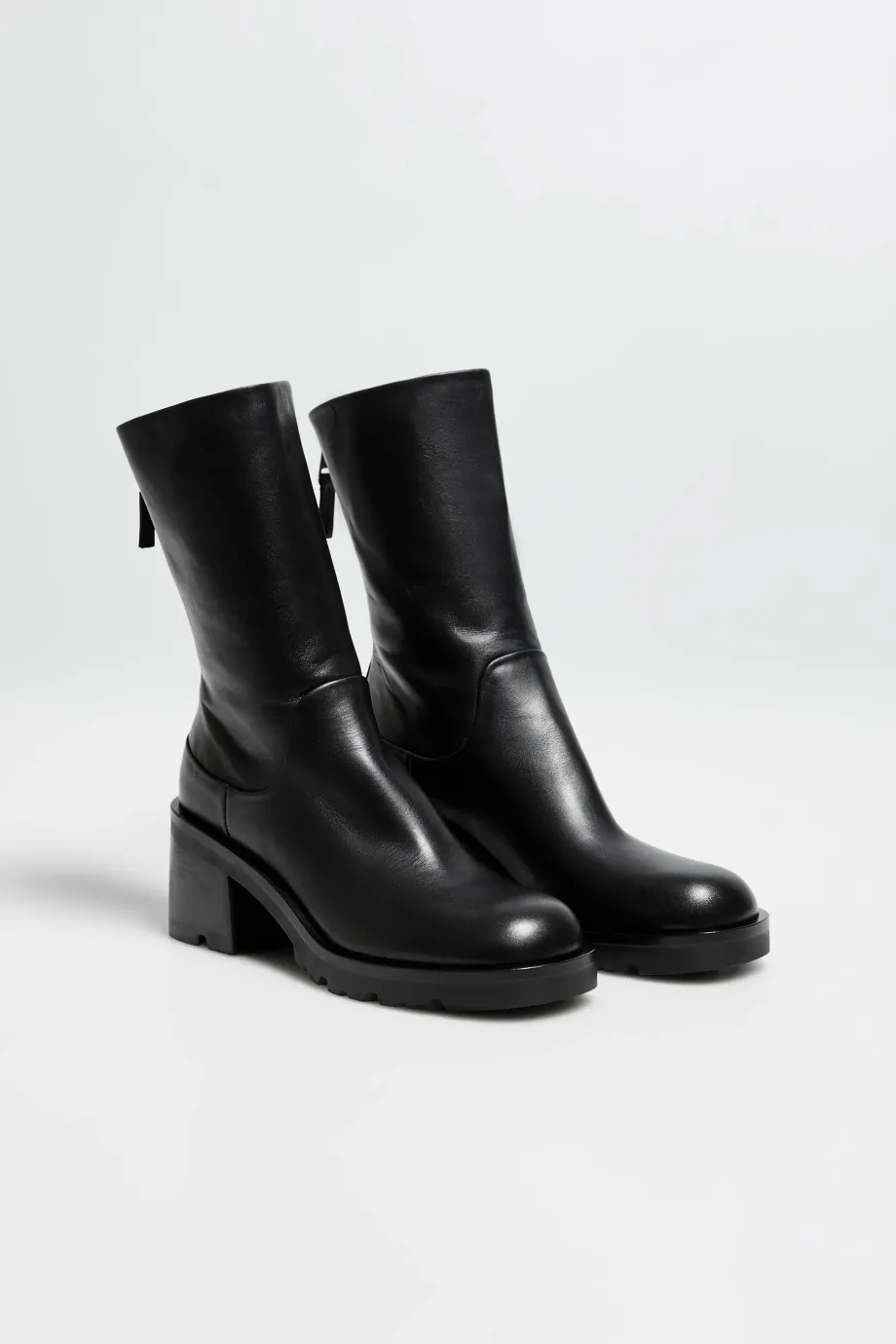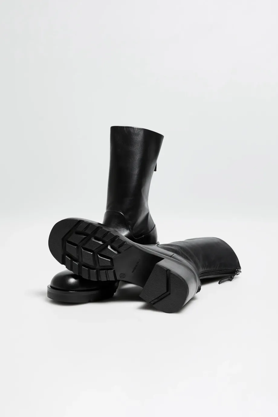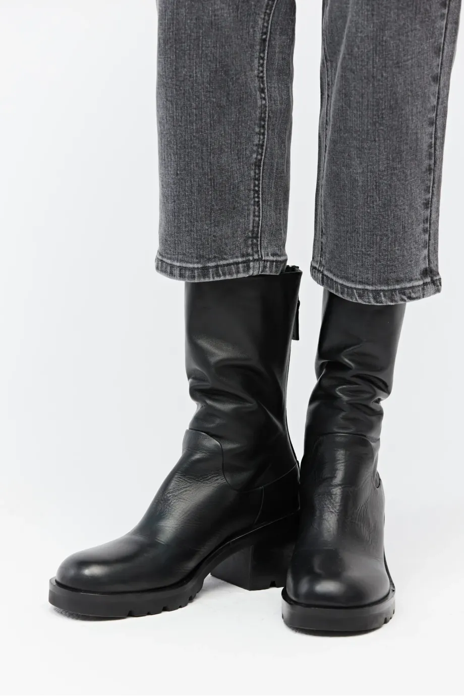 Cizme negre, cu partea superioară înaltă, din piele naturală. Închidere la spate. Talpă stabilă, robustă. Cusuți manual într-o manufactură italiană.
