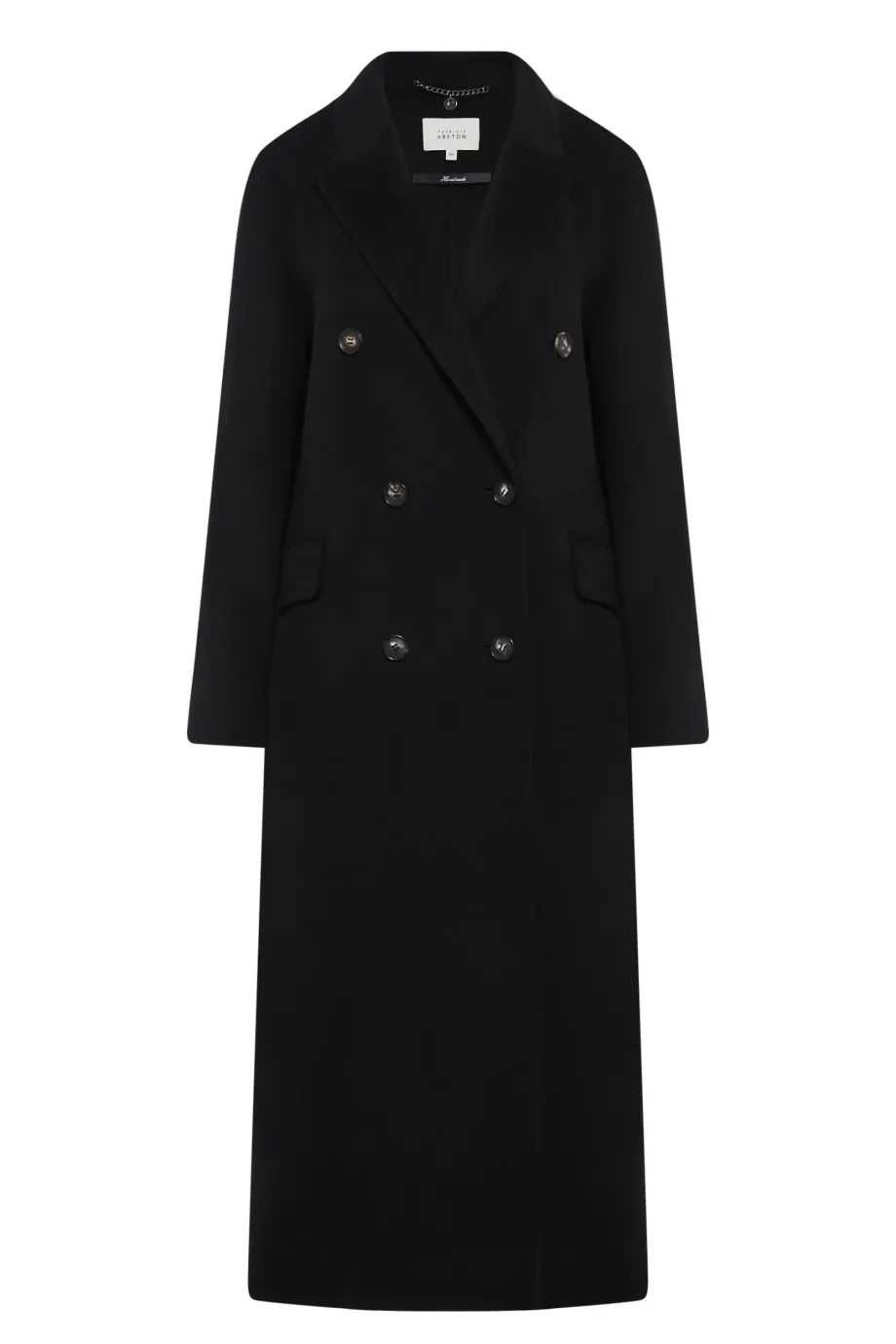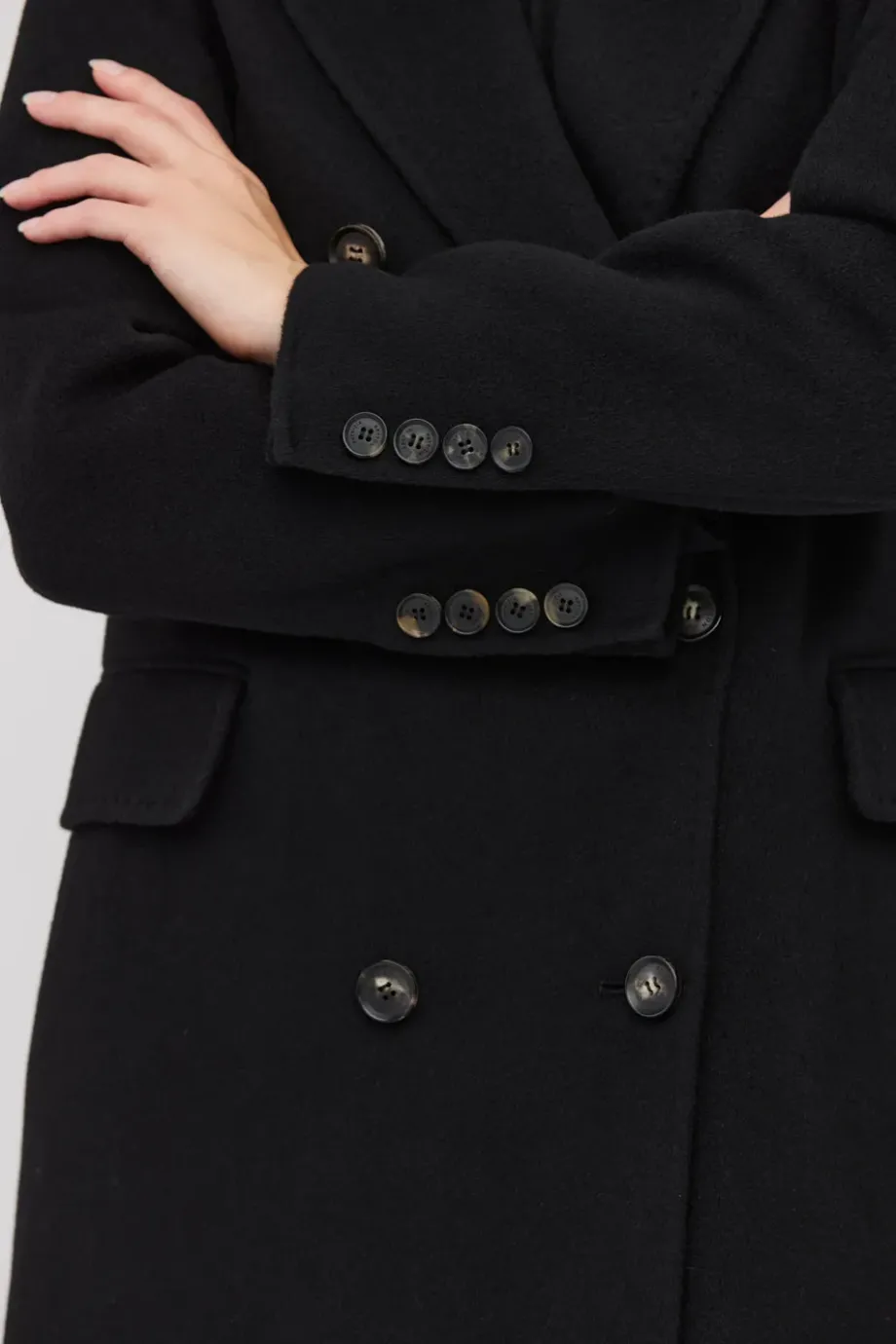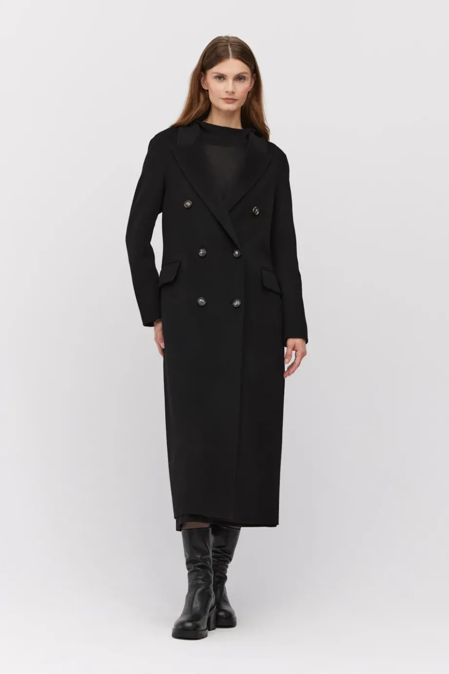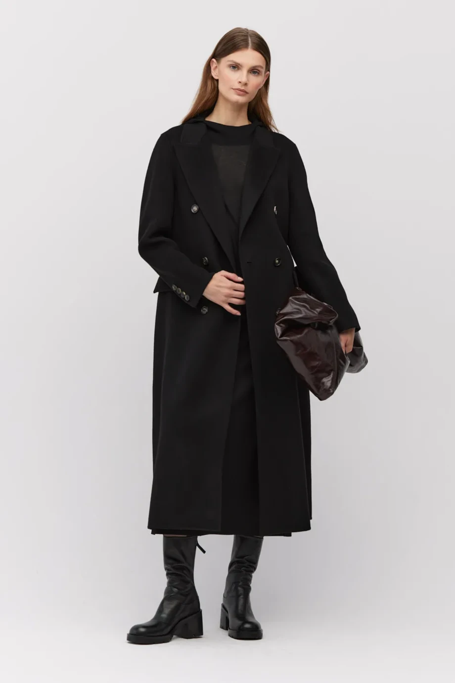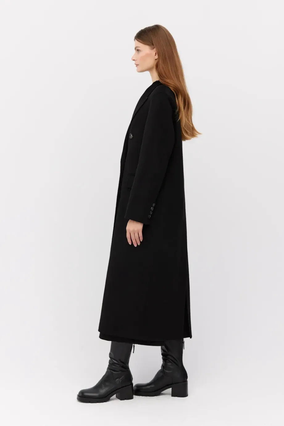 Palton cu două rânduri de nasturi, cu croială simplă, confecționat din țesătură double-face — 100% cașmir. Lungime maxi. Guler clasic, buzunare, șliț la spate. Închidere cu nasturi. Model ușor, necăptușit, finisat manual. Culoare neagră.