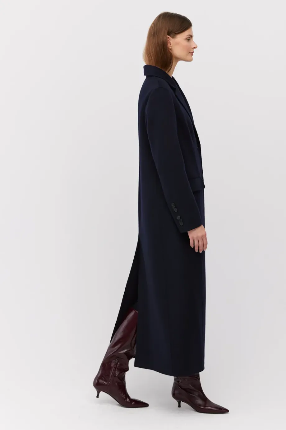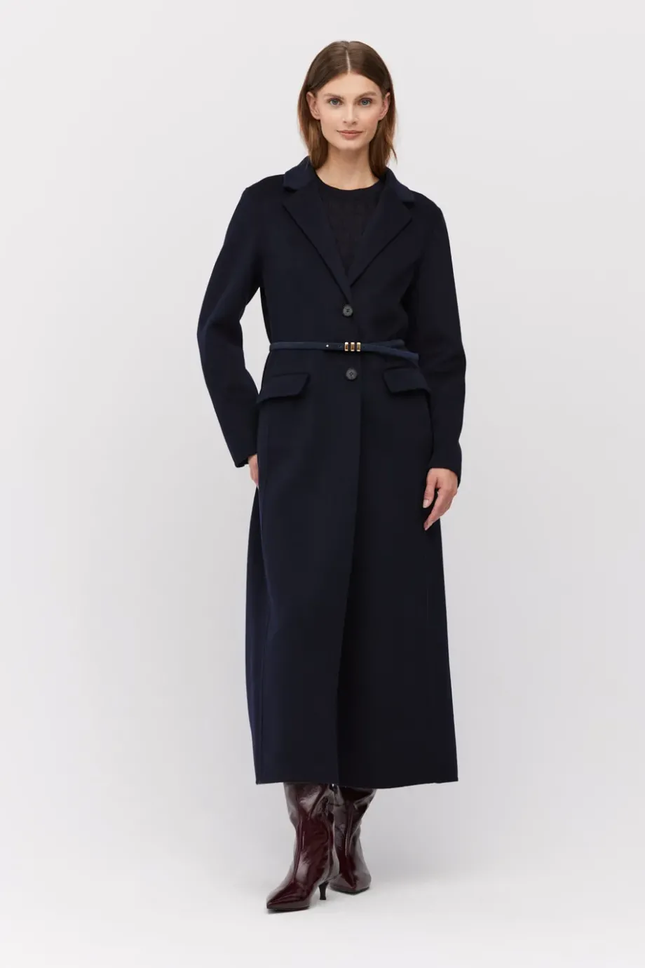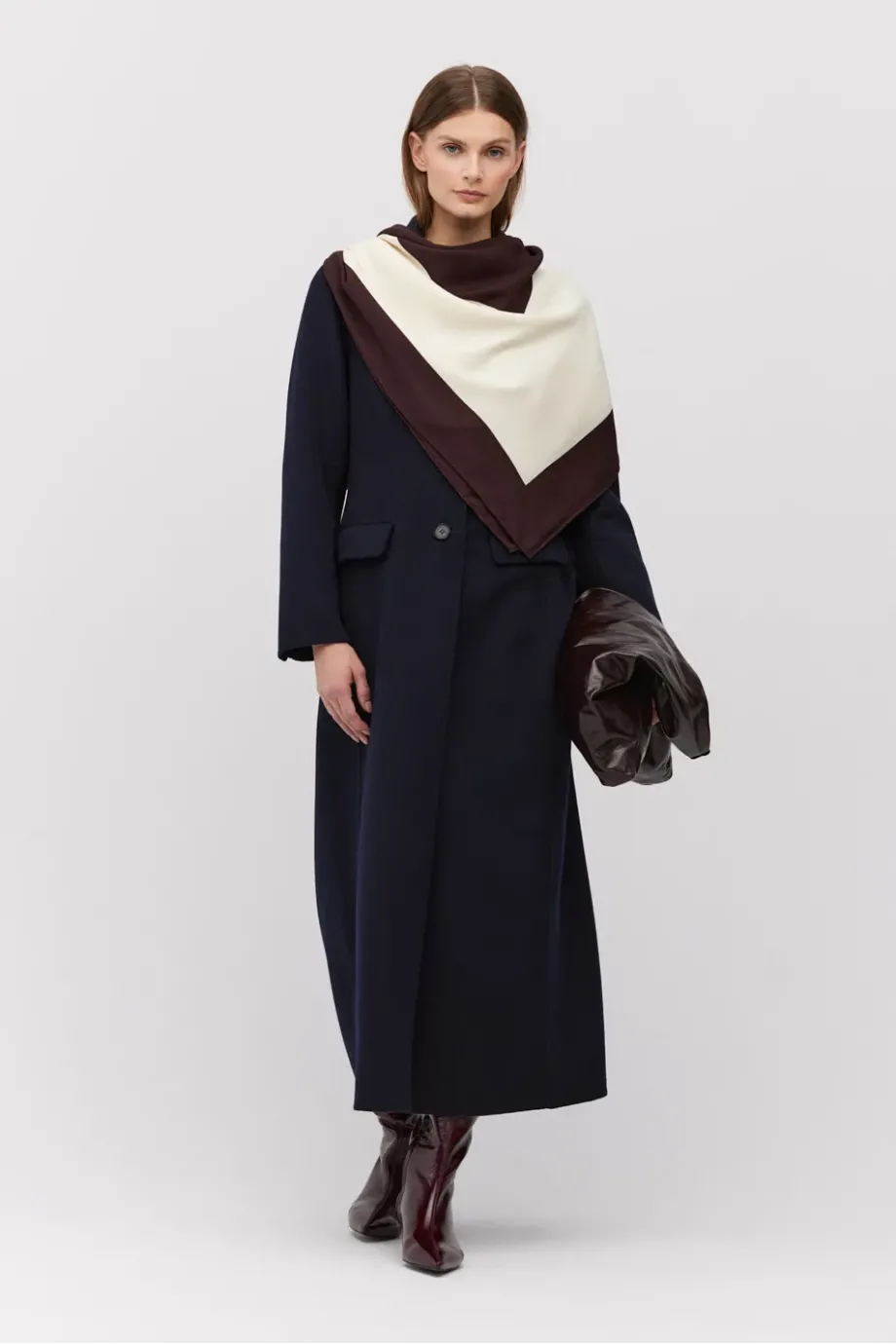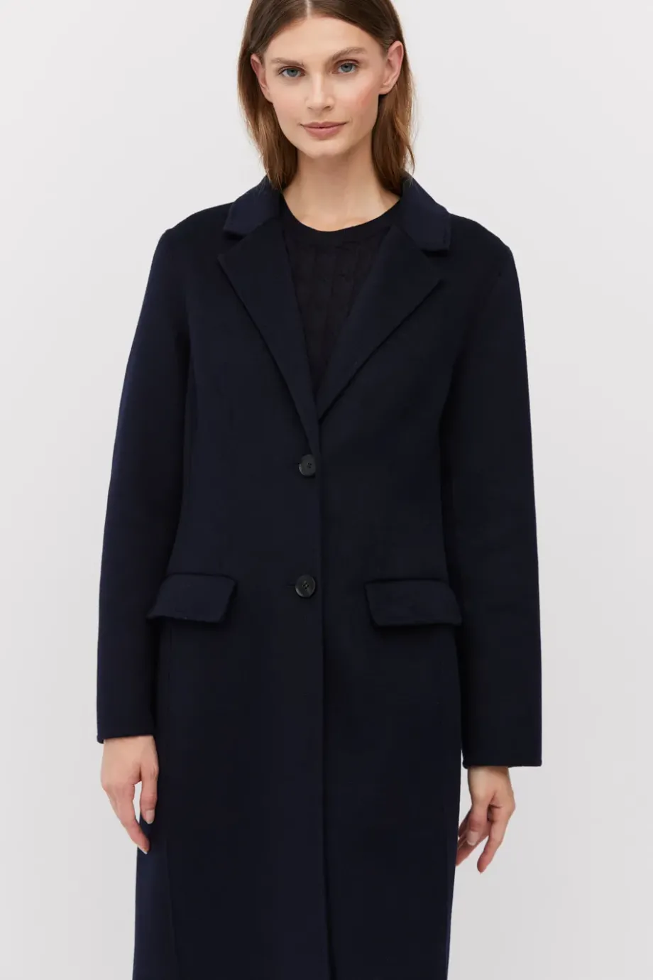 Palton cu un singur rând de nasturi, cu croială simplă, confecționat din țesătură double-face — amestec de lână și mătase. Lungime maxi. Guler clasic, buzunare, șliț la spate. Închidere cu nasturi. Model lejer, elegant. Necăptușit, finisat manual.