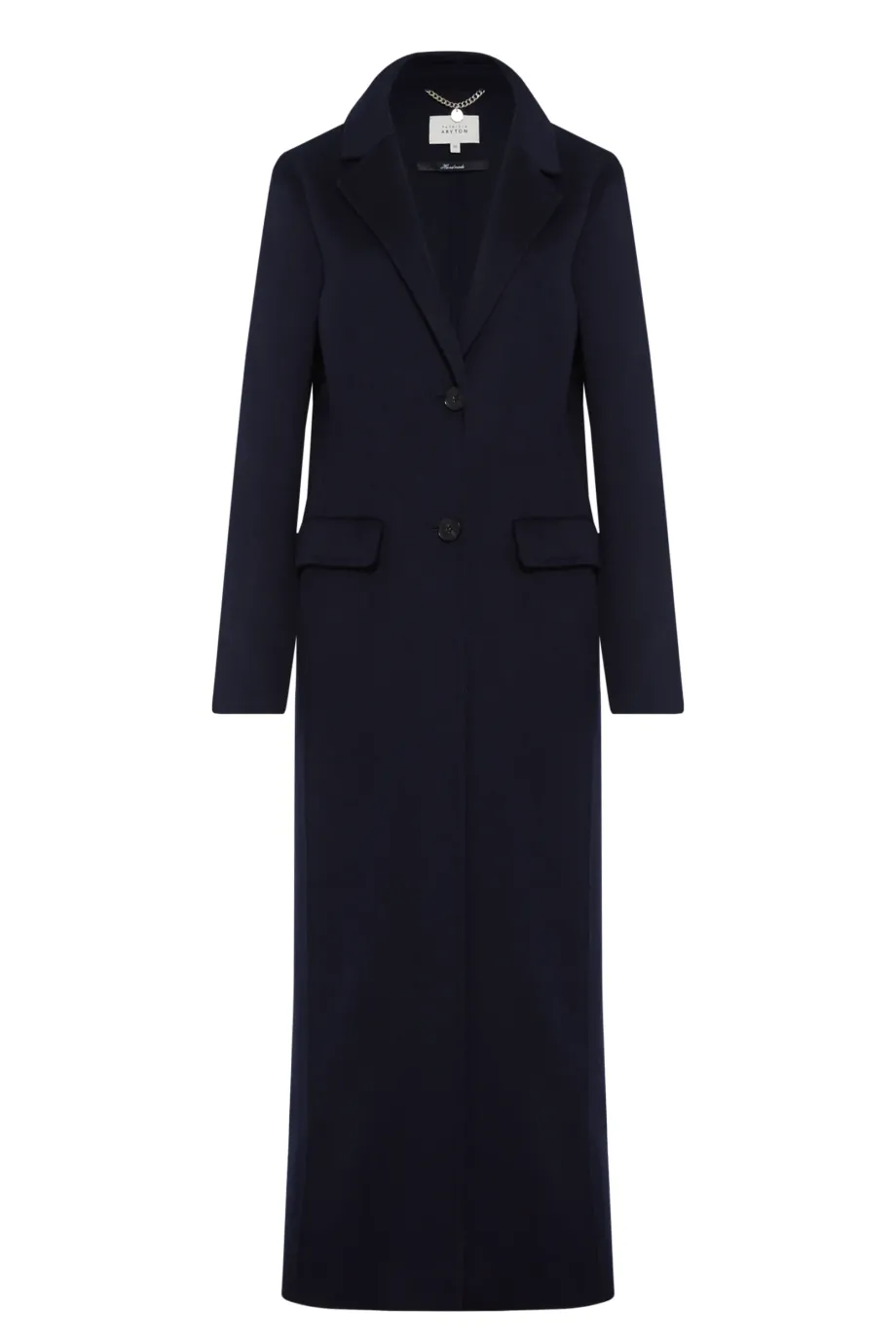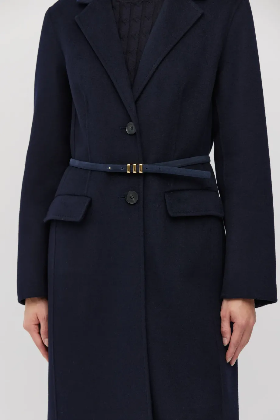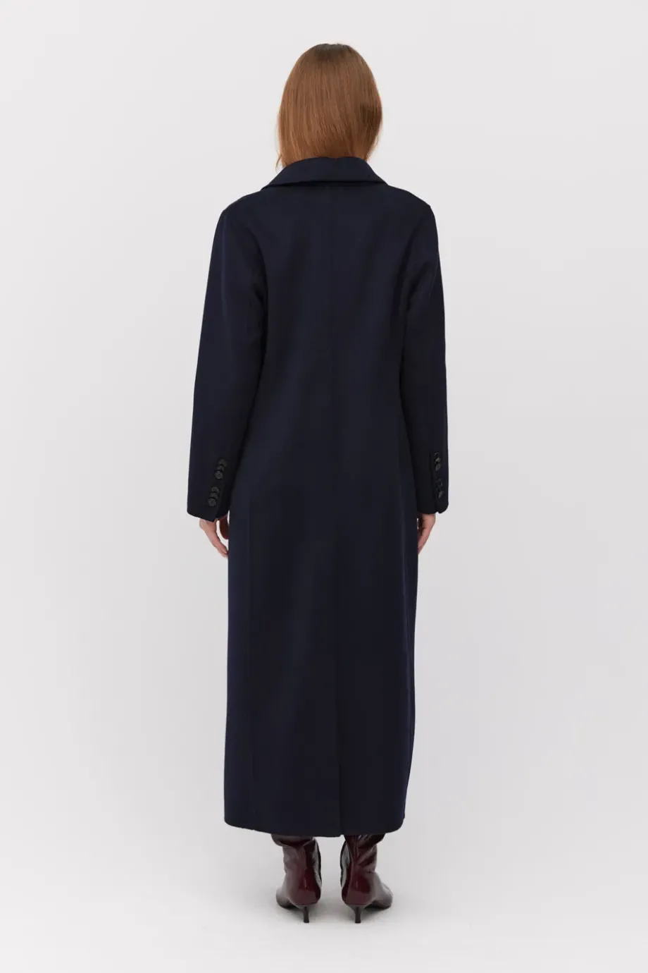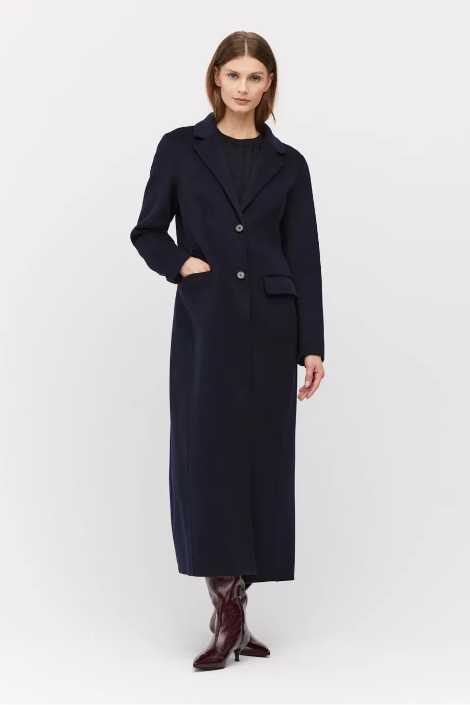 Palton cu un singur rând de nasturi, cu croială simplă, confecționat din țesătură double-face — amestec de lână și mătase. Lungime maxi. Guler clasic, buzunare, șliț la spate. Închidere cu nasturi. Model lejer, elegant. Necăptușit, finisat manual.