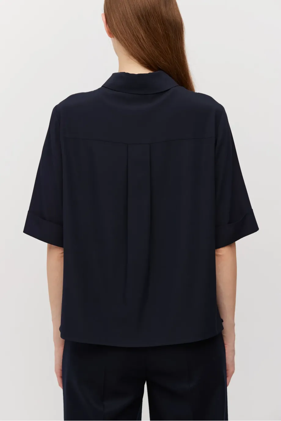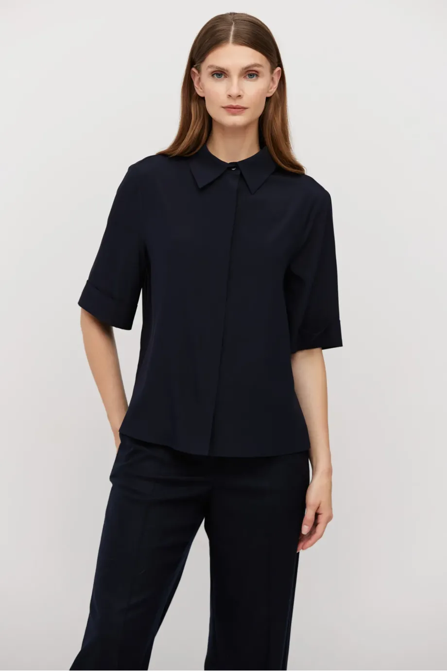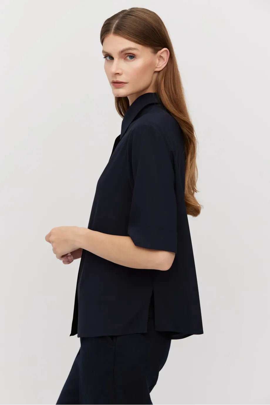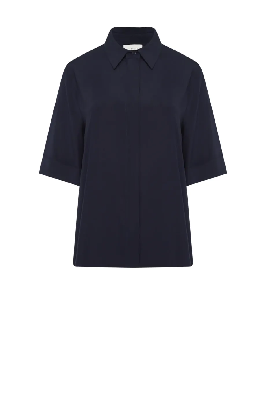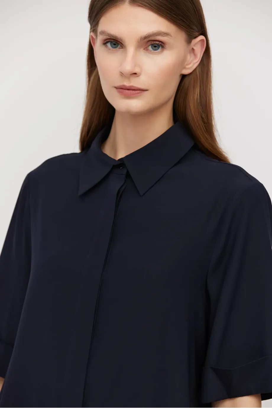 Cămașă albastru royal închis din mătase, cu croială lejeră și fluidă. Guler clasic, mâneci scurte și închidere cu nasturi.