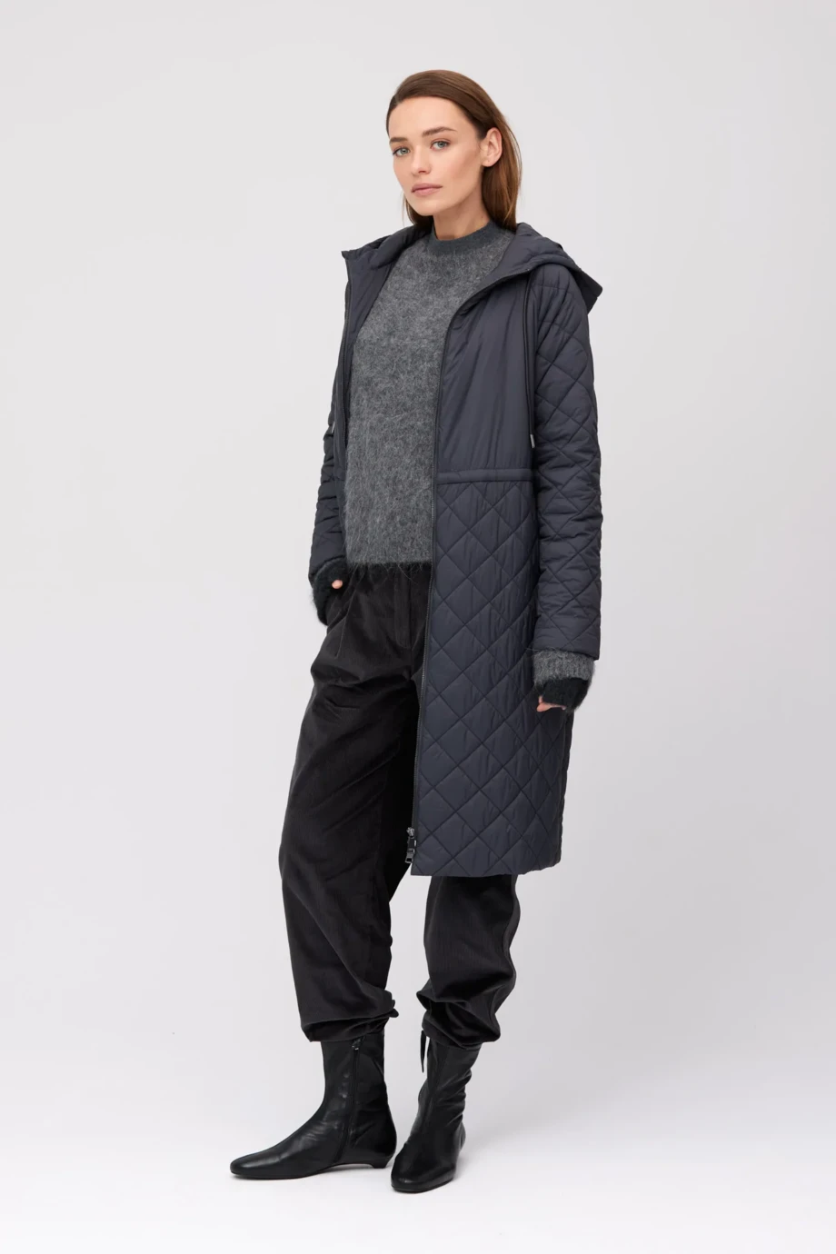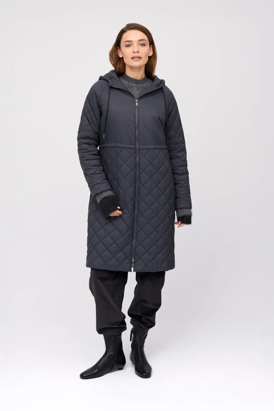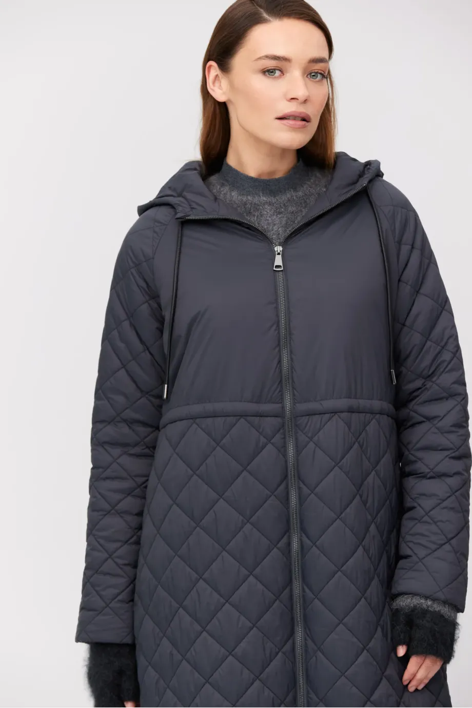 Geacă midi cu glugă, cu umplutură din lână de cămilă. Croială lejeră, închidere cu fermoar, glugă reglabilă și buzunare. Culoare gri închis.