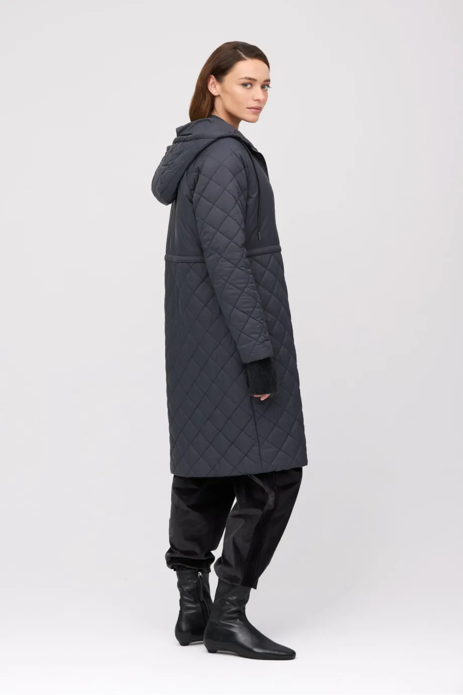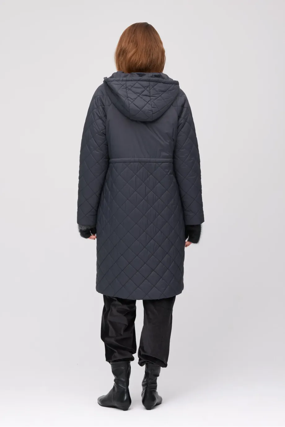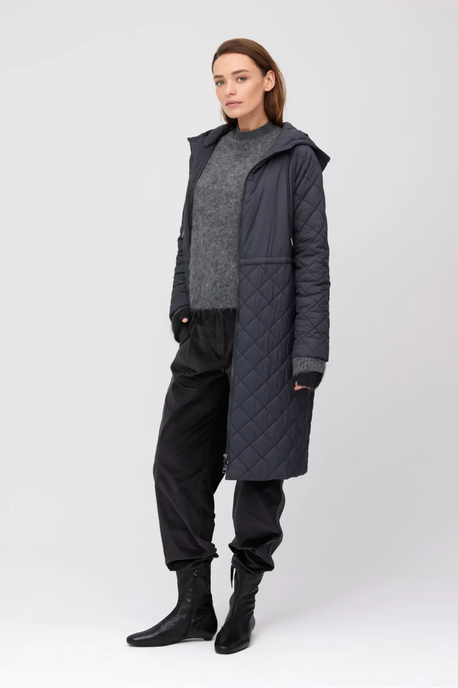 Geacă midi cu glugă, cu umplutură din lână de cămilă. Croială lejeră, închidere cu fermoar, glugă reglabilă și buzunare. Culoare gri închis.