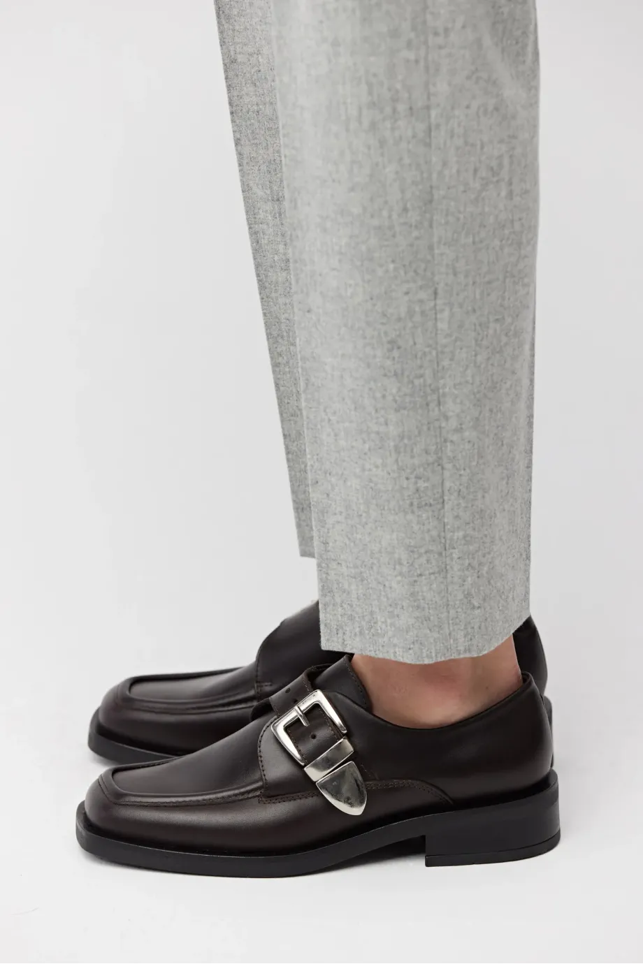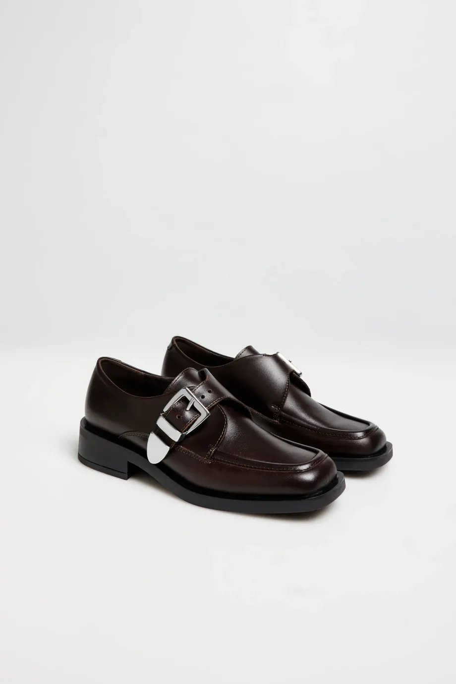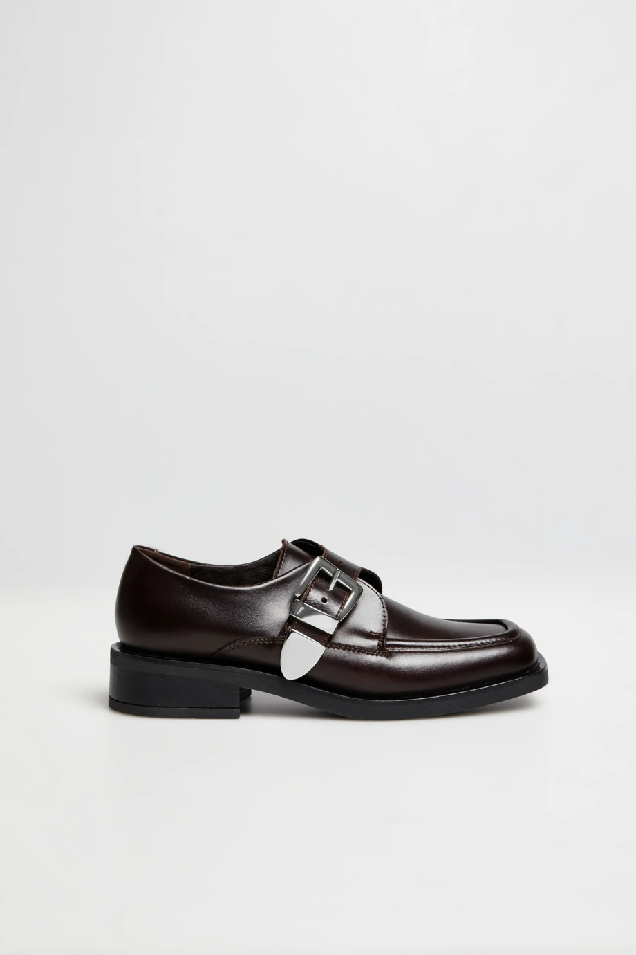 Pantofi maro, stil "monk", din piele naturală, cu cataramă. Vârf pătrat. Cusături manualee, confecționați într-un atelier din Portugalia.