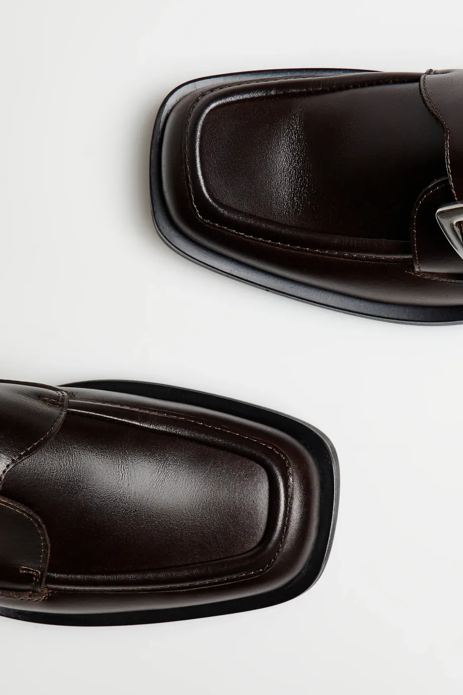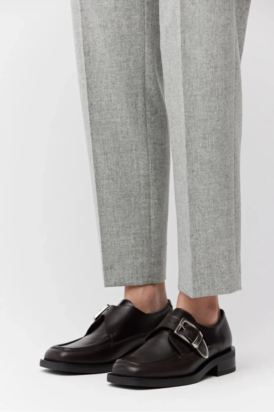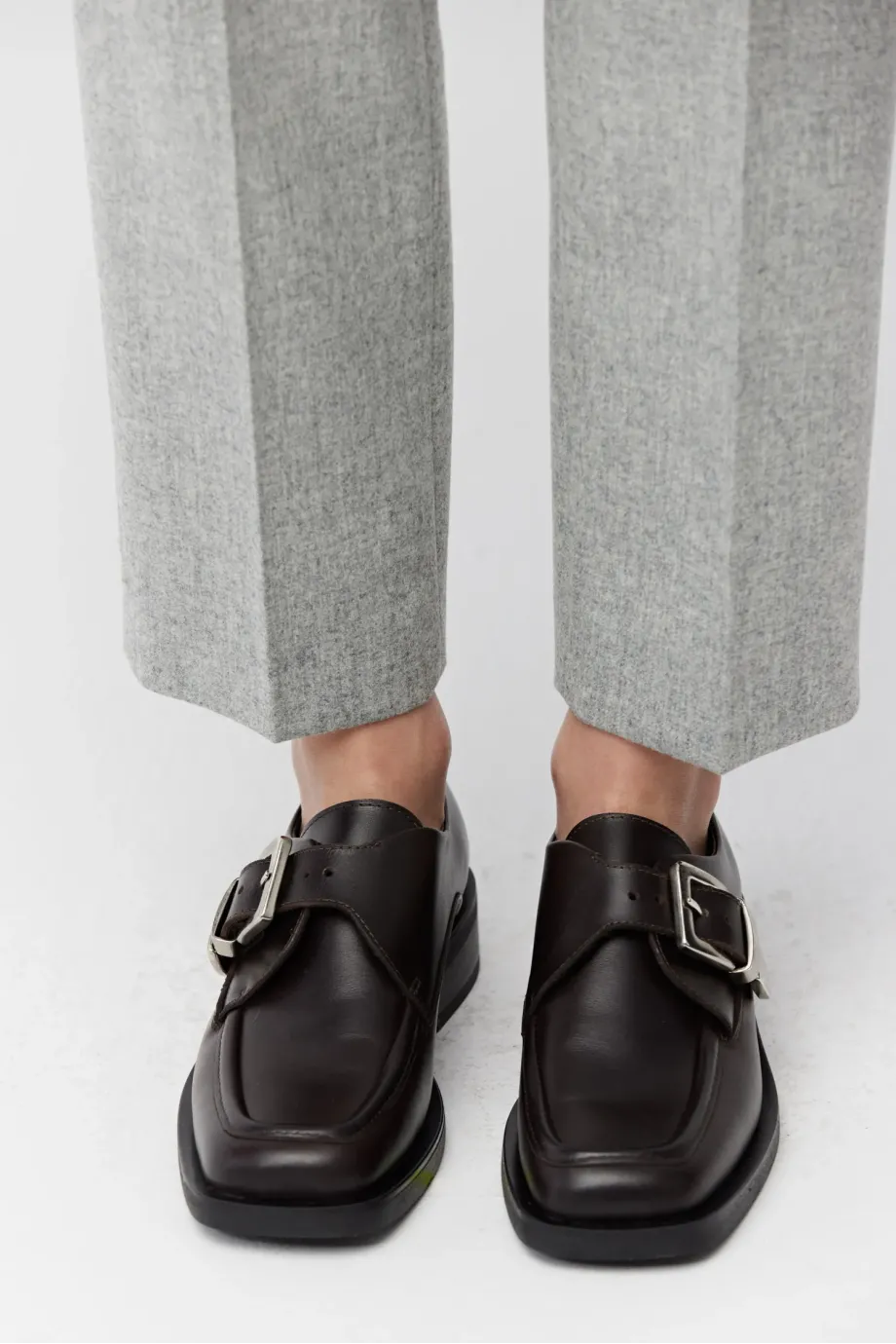 Pantofi maro, stil "monk", din piele naturală, cu cataramă. Vârf pătrat. Cusături manualee, confecționați într-un atelier din Portugalia.