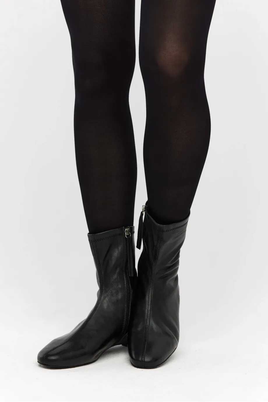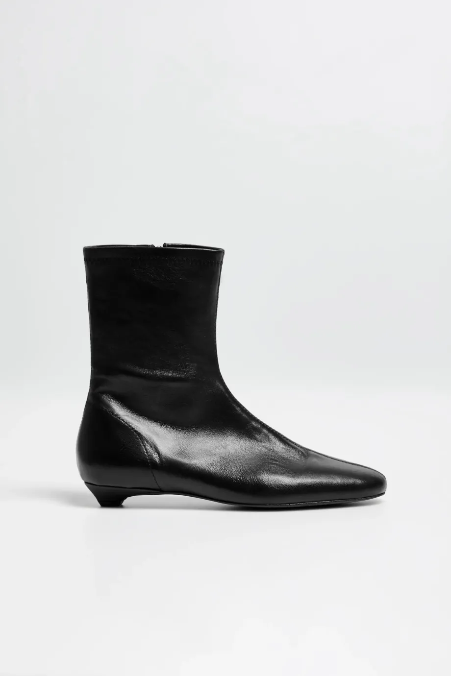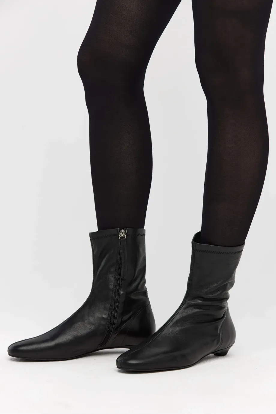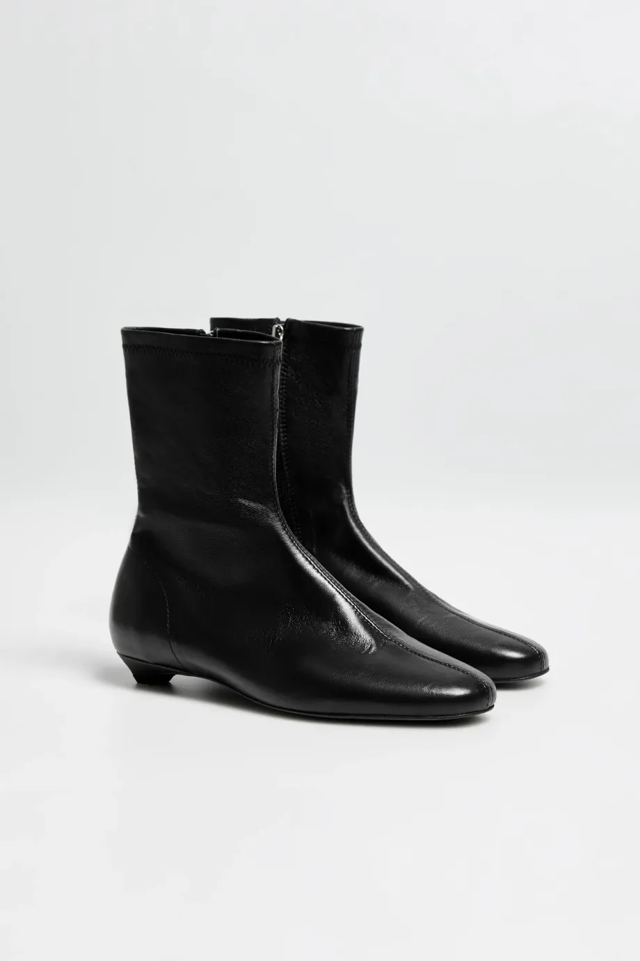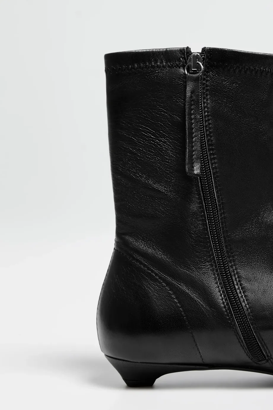 Botine negre, până la gleznă, din piele naturală foarte moale. Confecționat manual într-un atelier polonez. Croi clasic, cu partea superioară dreaptă și vârf rotund, închidere cu fermoar și toc mic — design minimalist.