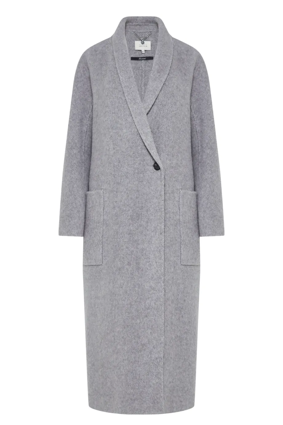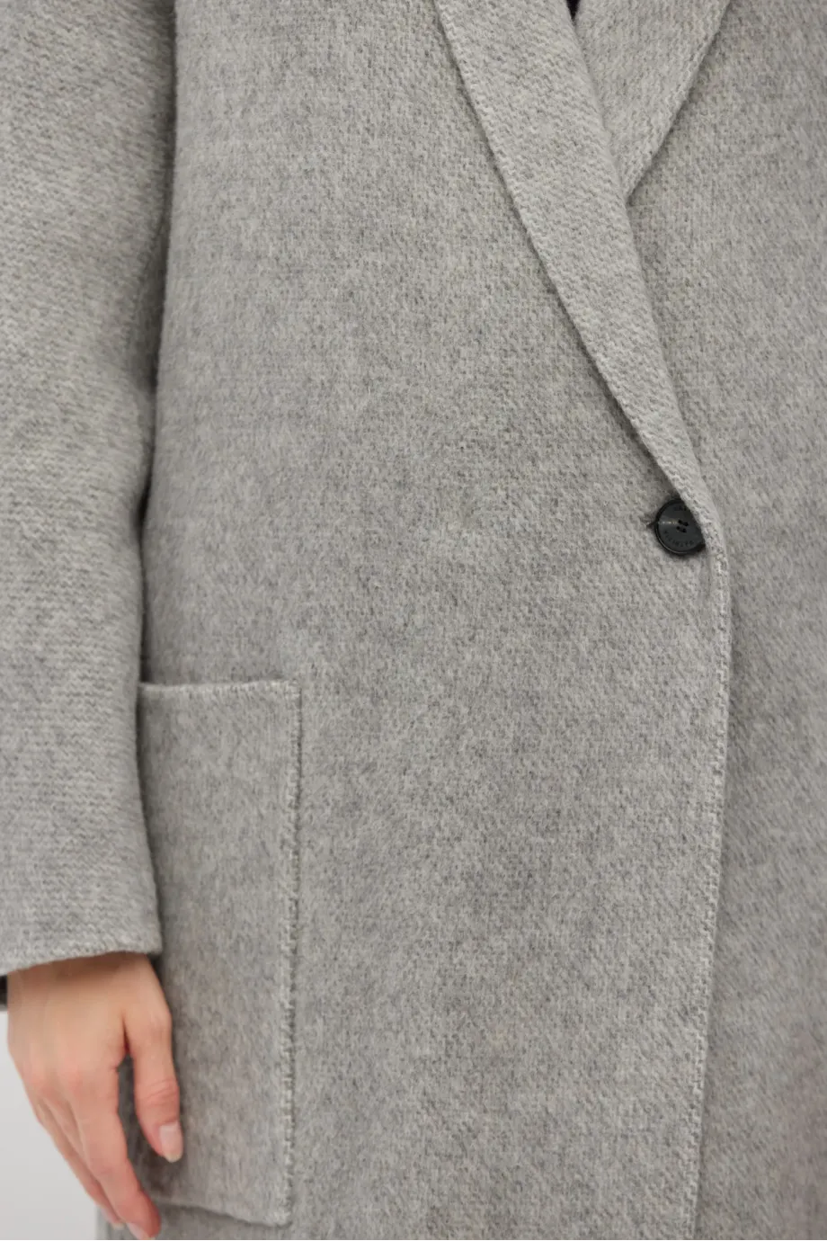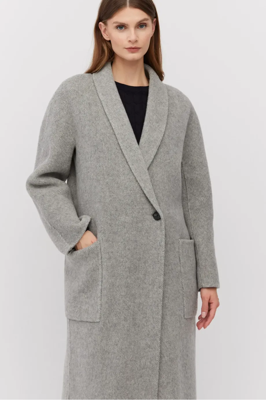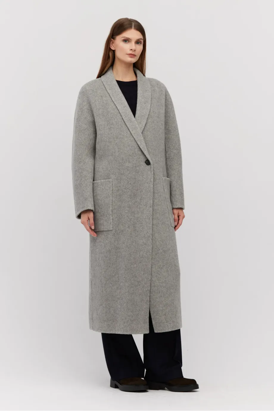 Pardesiu lung dublu din amestec de lână alpaca gri deschis, cu model în spic de hering. Guler tip eșarfă, buzunare aplicate și închidere cu nasturi. Călduros.