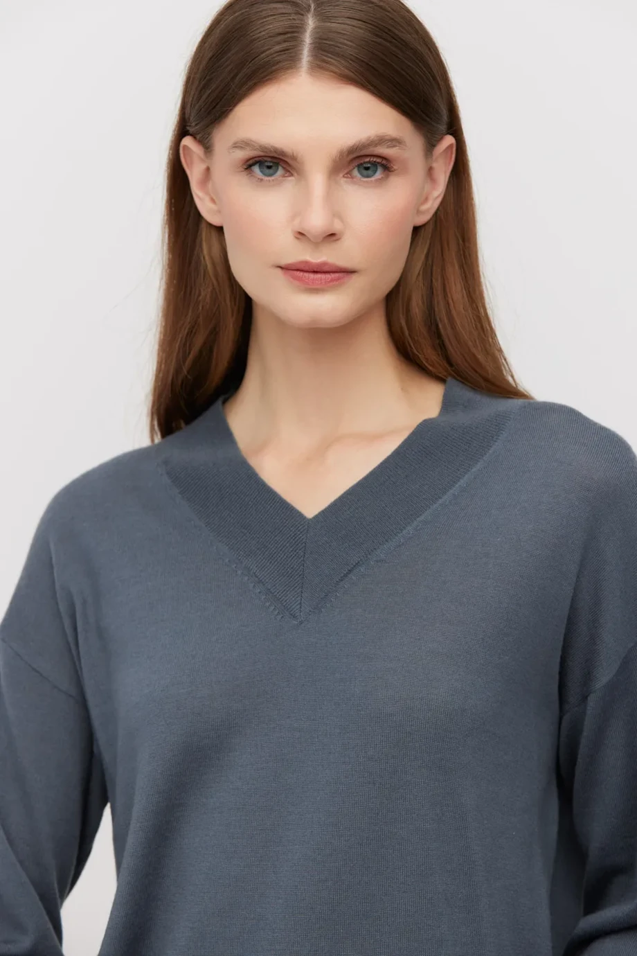 Bluză gri-închis din lână merinos, cu decolteu în V. Tricot fin single-jersey (16 GG), cu mânecă lungă și croi clasic.