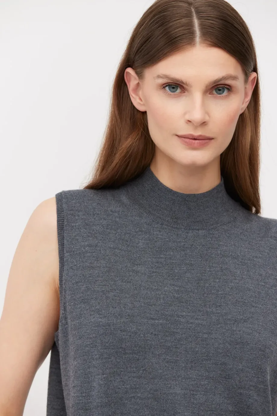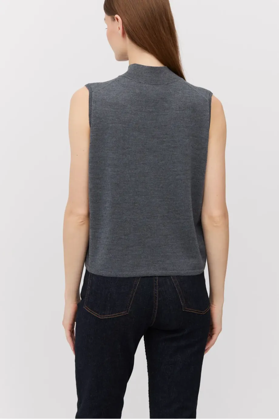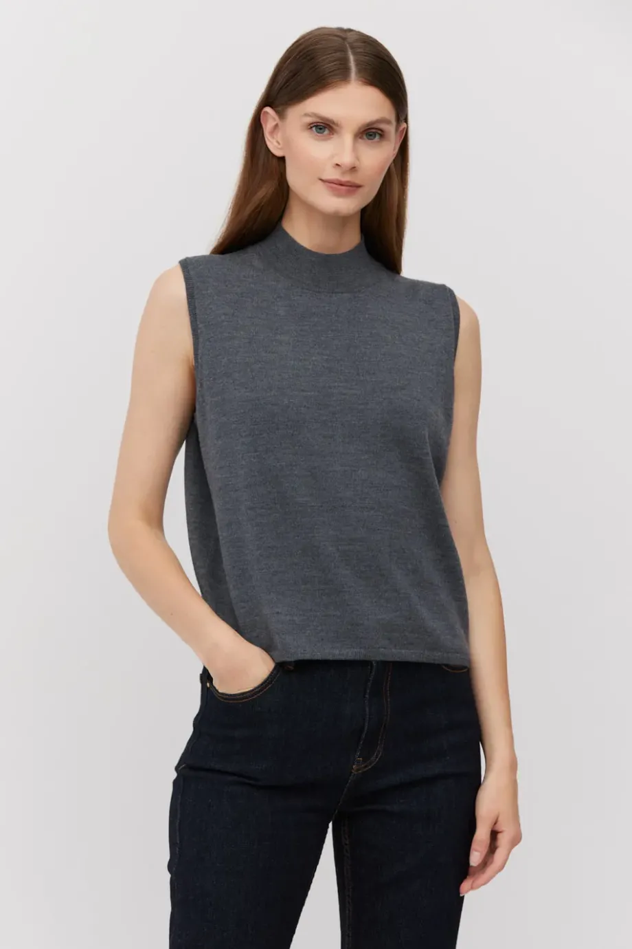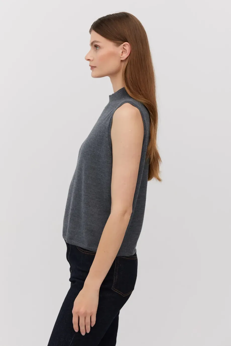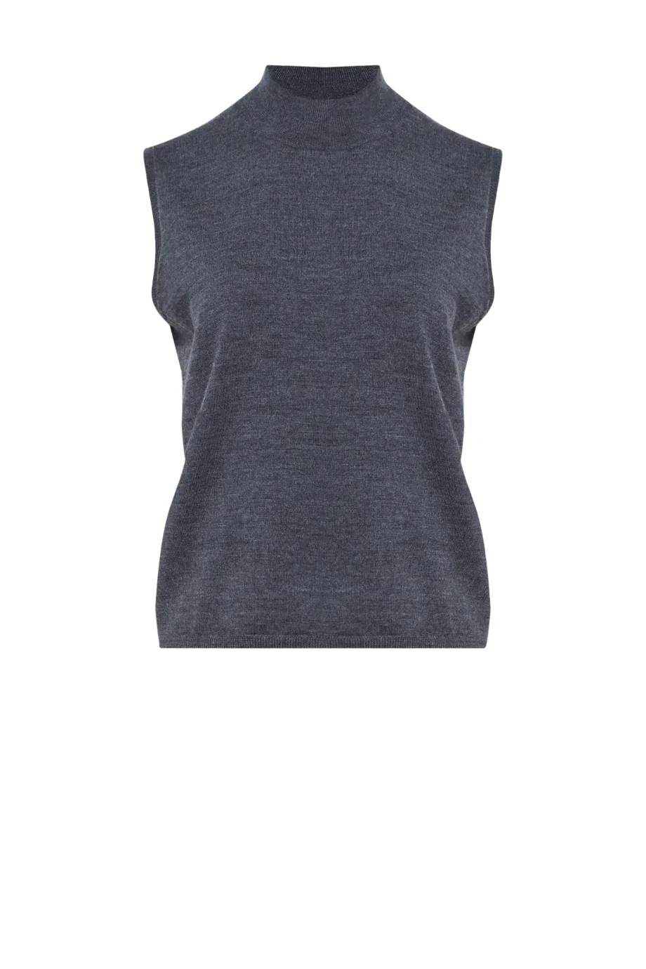 Bluză tip vestă gri închis fără mânecă, cu guler înalt, din lână merinos. Tricotat dens în punct single jersey pe mașină de 14 GG. Disponibil în două culori.