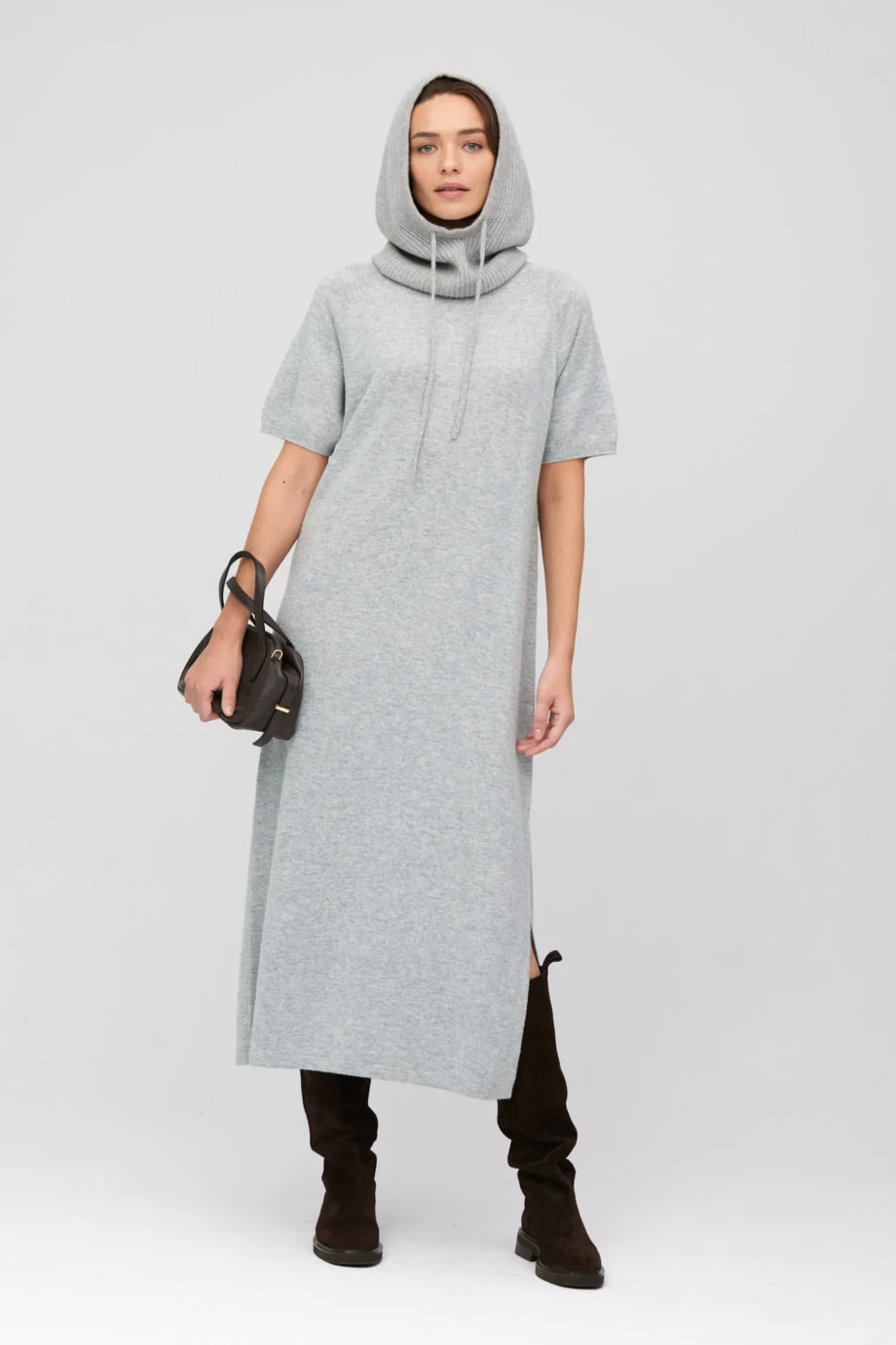 Rochie midi din lână merinos și cașmir. Croială simplă și lejeră, decolteu rotund, mânecă lungă. Tricot jersey, confecționat pe mașină 12 GG. Culoare gri deschis.