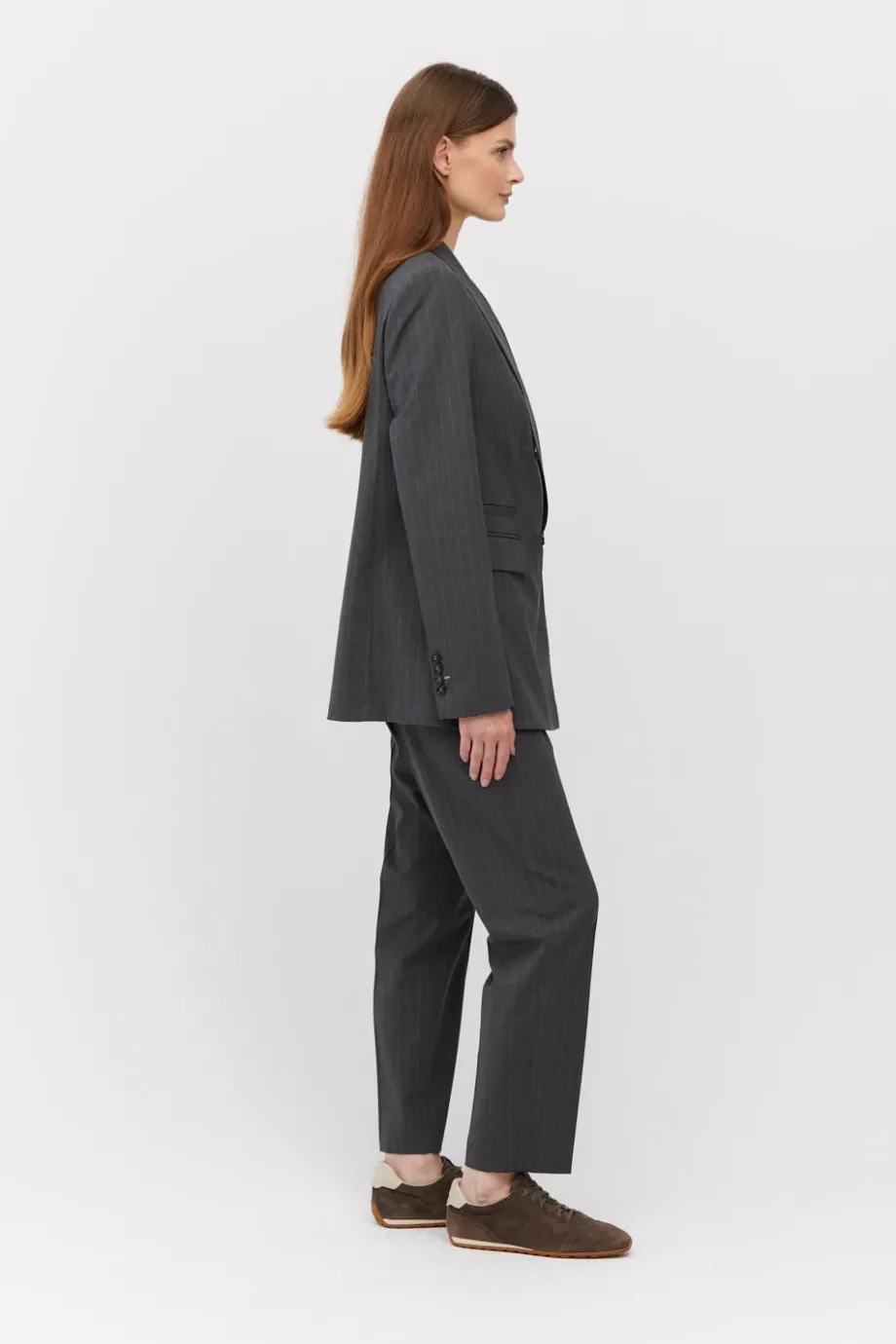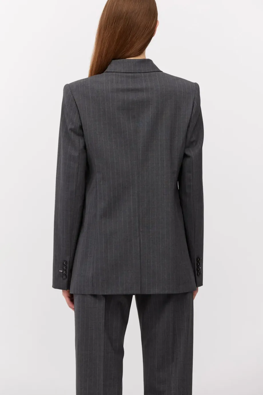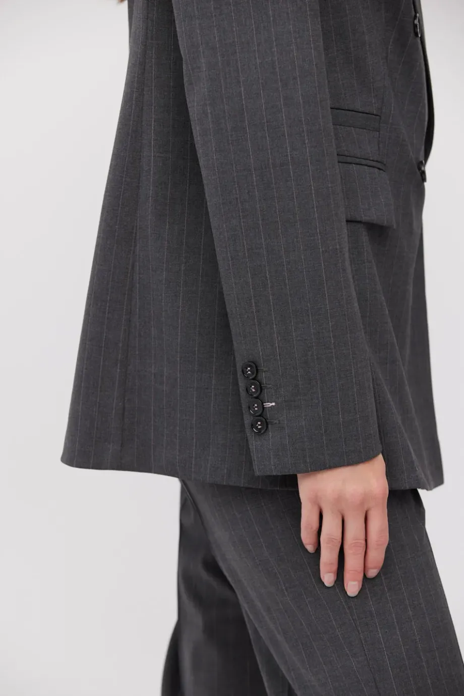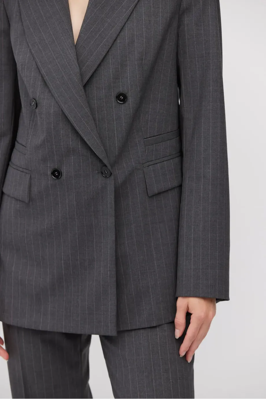 Sacou cu dungi albe, cu două rânduri de nasturi, confecționată din lână de miel, culoarea gri închis. Croială ușor cambrată, mânecă lungă, închidere cu nasturi din sidef și nasture interior din lemn de nuc corozo. Buzunare. Model căptușit, cu cusături decorative și piping pe interior.