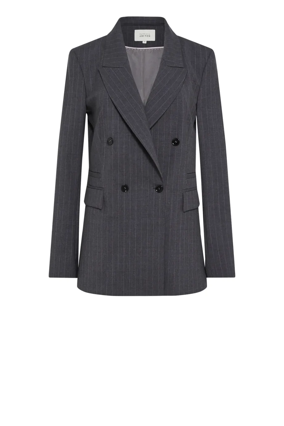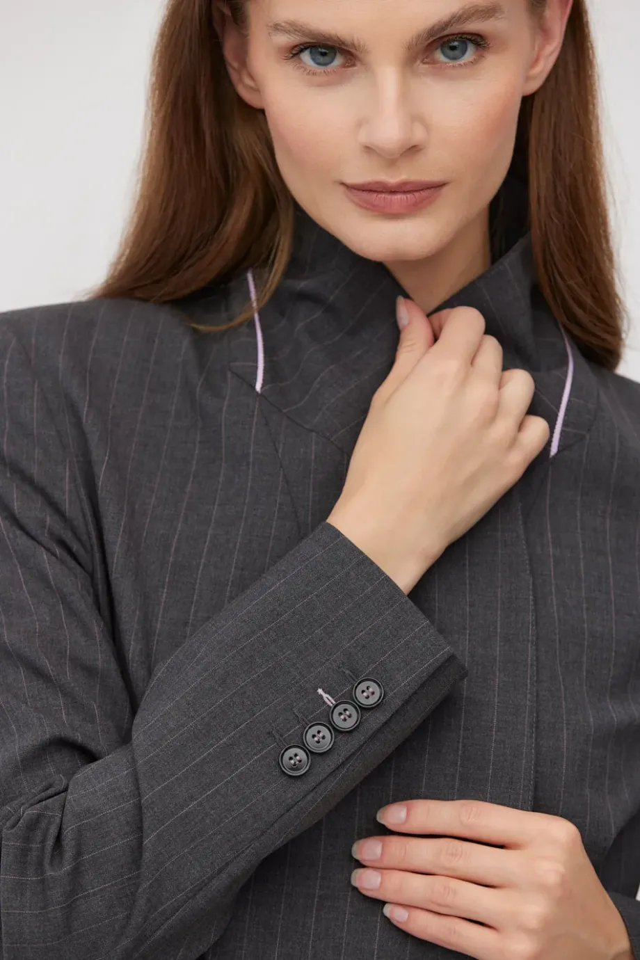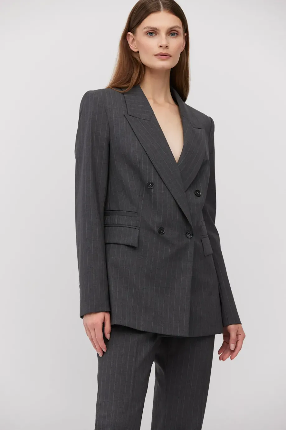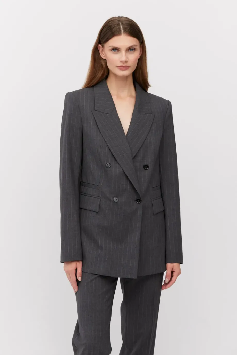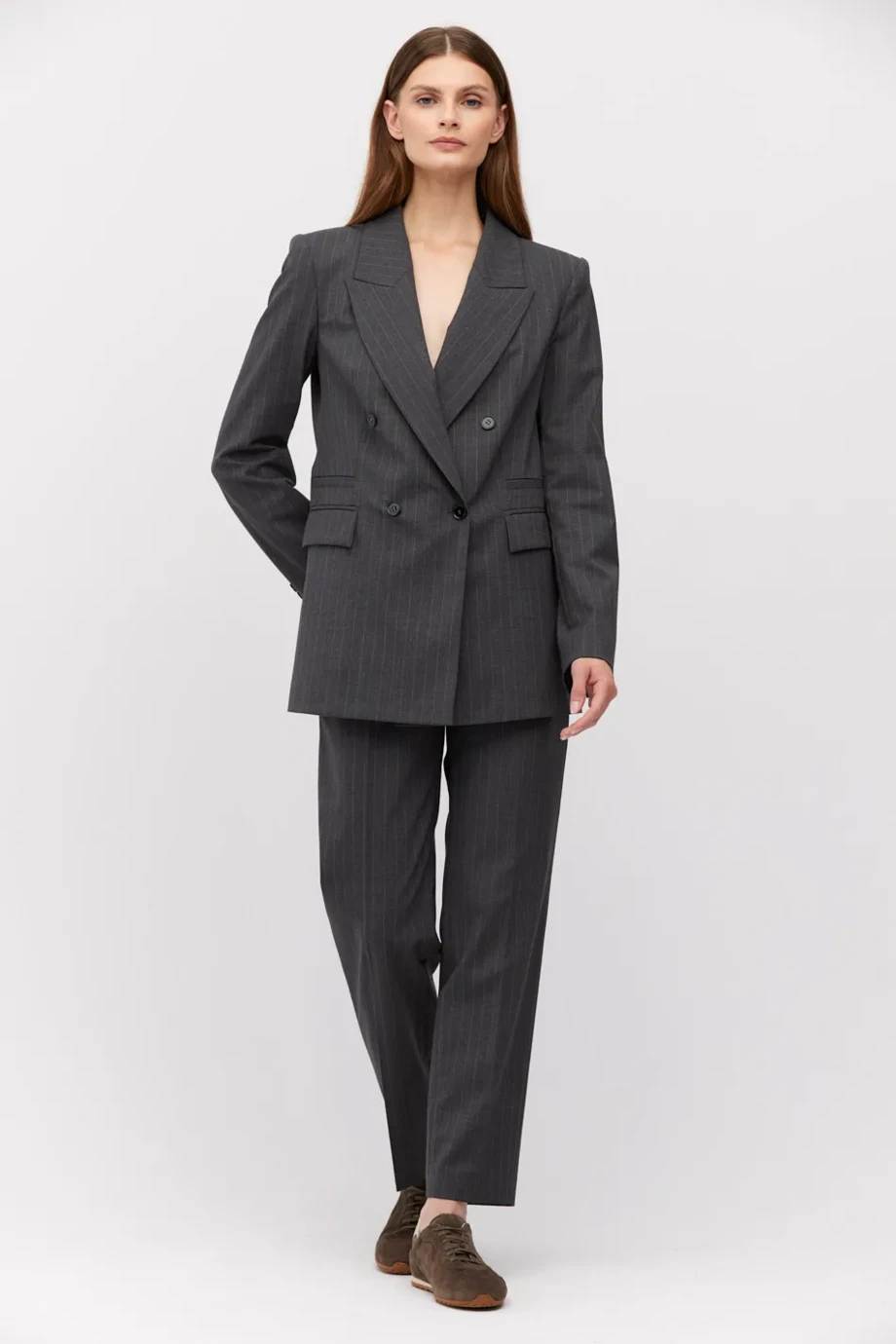 Sacou cu dungi albe, cu două rânduri de nasturi, confecționată din lână de miel, culoarea gri închis. Croială ușor cambrată, mânecă lungă, închidere cu nasturi din sidef și nasture interior din lemn de nuc corozo. Buzunare. Model căptușit, cu cusături decorative și piping pe interior.
