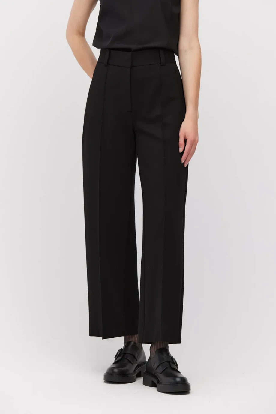 Pantaloni negri cu talie înaltă. Croială pantalonului largă la bază, cu pliuri pe picior. Buzunare laterale cu fermoar și garnitură decorativă la interior. Găici pentru curea. Închidere cu fermoar ascuns, cârlig și nasture interior din lemn natural de nuc corozo.