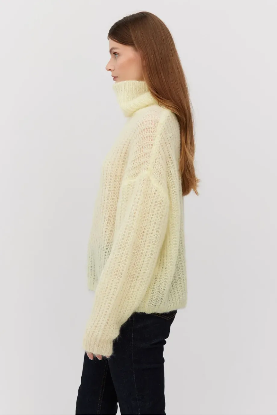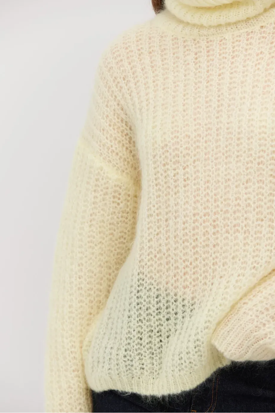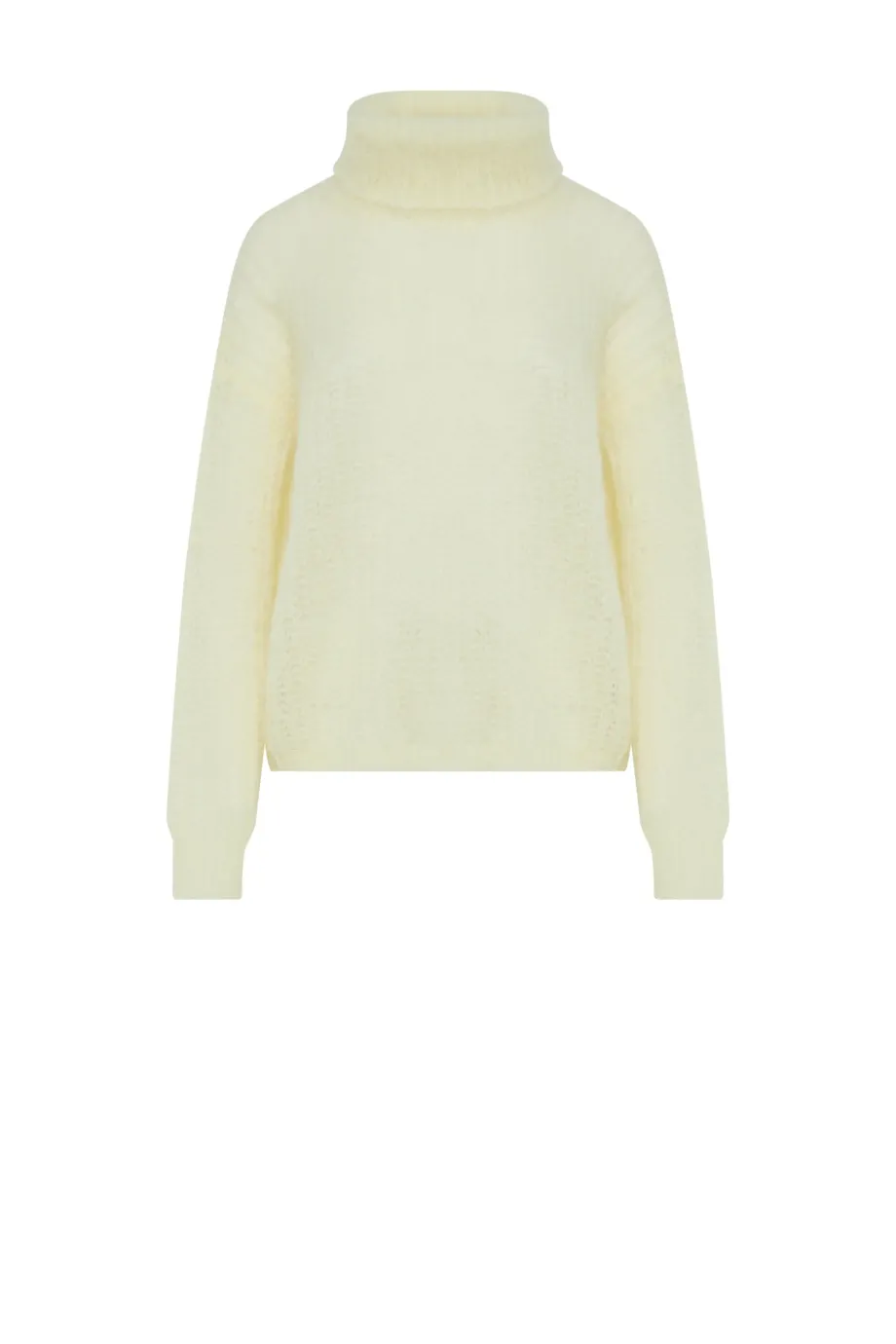 Pulover cu guler înalt, în nuanţă de galben pastel, confecționat din baby mohair. Splot lejer half-cardigan, lucrat pe maşină cu calibru 3 GG. Croială amplă.