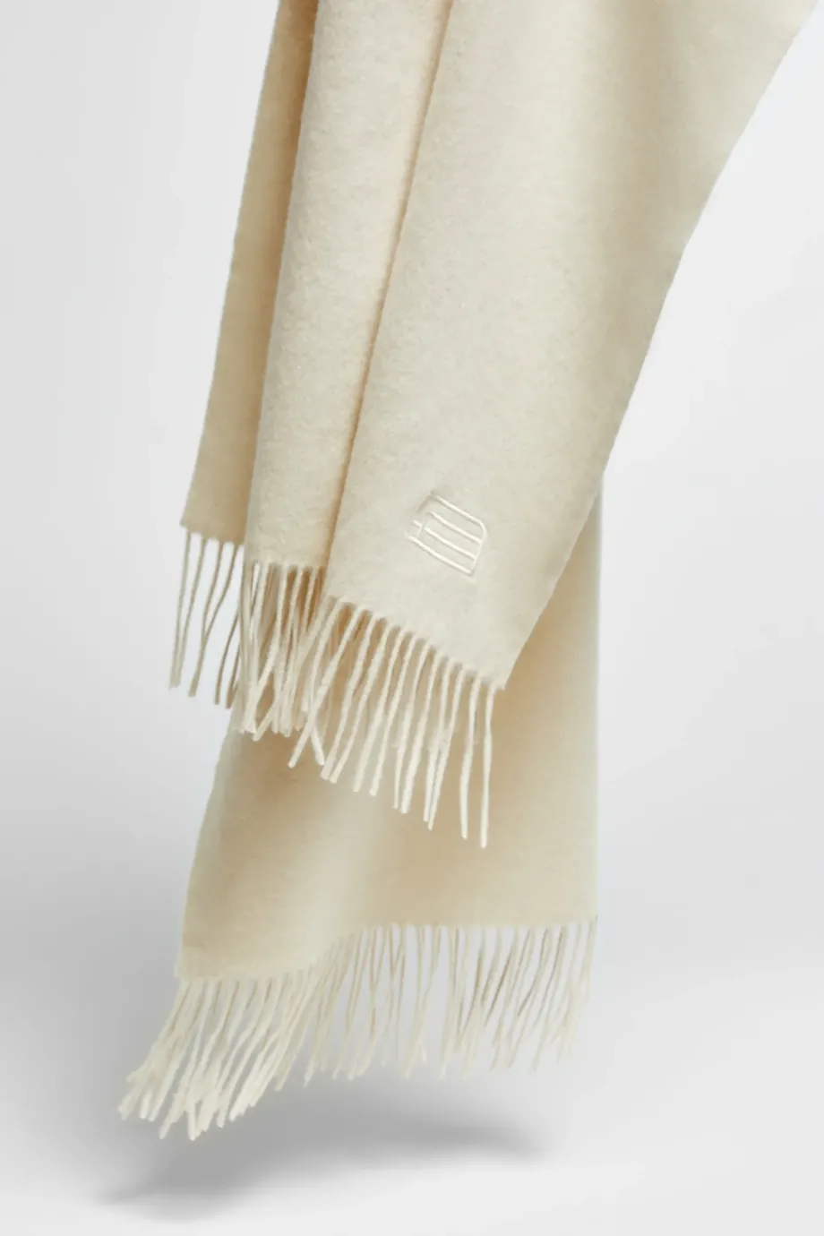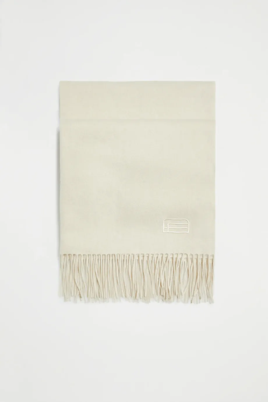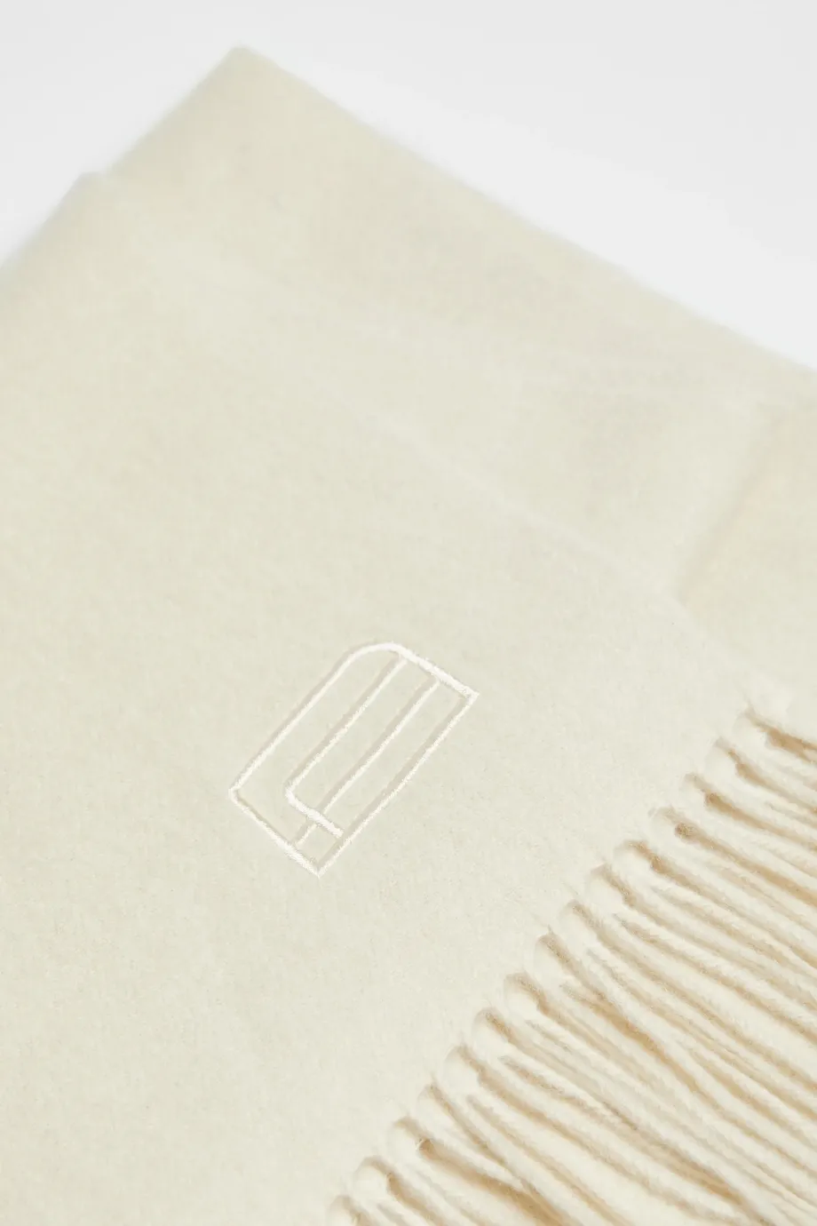 Fular alb din caşmir, cu franjuri. Moale şi delicat la atingere.